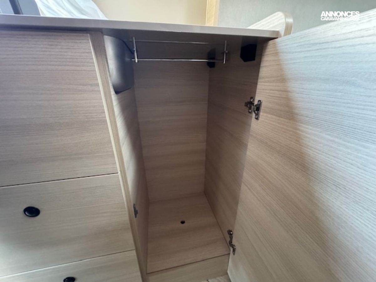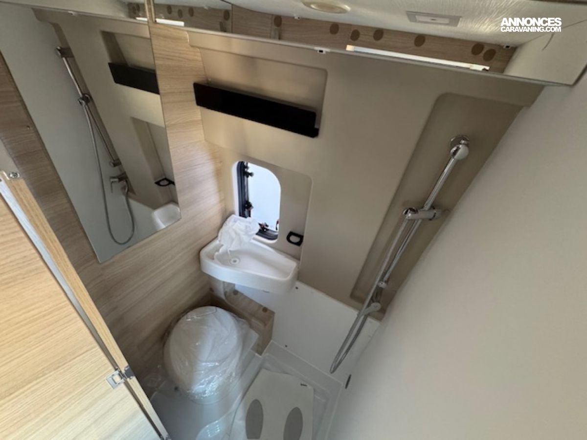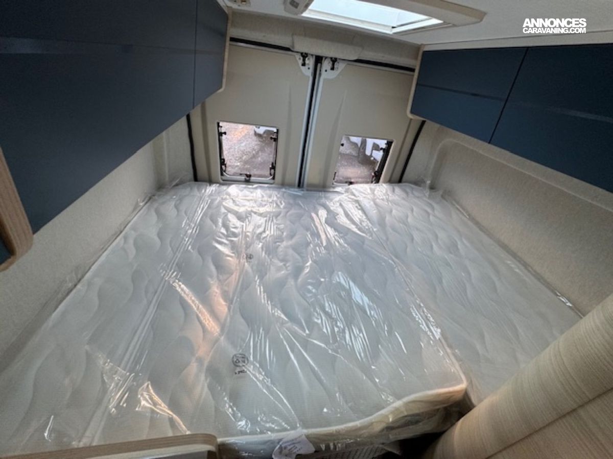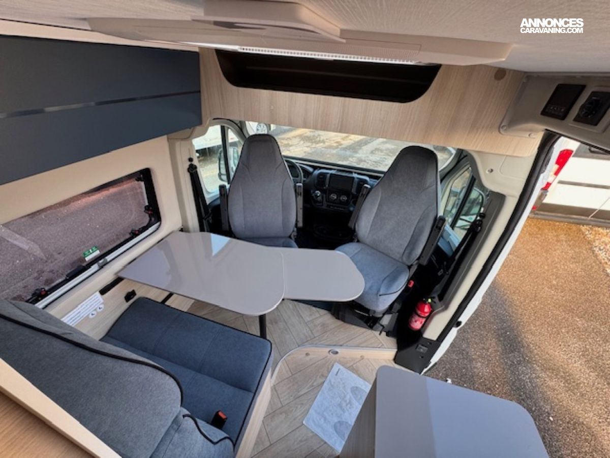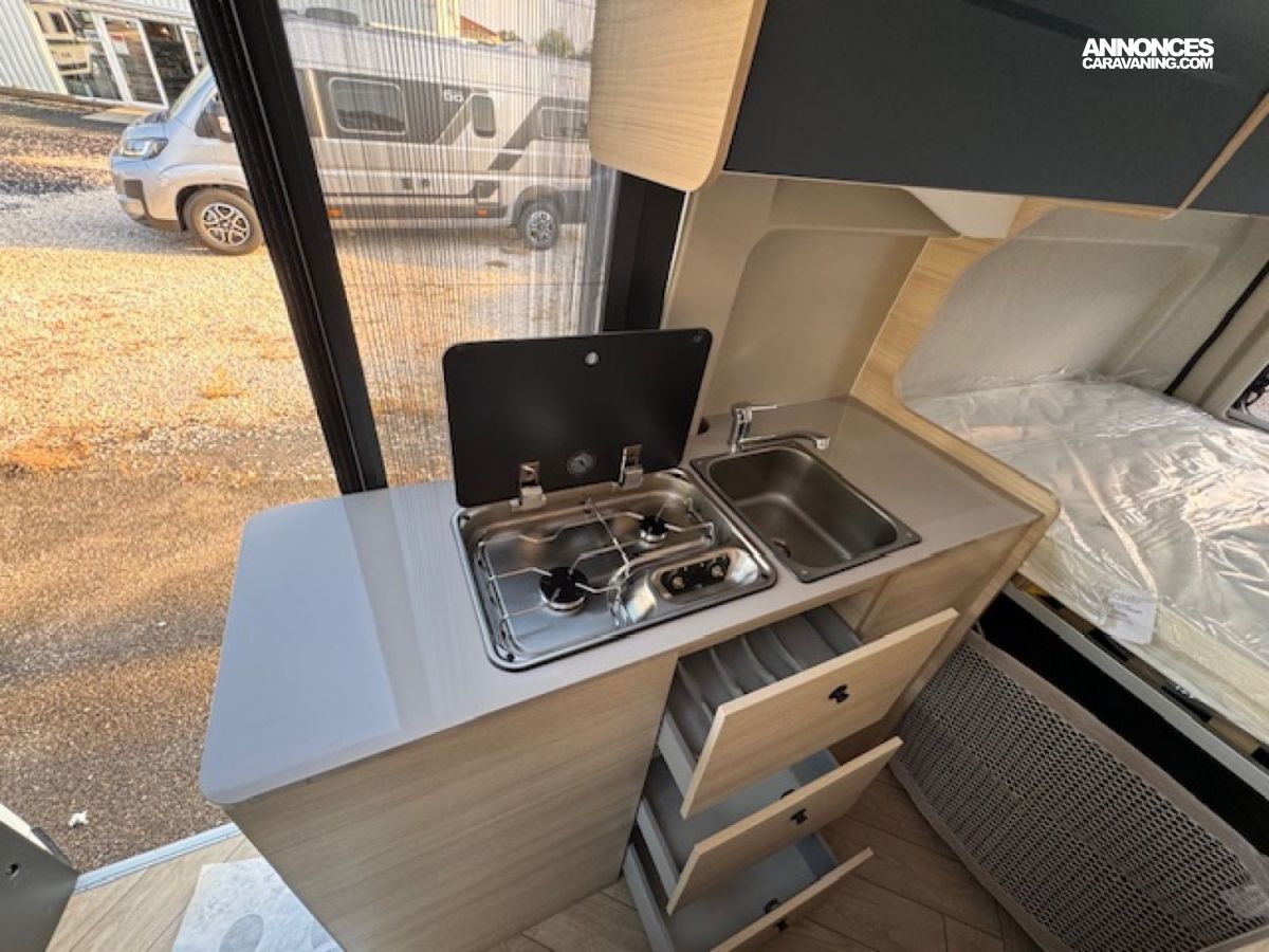 Il présente 3 vraies places couchage avec son lit arrière transversal 2 personnes (194x148) avec une penderie et un lit dînette 1 personne (156x86/50), une salle de bain douche WC, un chauffage combiné gaz Truma 4000 performant et une cuisine toute équipée !! Tout cela en 5,99 mètres de long.