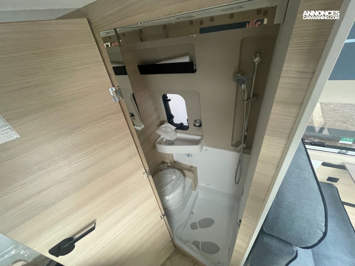 Salle d'eau avec fenêtre, Baies arrière ouvrantes, Chauffage au gaz, Marchepied électrique, Précâblage caméra de recul, Climatisation manuelle de cabine, Rétroviseurs électriques dégivrants, Eco pack FIAT, Lanterneau panoramique, Fenêtres double-vitrage avec combiné stores moustiquaire, Prises USB/USB-C, Rideaux d’isolation thermique des baies de cabine, Pneus 4 saisons, Pré-équipement TV, Jantes acier avec enjoliveurs 15'' gris, Régulateur / limiteur de vitesse, ESP