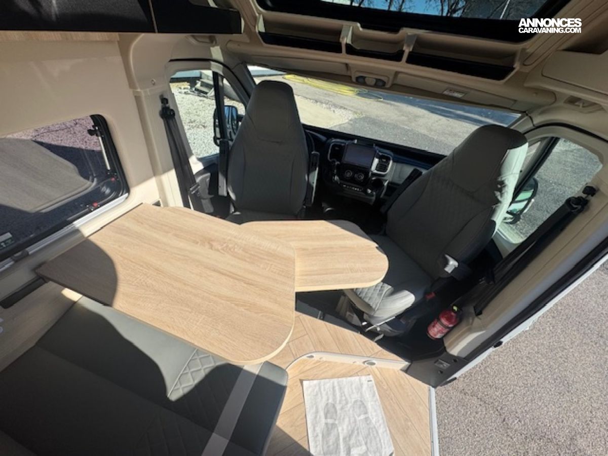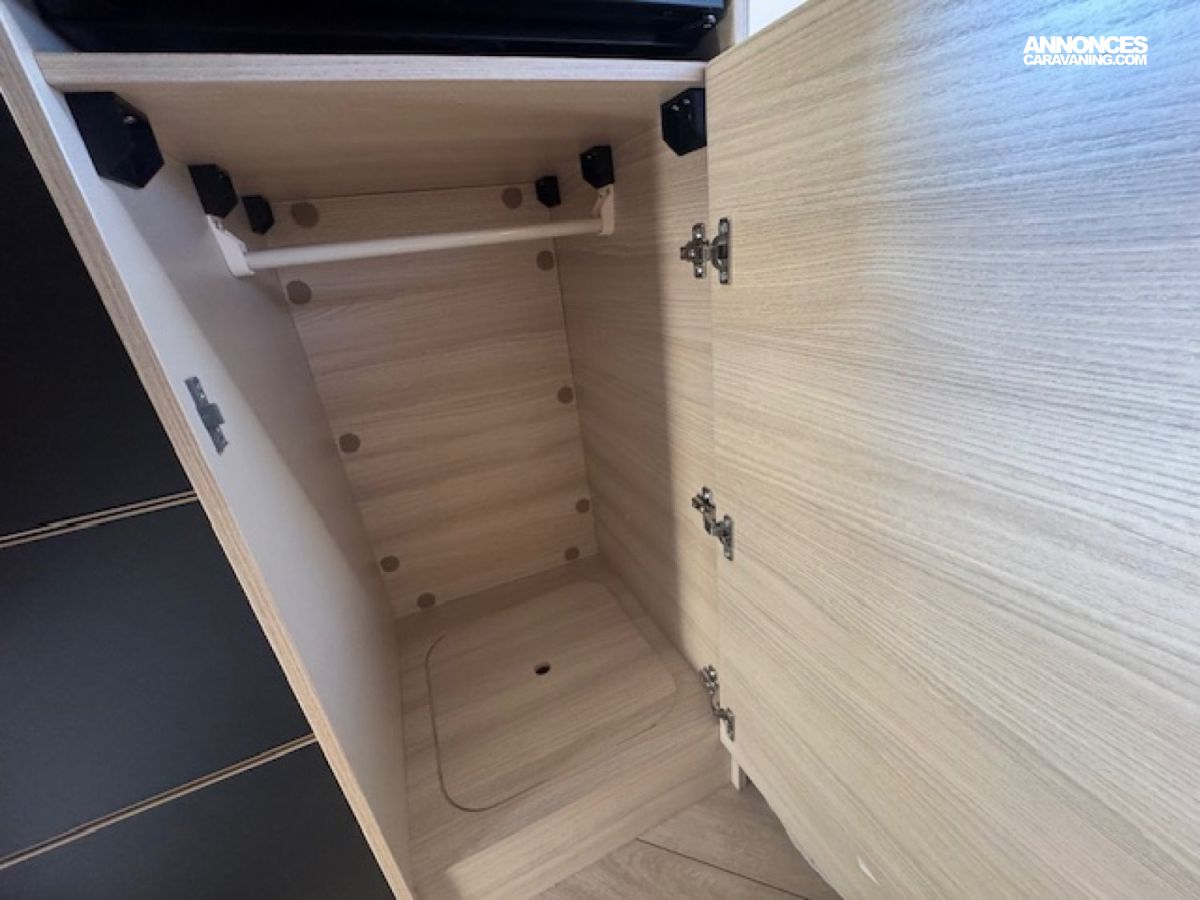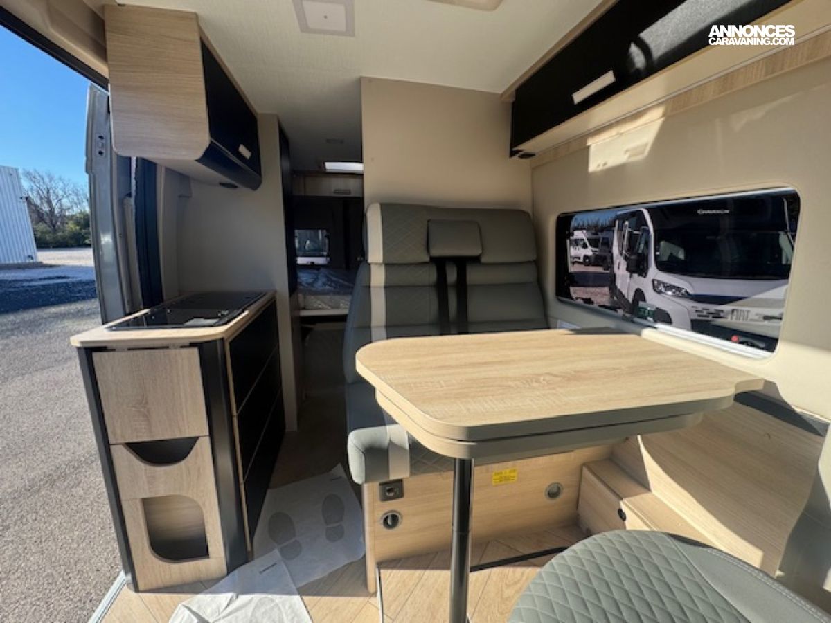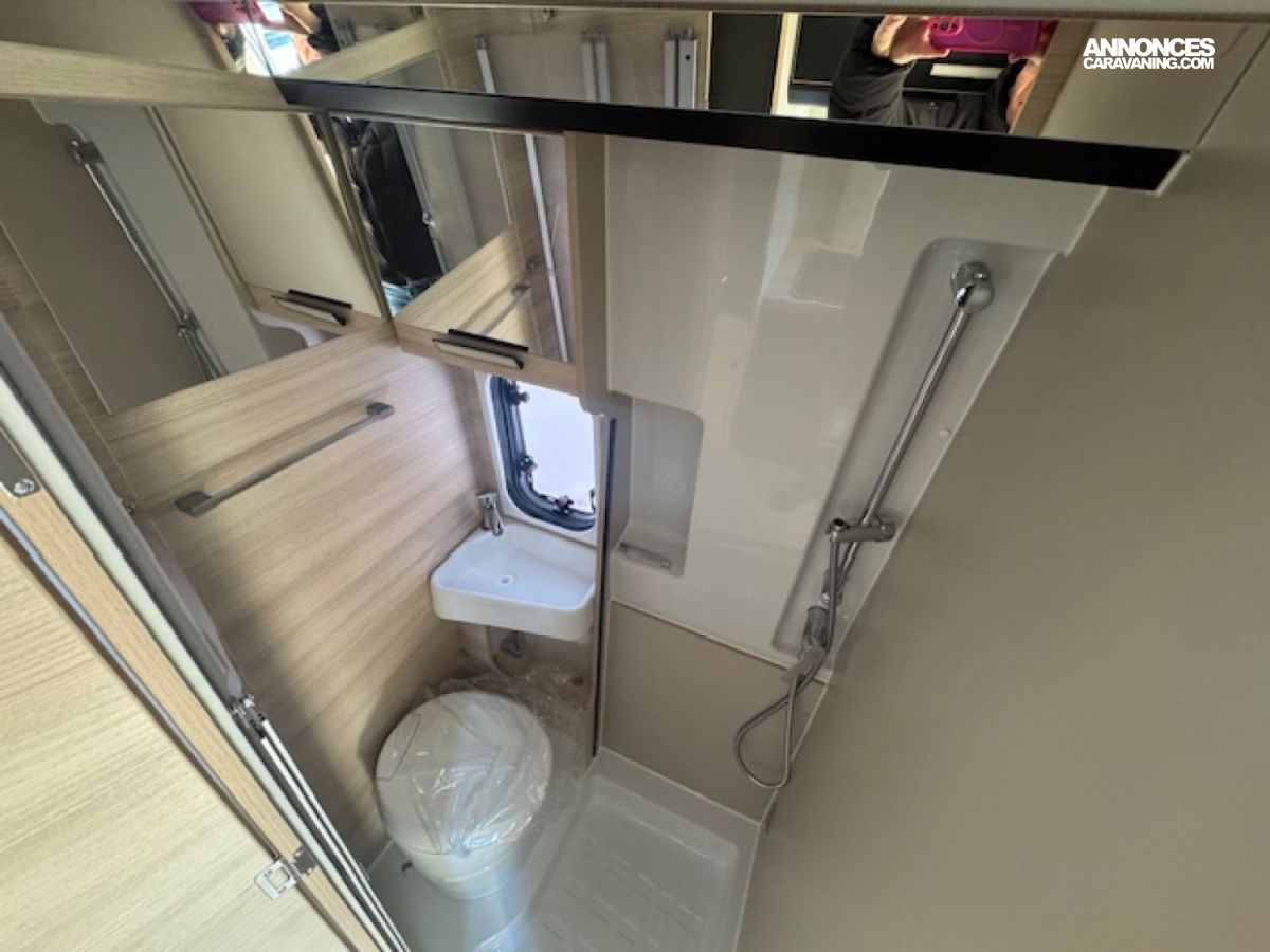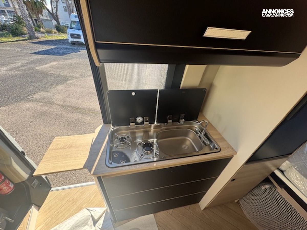 Il présente 3 vraies places couchage avec son lit arrière transversal 2 personnes (186x149) ainsi qu'un lit dinette (160x95), une salle de bain douche WC, un chauffage diesel Truma 4000 performant et une cuisine toute équipée !! Tout cela en 5,99 mètres de long.