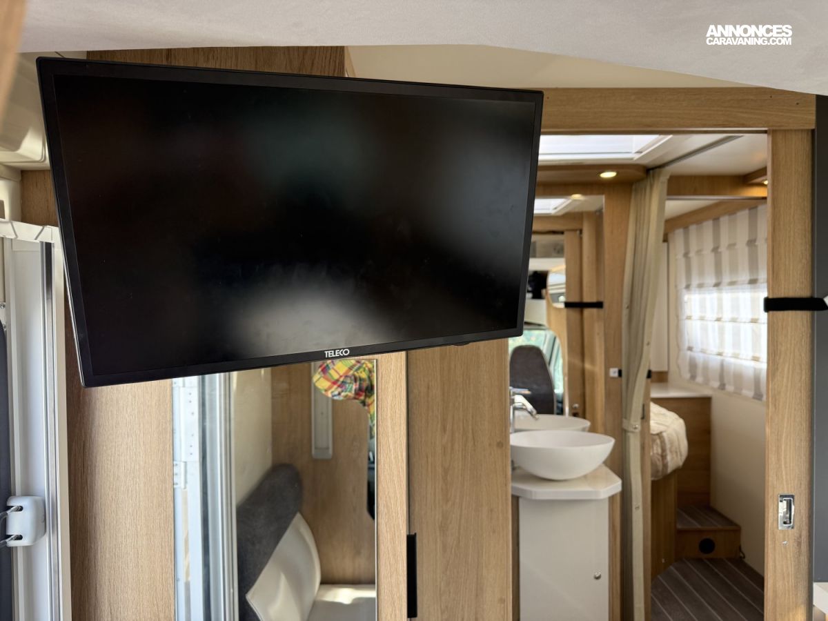 store extérieur, panneau solaire 120 W, TV connectée 22’’, antenne omnidirectionnelle, stores occultants REMIS, autoradio Bluetooth avec commandes au volant, climatisation cabine et chauffage Combi Truma pour un confort optimal.