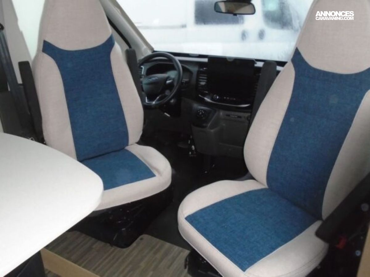 Châssis Ford transit, régulateur de vitesse avec « intelligent speed assist », allumage des phares et essuie-glace automatique, frein à main élecrique, caméra de recul, système de freinage avec atténuation de collision N2, alerte et assistance de maintien de voie, reconnaissance des panneaux de signalisation, capteurs de stationnement avant, capteur de pression des pneus, écran tactile 12 pouces avec système SYNC4, tableau de bord semi-numérique, climatisation automatique