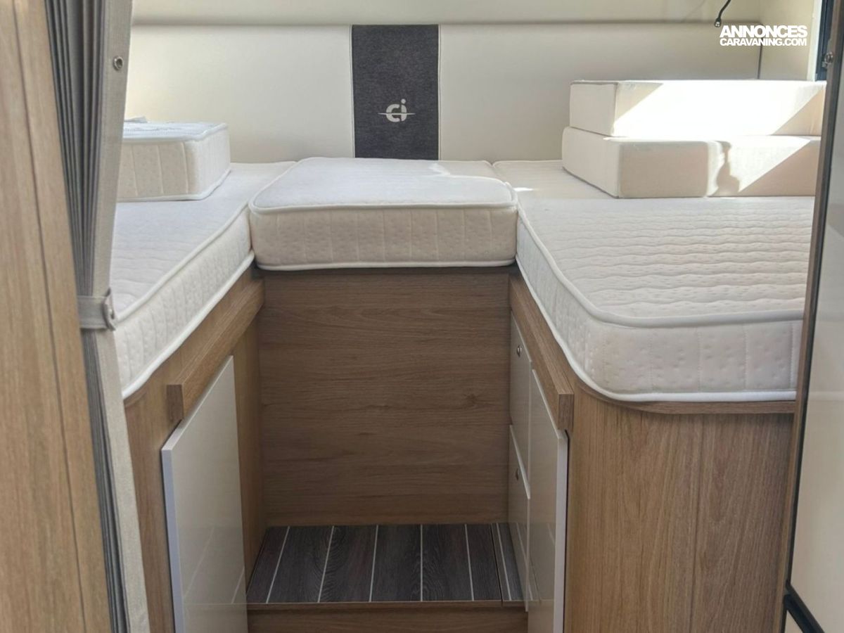 Le CI Horon GO 85 XT propose un espace de vie lumineux et convivial, parfaitement adapté aux voyages en couple ou en famille. Son aménagement intérieur permet de profiter d’un salon confortable, d’une cuisine fonctionnelle et d’un espace nuit optimisé, offrant un véritable confort de vie lors de vos escapades.