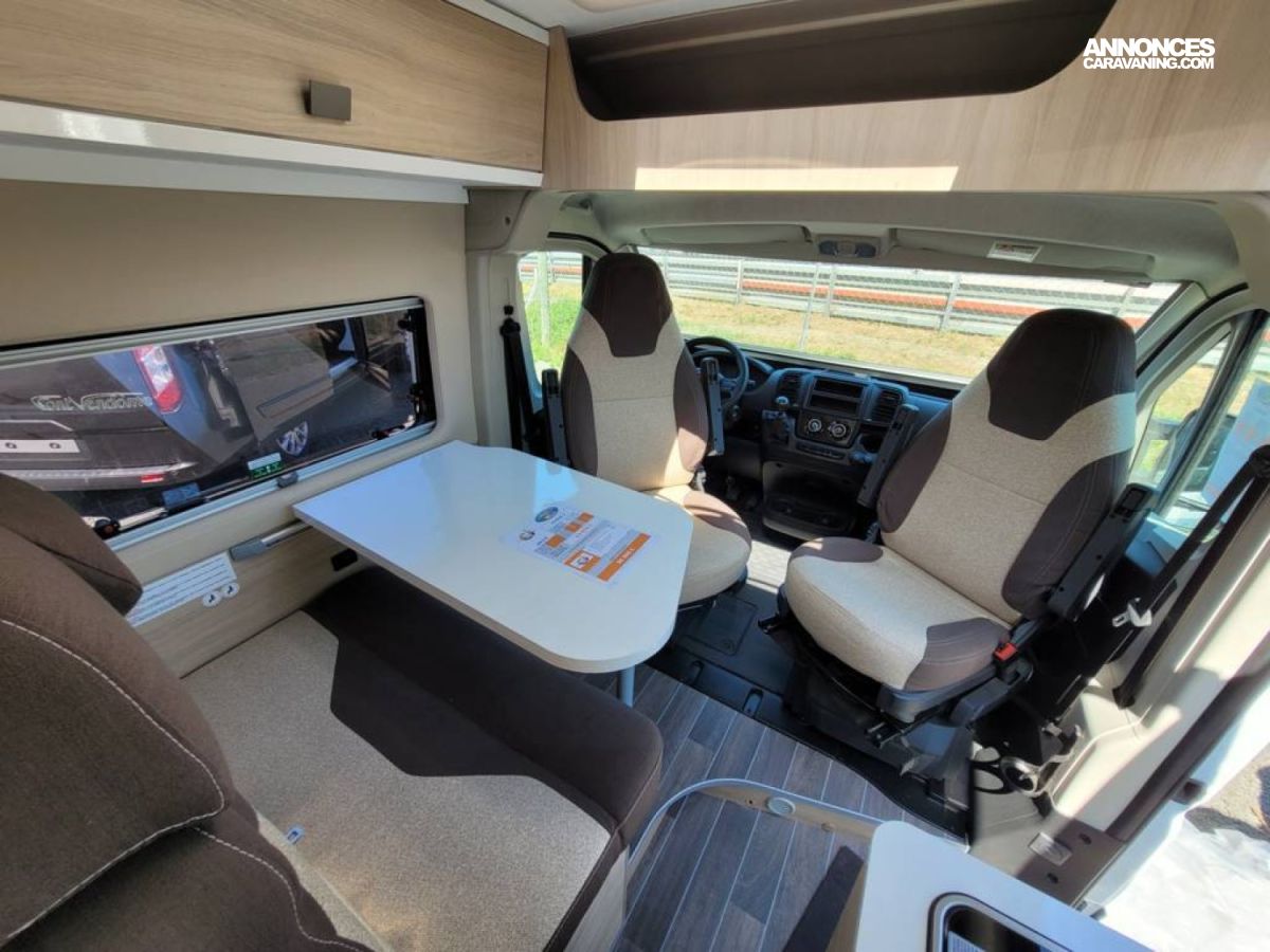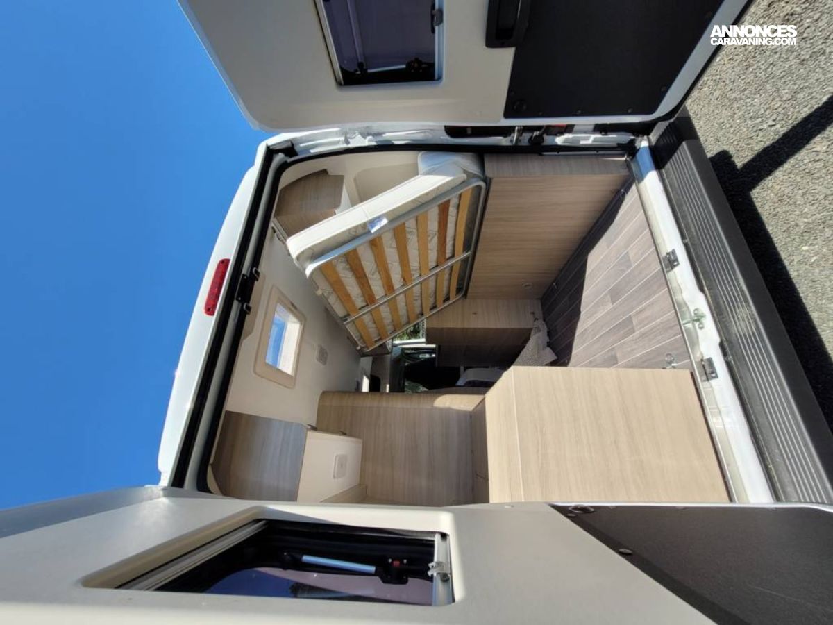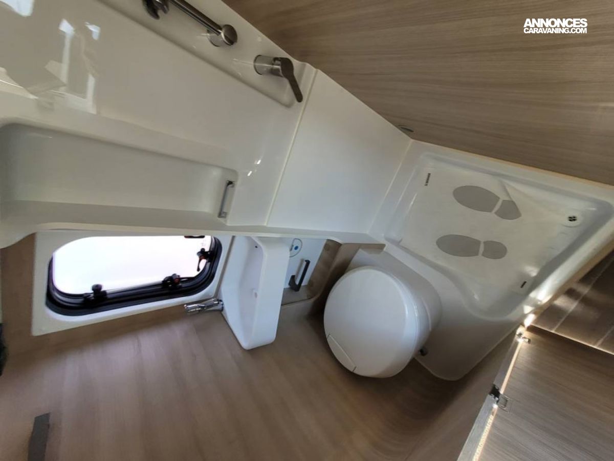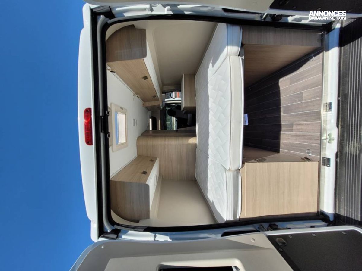 Bac de douche, Cuisine en bout, Lit arrière transversal, Salon avant sièges pivotants, WC Cassette.