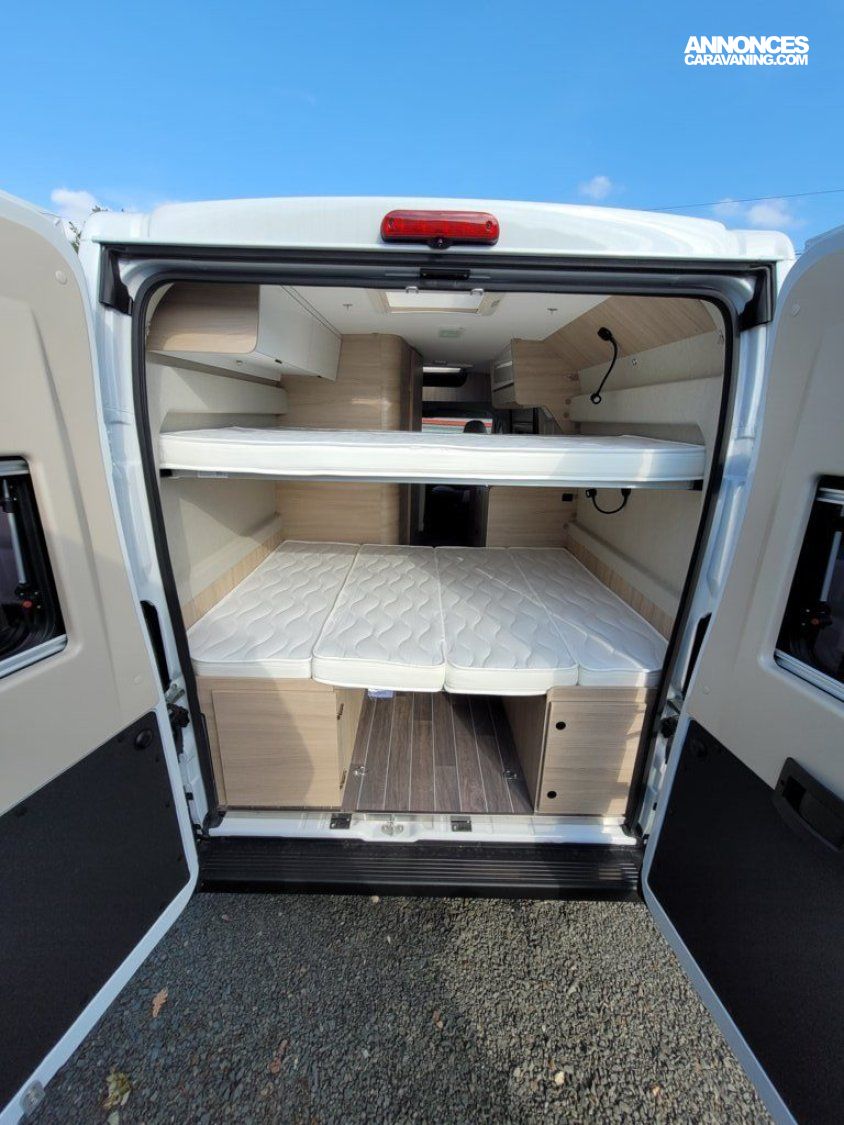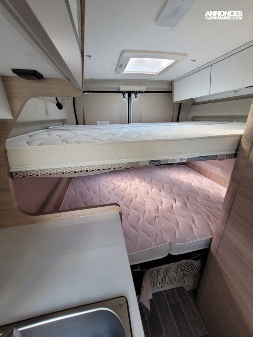Bac de douche, Cuisine en long, Douche modulable, Lit arrière transversal, lit superposés, Salon avant sièges pivotants, WC Cassette.