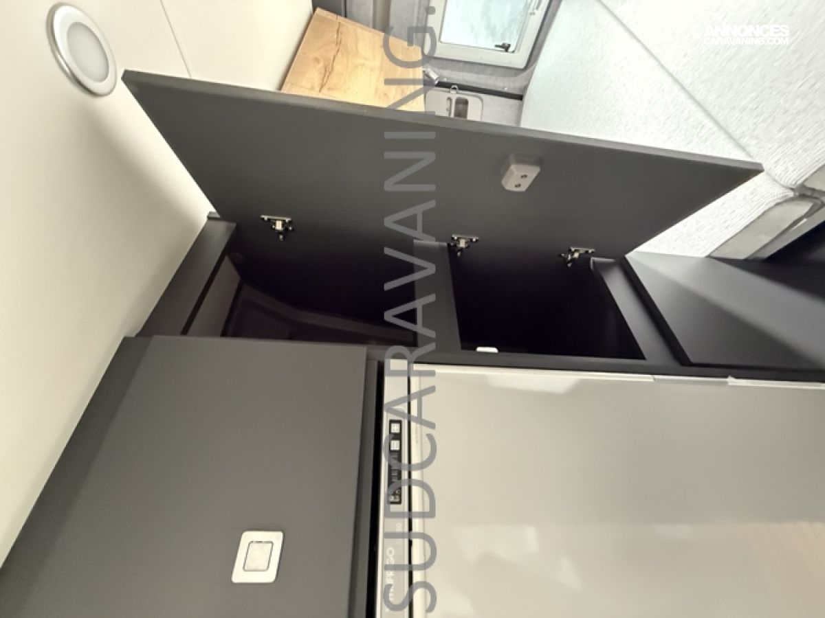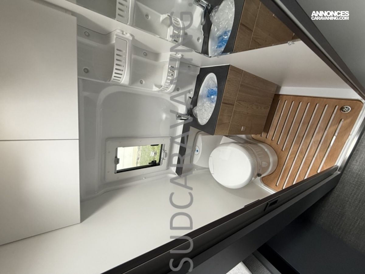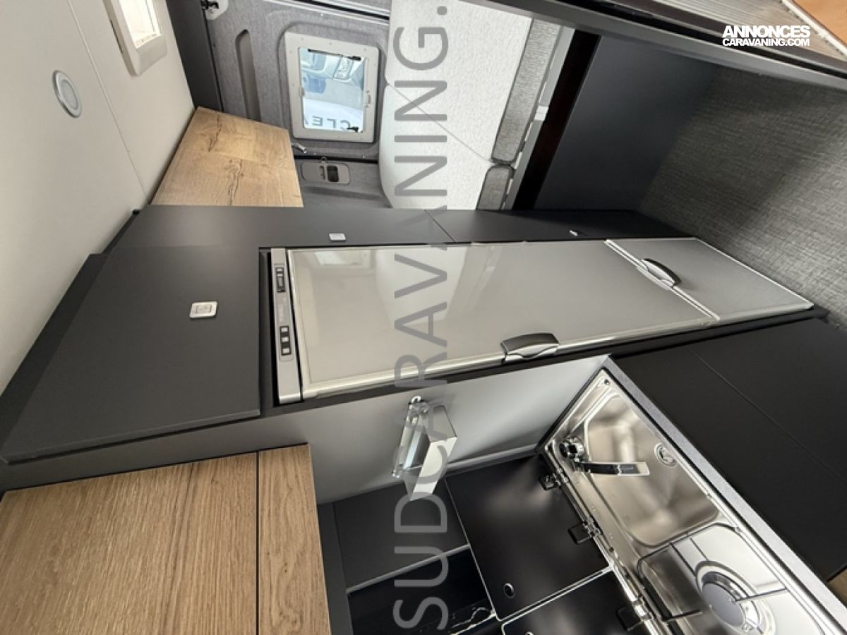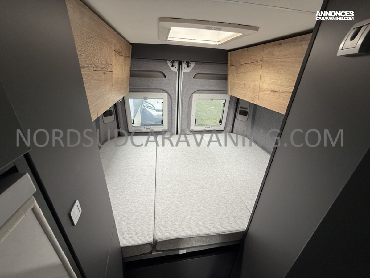 Ce magnifique fourgon sur Citroën Jumper est équipé d’une dinette agréable et lumineuse de 4 personnes pour passer de bons moments en toute convivialité. Sa cuisine latérale fonctionnelle dotée d’un réchaud 2 feux, d’un évier inox, de couvercles en verre, d’un grand réfrigérateur et d’un plan de travail haute résistance avec une rallonge qui raviront les cuisinières et cuisiniers. En face, une salle d’eau avec WC à cassette, lavabo, miroir, douchette et caillebotis. A l’arrière, vous y retrouverez un lit transversal, ainsi l’esprit de vacances s’installe en un instant. Emportez ce dont vous avez besoin avec ses nombreux rangements astucieux, l’espace ne manque pas.
