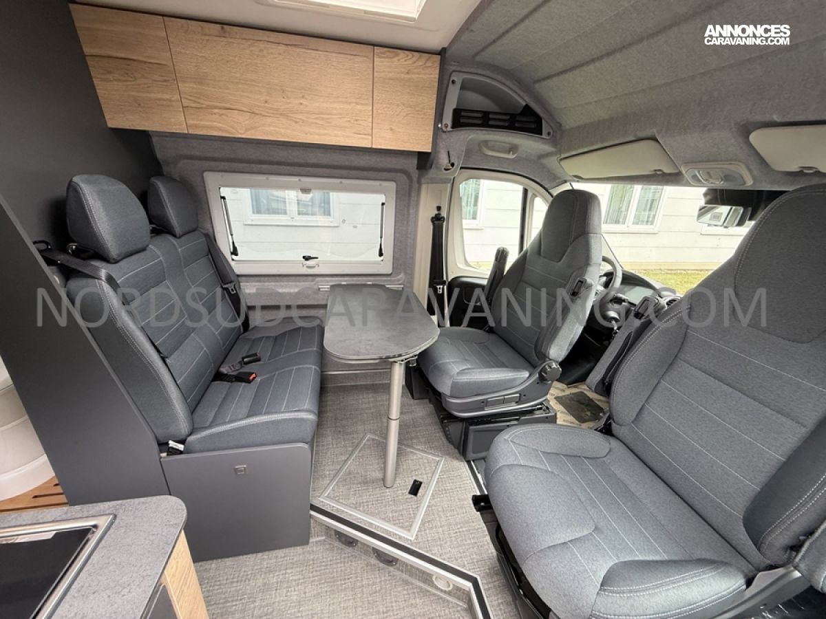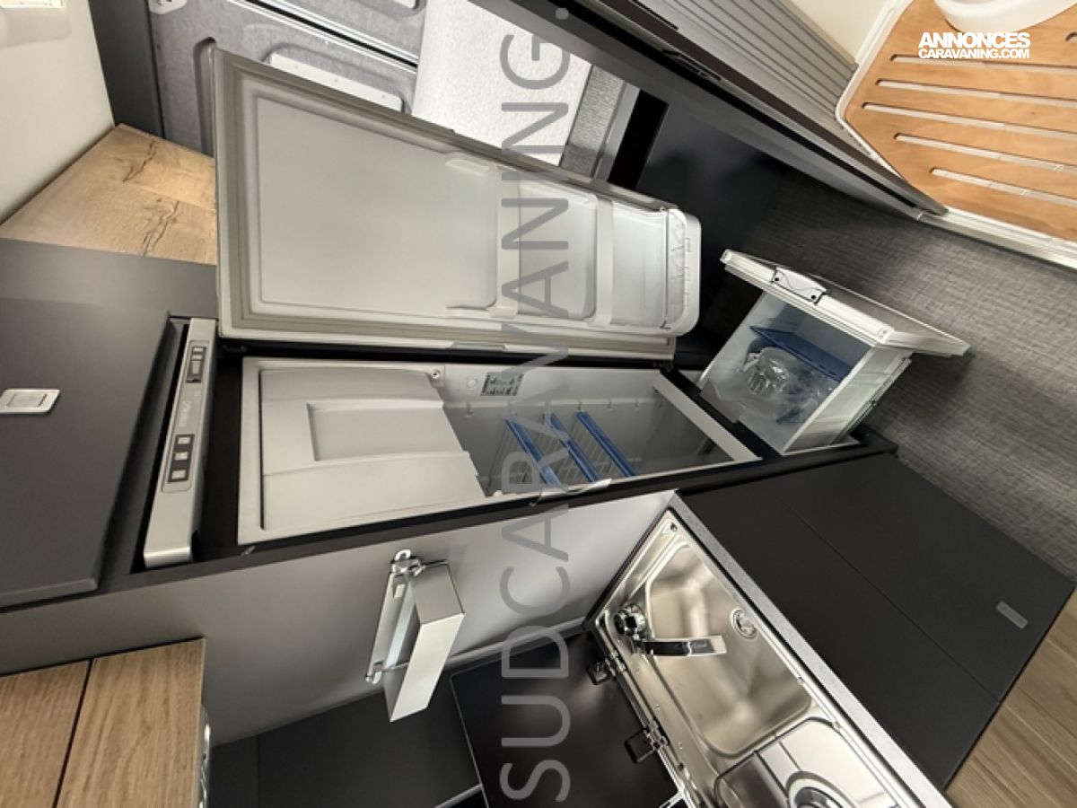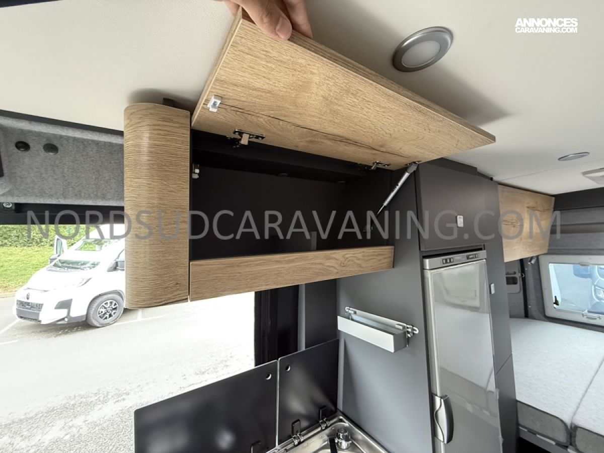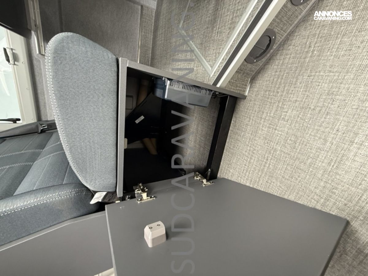Ce magnifique fourgon sur Citroën Jumper est équipé d’une dinette agréable et lumineuse de 4 personnes pour passer de bons moments en toute convivialité. Sa cuisine latérale fonctionnelle dotée d’un réchaud 2 feux, d’un évier inox, de couvercles en verre, d’un grand réfrigérateur et d’un plan de travail haute résistance avec une rallonge qui raviront les cuisinières et cuisiniers. En face, une salle d’eau avec WC à cassette, lavabo, miroir, douchette et caillebotis. A l’arrière, vous y retrouverez un lit transversal, ainsi l’esprit de vacances s’installe en un instant. Emportez ce dont vous avez besoin avec ses nombreux rangements astucieux, l’espace ne manque pas.