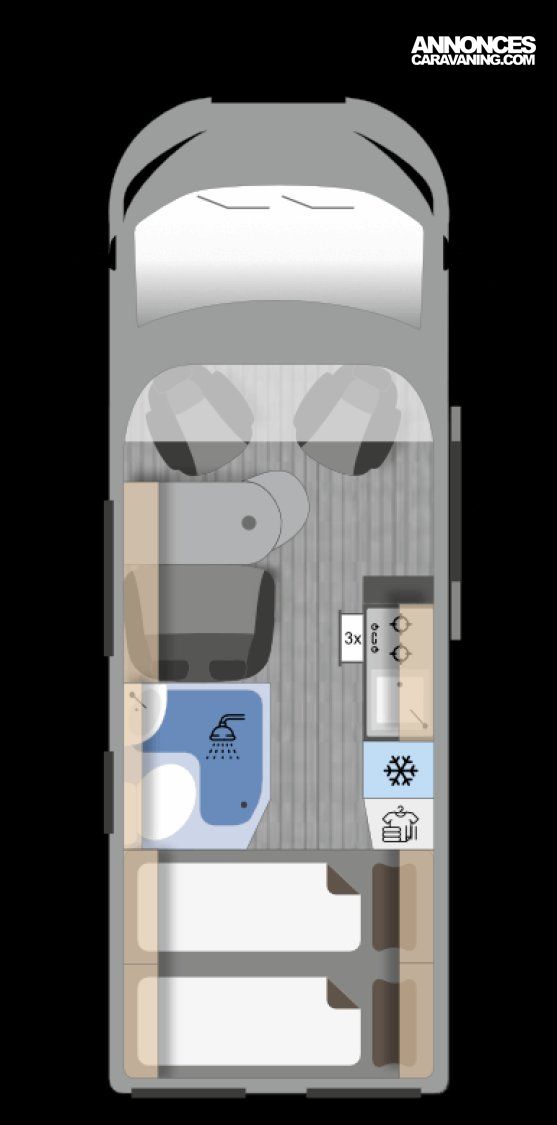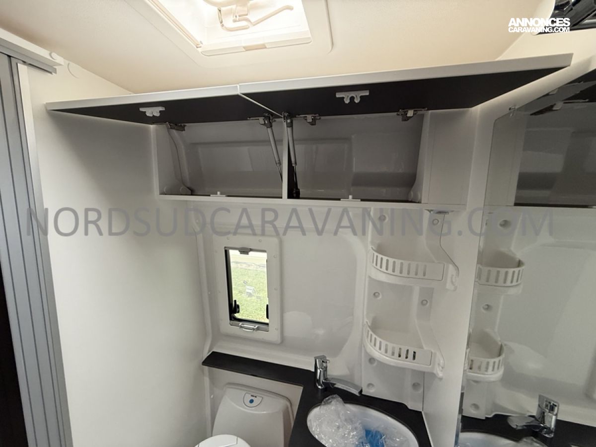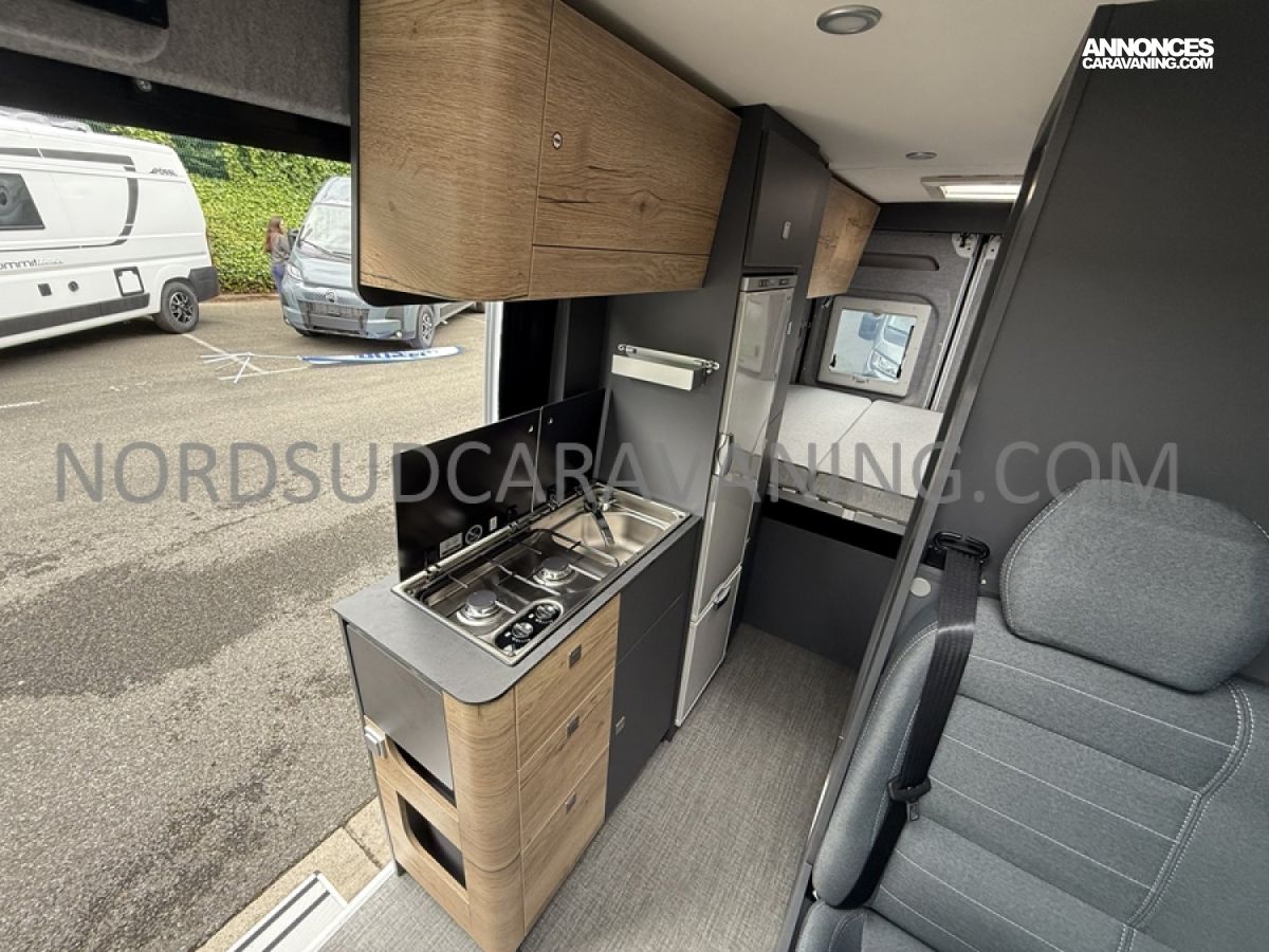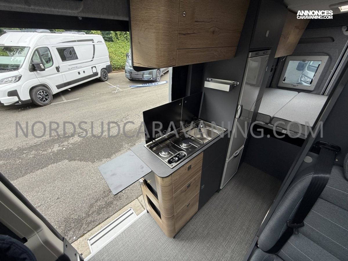 Ce magnifique fourgon sur Citroën Jumper est équipé d’une dinette agréable et lumineuse de 4 personnes pour passer de bons moments en toute convivialité. Sa cuisine latérale fonctionnelle dotée d’un réchaud 2 feux, d’un évier inox, de couvercles en verre, d’un grand réfrigérateur et d’un plan de travail haute résistance avec une rallonge qui raviront les cuisinières et cuisiniers. En face, une salle d’eau avec WC à cassette, lavabo, miroir, douchette et caillebotis. A l’arrière, vous y retrouverez un lit transversal, ainsi l’esprit de vacances s’installe en un instant. Emportez ce dont vous avez besoin avec ses nombreux rangements astucieux, l’espace ne manque pas.