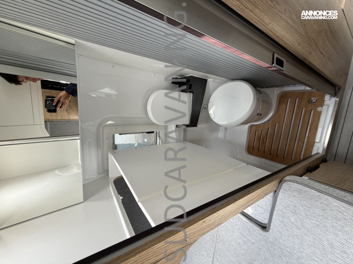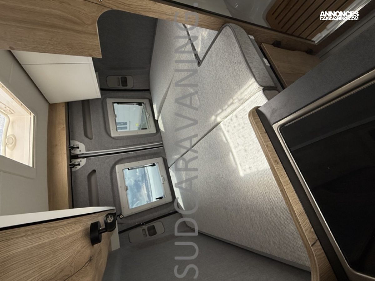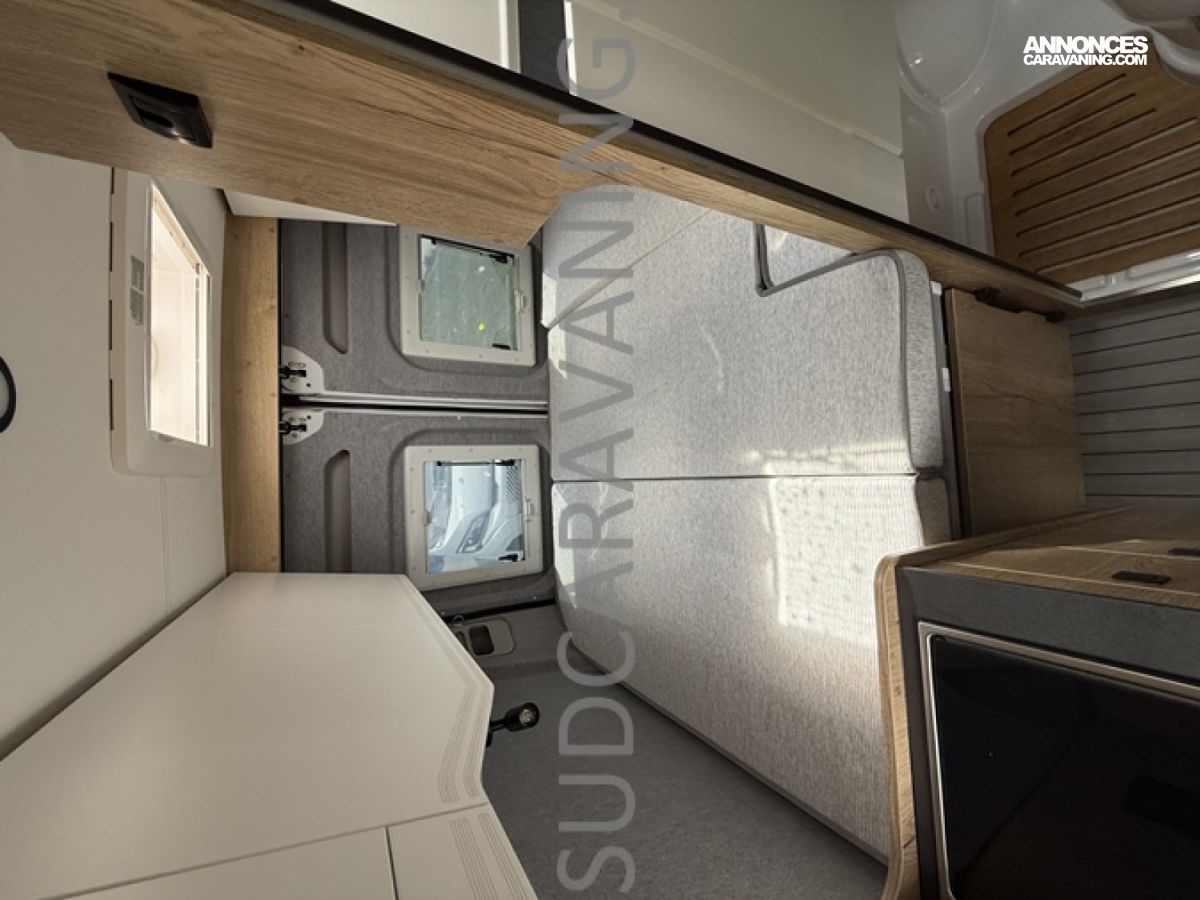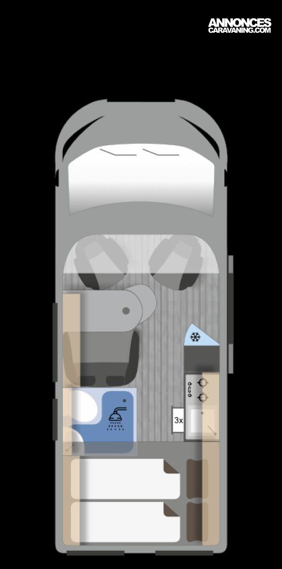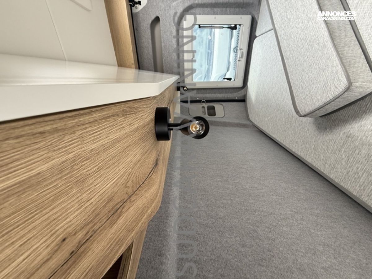 Ce magnifique fourgon de 5.40m avec sa maniabilité maximale, est équipé d’une dinette harmonieuse et lumineuse pour 4 personnes. Sa cuisine latérale fonctionnelle est dotée d’un réchaud 2 feux, d’un évier inox, de couvercles en verre, d’un réfrigérateur à double ouverture et d’un plan de travail haute résistance. En face, sa salle d’eau avec WC à cassette, lavabo escamotable, miroir et un caillebotis vous apportera une sensation de bien-être. A l’arrière, vous y retrouverez un lit transversal pour des nuits agréables et confortables. Sans oublier ses nombreux rangements astucieux.