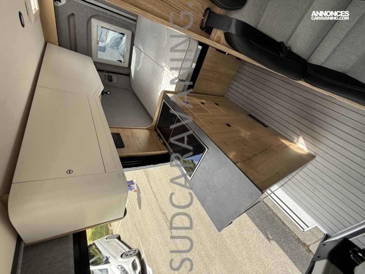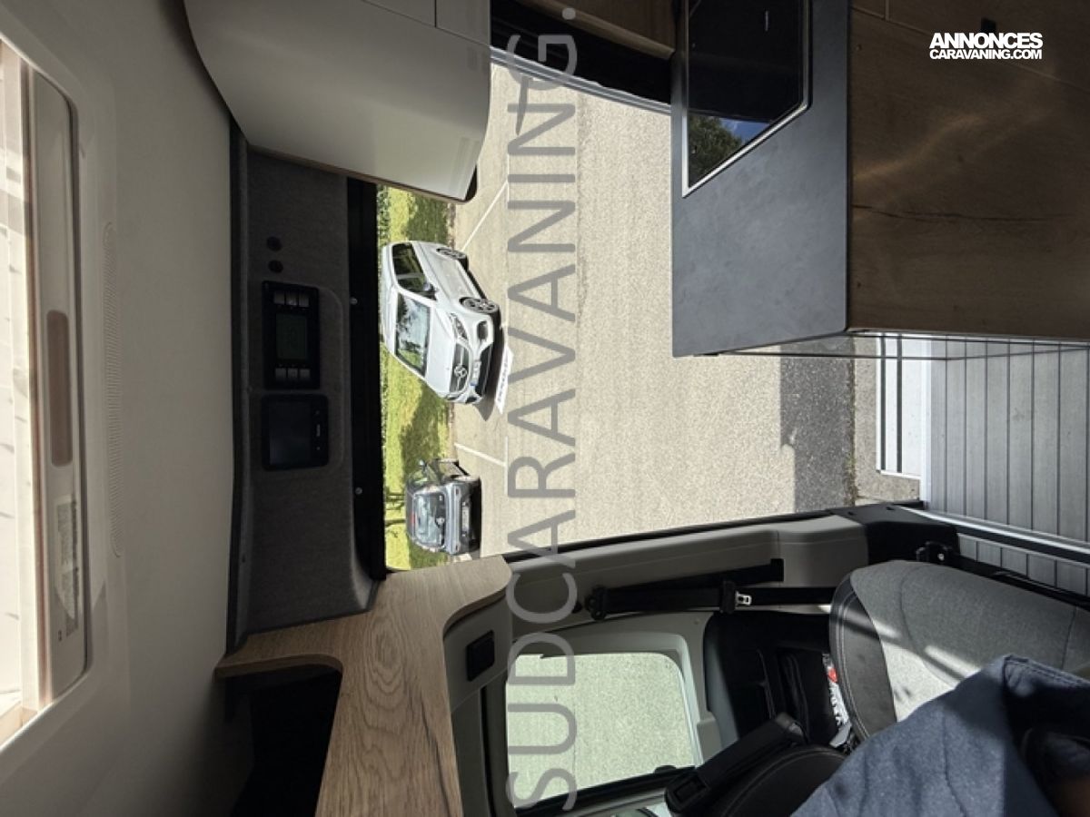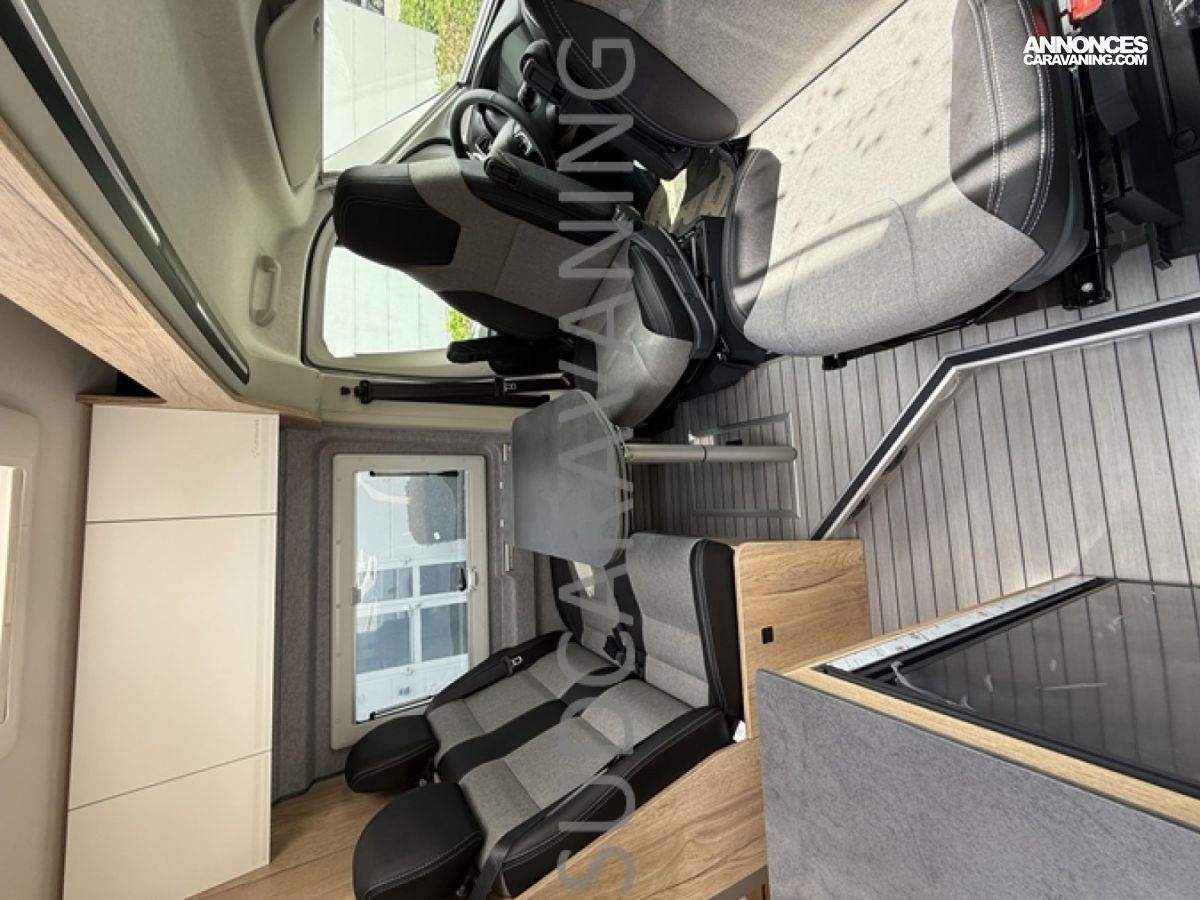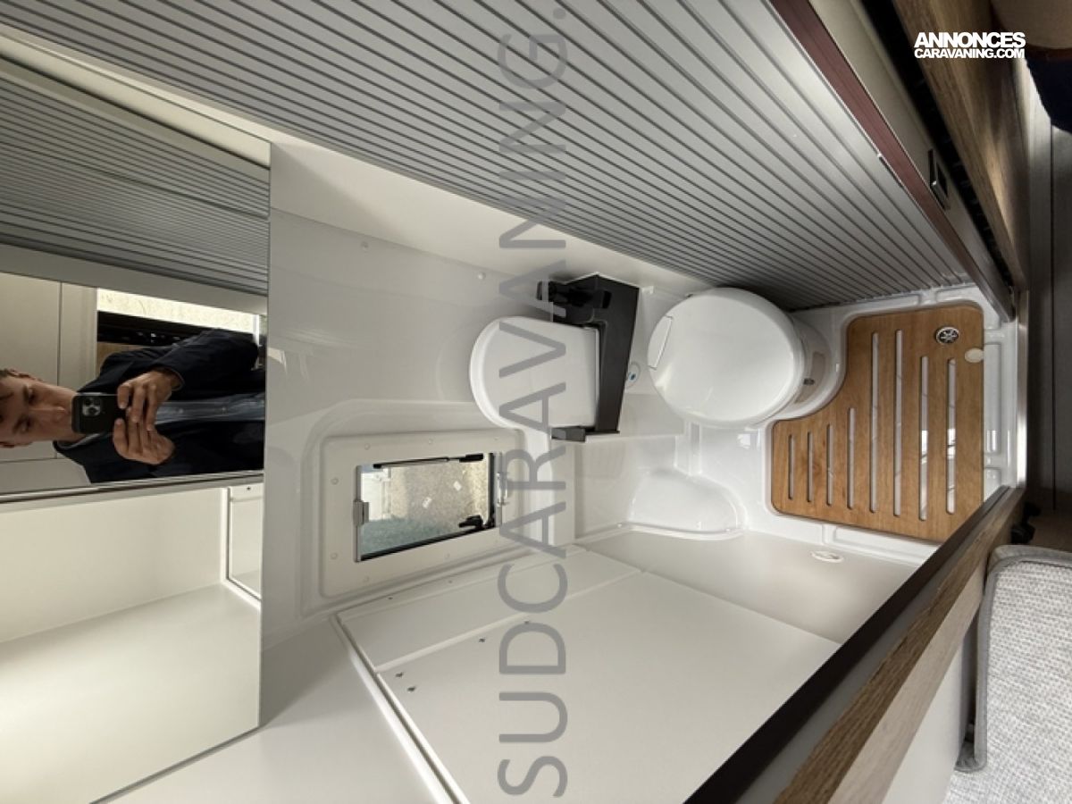 Ce magnifique fourgon de 5.40m avec sa maniabilité maximale, est équipé d’une dinette harmonieuse et lumineuse pour 4 personnes. Sa cuisine latérale fonctionnelle est dotée d’un réchaud 2 feux, d’un évier inox, de couvercles en verre, d’un réfrigérateur à double ouverture et d’un plan de travail haute résistance. En face, sa salle d’eau avec WC à cassette, lavabo escamotable, miroir et un caillebotis vous apportera une sensation de bien-être. A l’arrière, vous y retrouverez un lit transversal pour des nuits agréables et confortables. Sans oublier ses nombreux rangements astucieux.