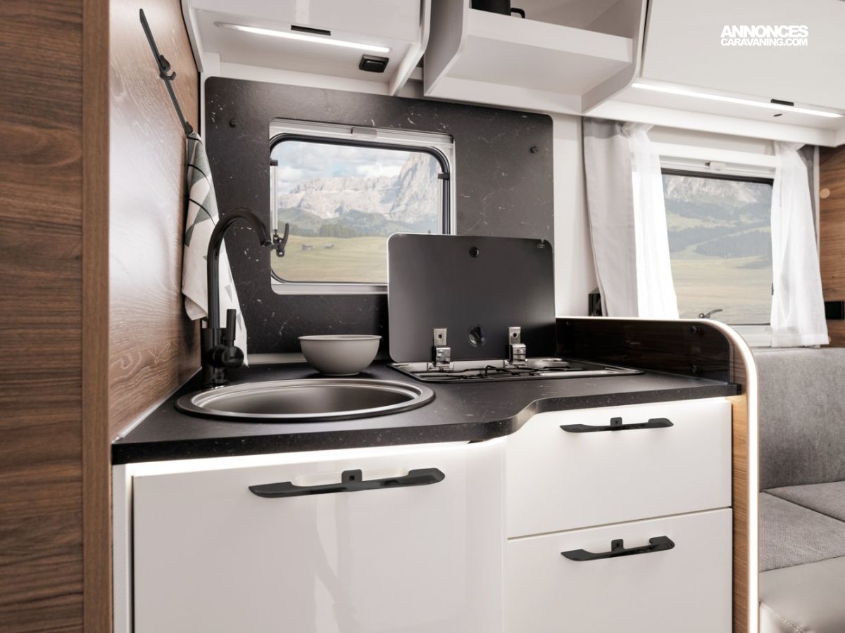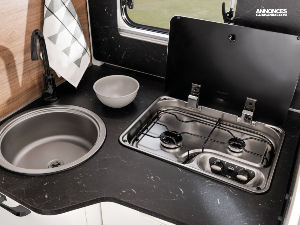 - Plaque de cuisson 2 feux, allumage électrique 12 V avec abattant en verre