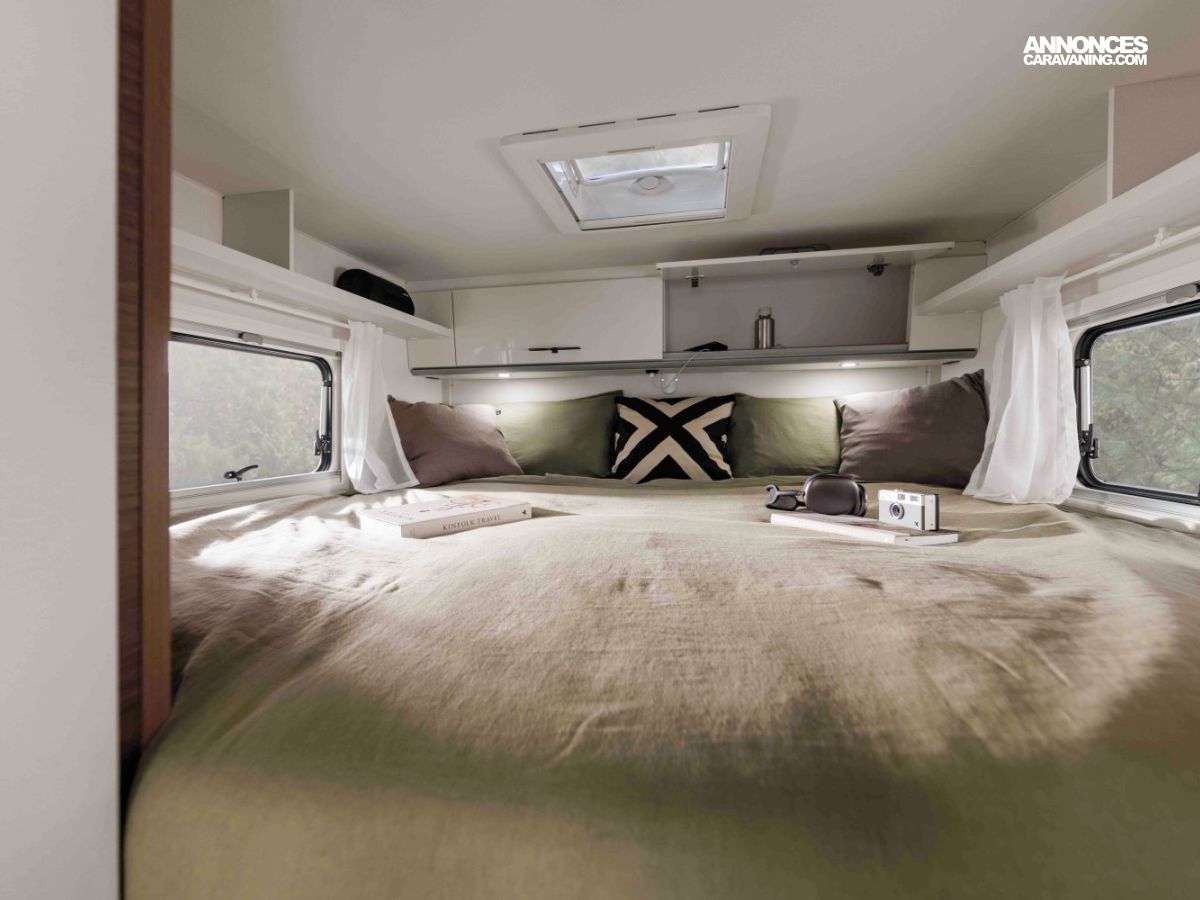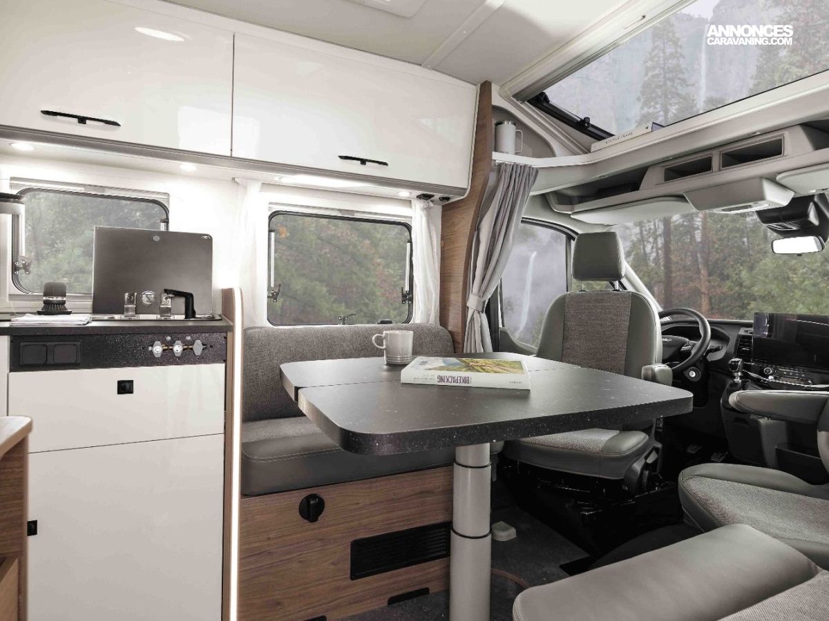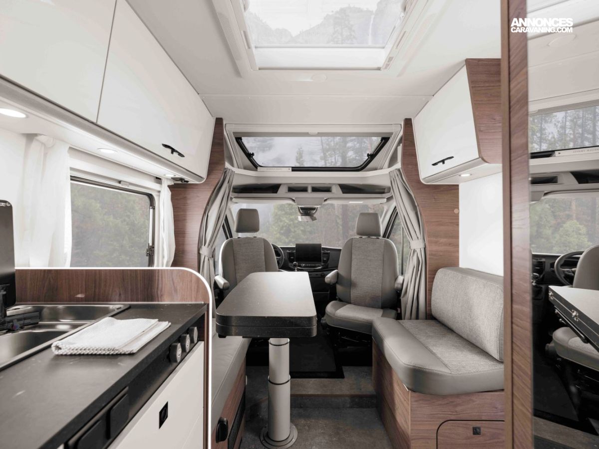 Corigon à réinventé l’intérieur de ce camping-car profilé avec un véritable salon face/face, un grand frigo à compression, une douche vario ingénieuse, une soute garage de très grande capacité et la présence d’un chauffage mixte Truma combi 6E!