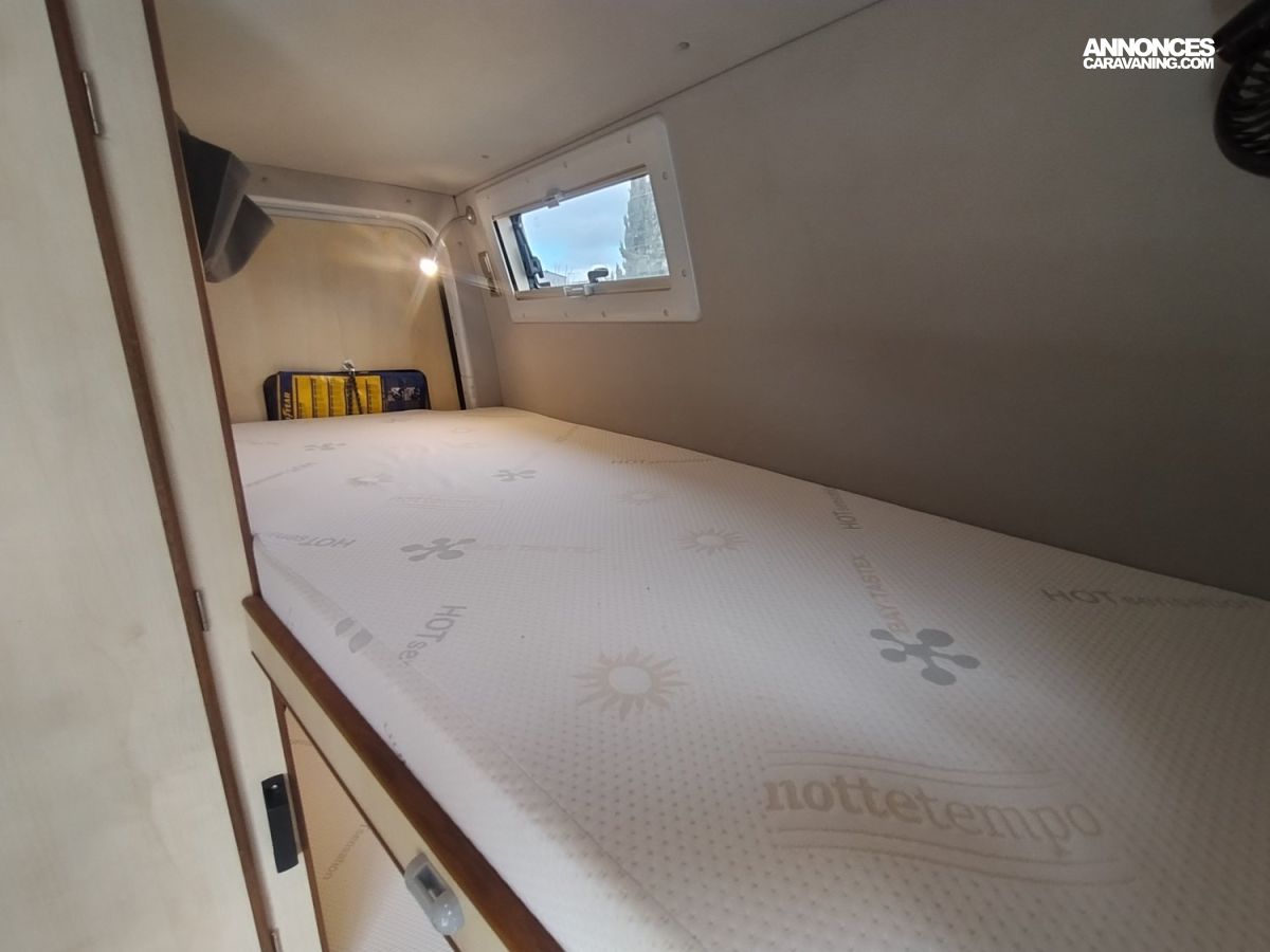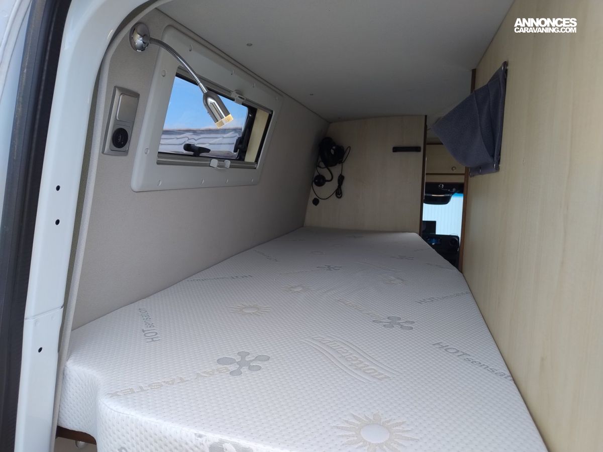 Son aménagement idéal pour un couple dispose de tout ce que l’on peut attendre en termes de confort ; 2 confortables couchages en lits superposés, espace salon convivial et lumineux en partie avant, cuisine avec grand frigo à compression et de nombreux rangements, espace SDB et WC indépendant.