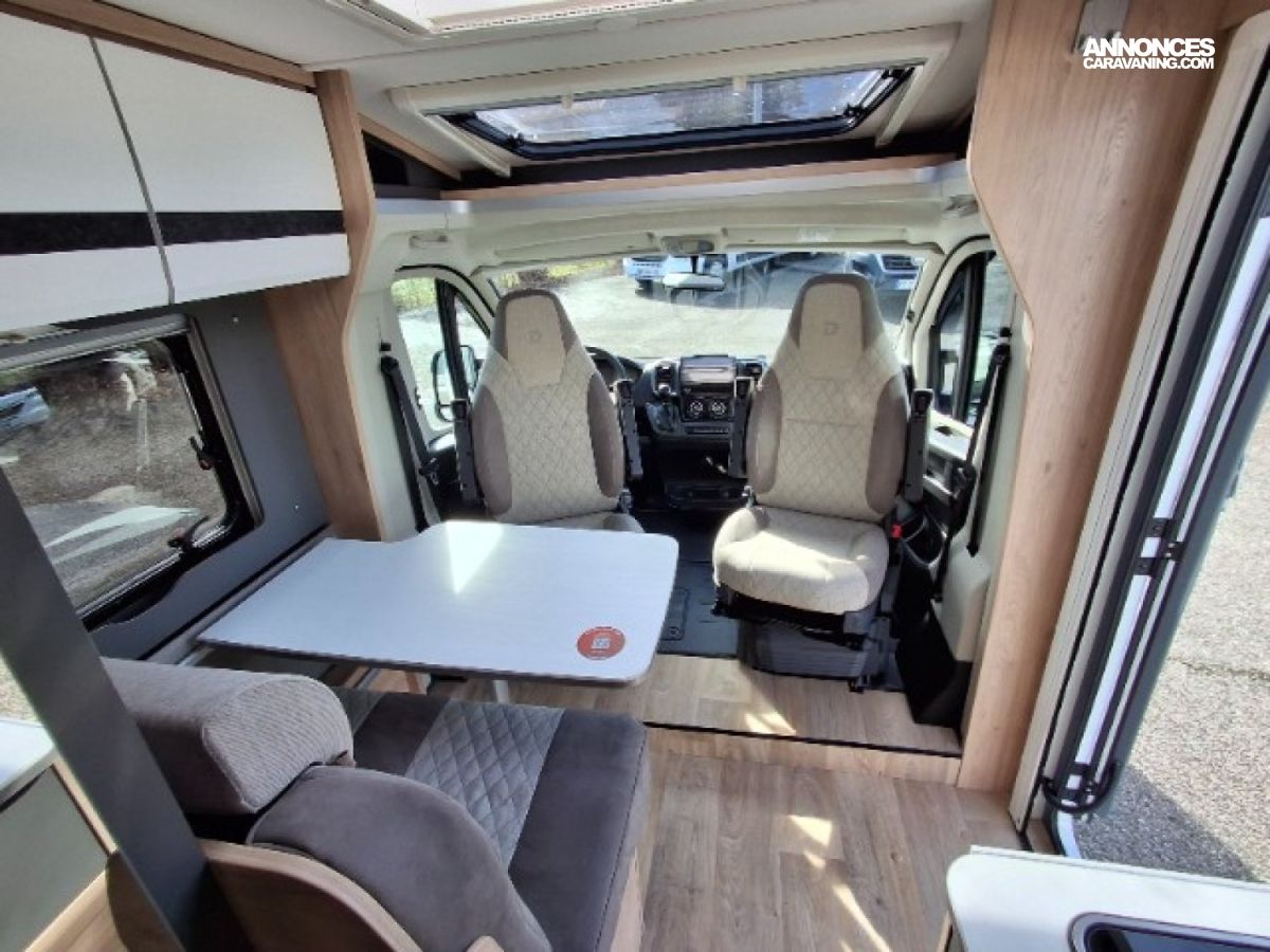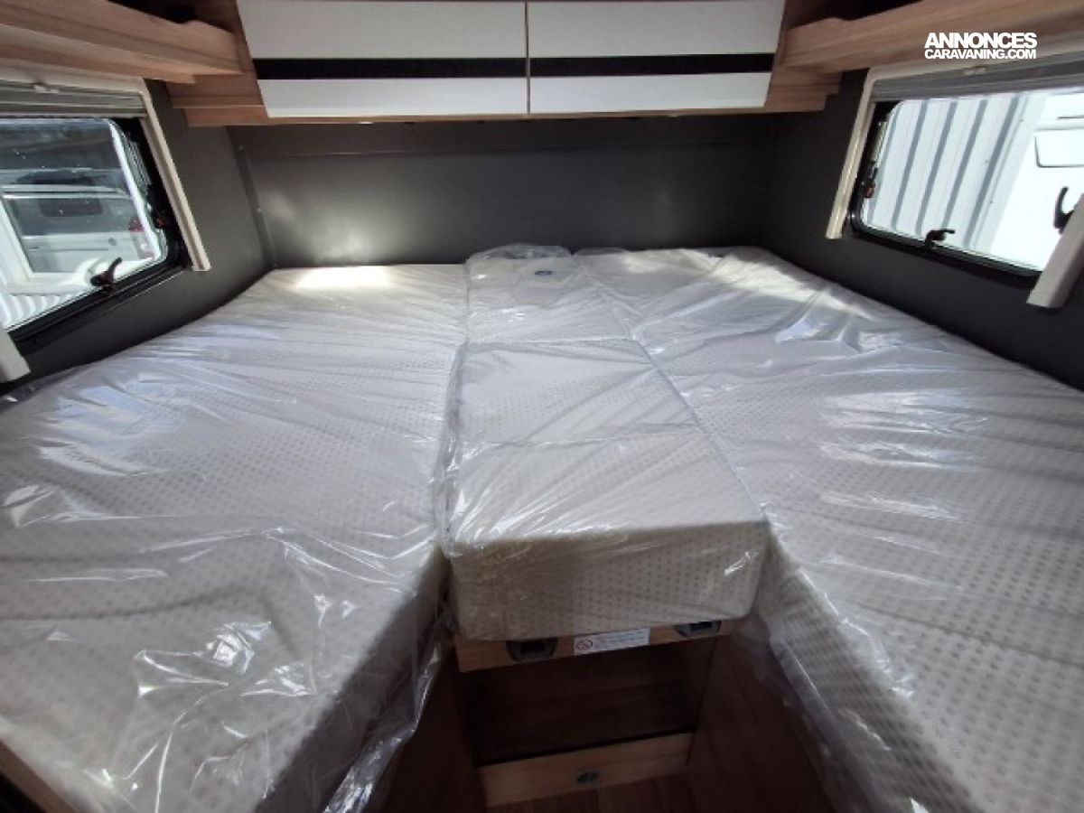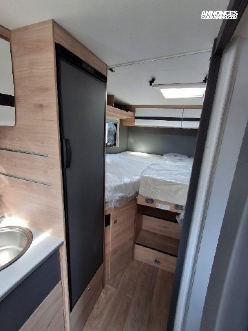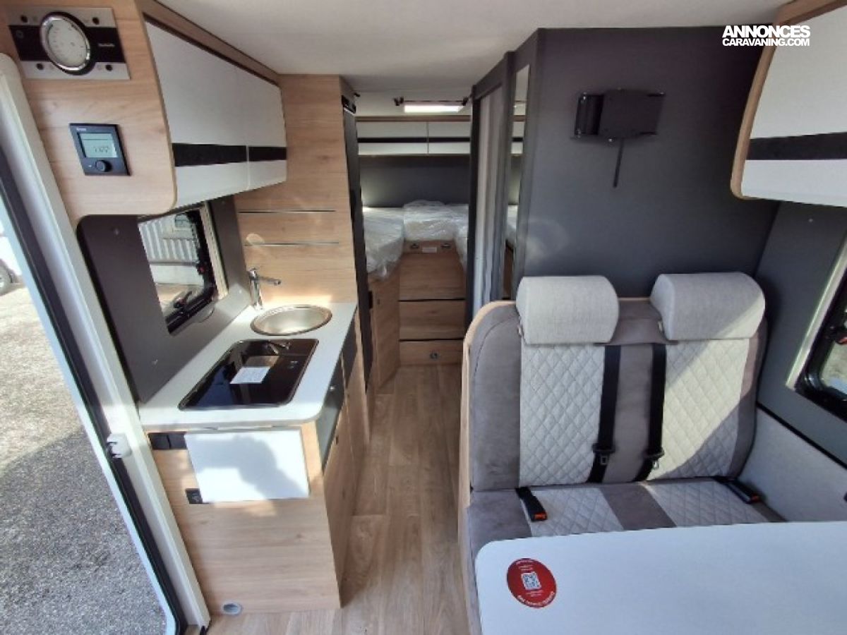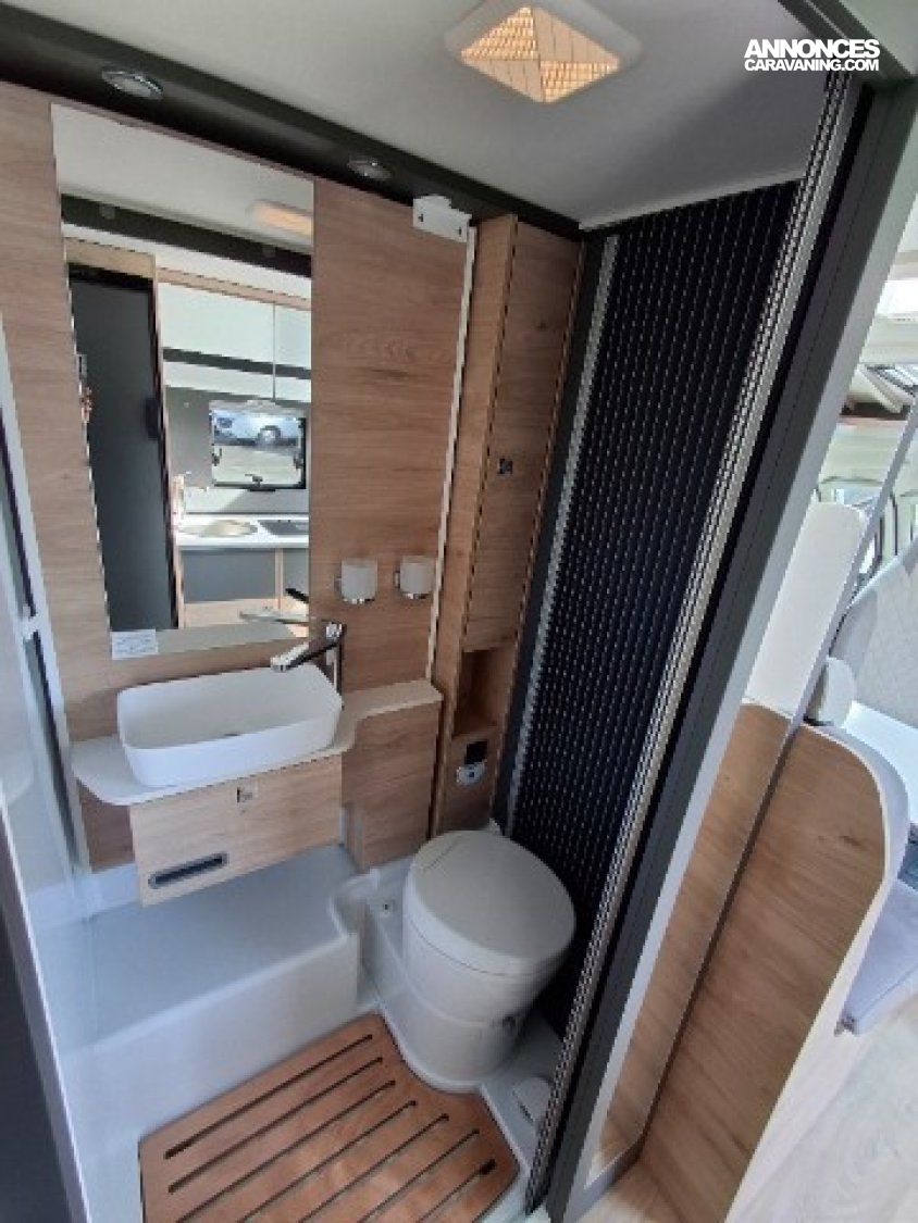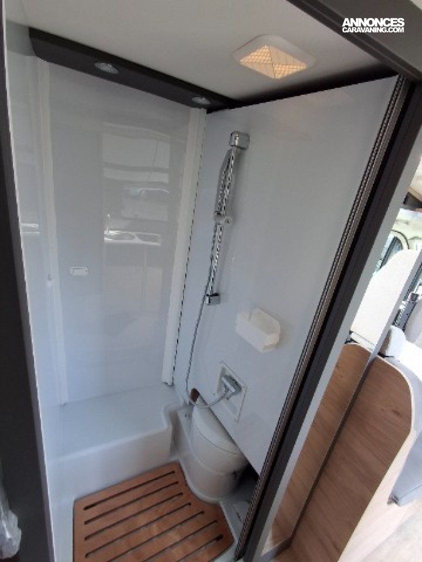 Chauffage 6KW gasoil, Eaux propres/usées 135L/95L, Lits jumeaux + lit dinette, Réfrigérateur 116L + 15L freezer, Toilette vario, Vehicule neuf d'exposition