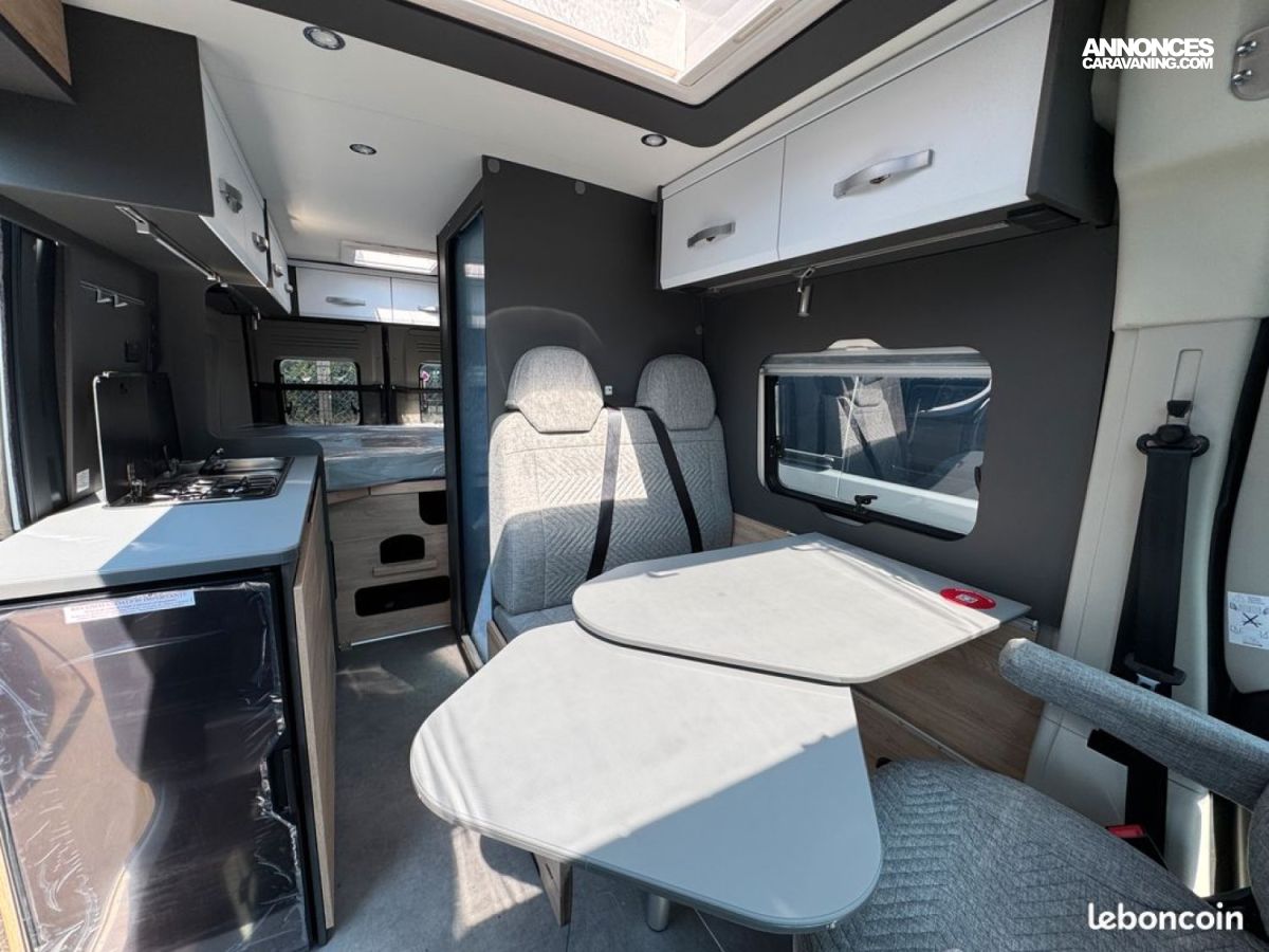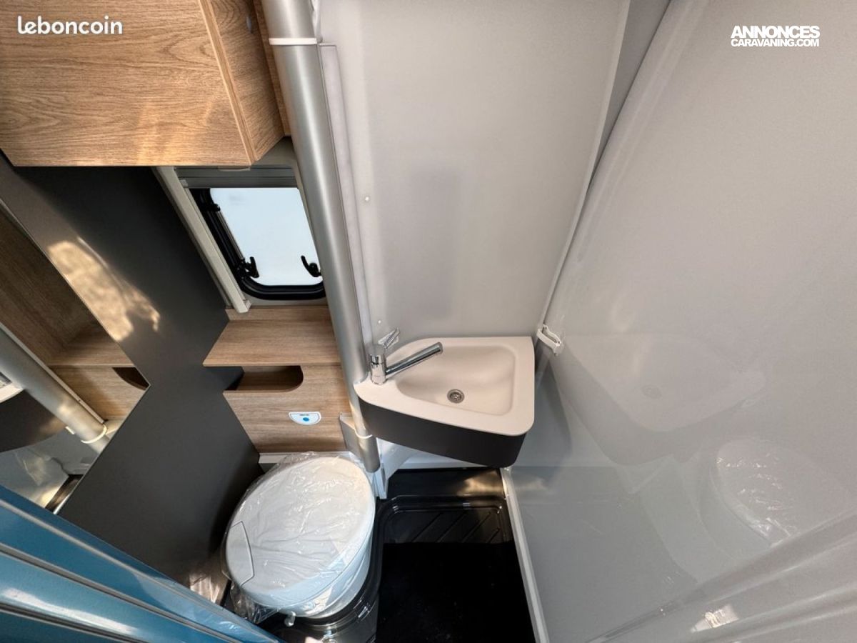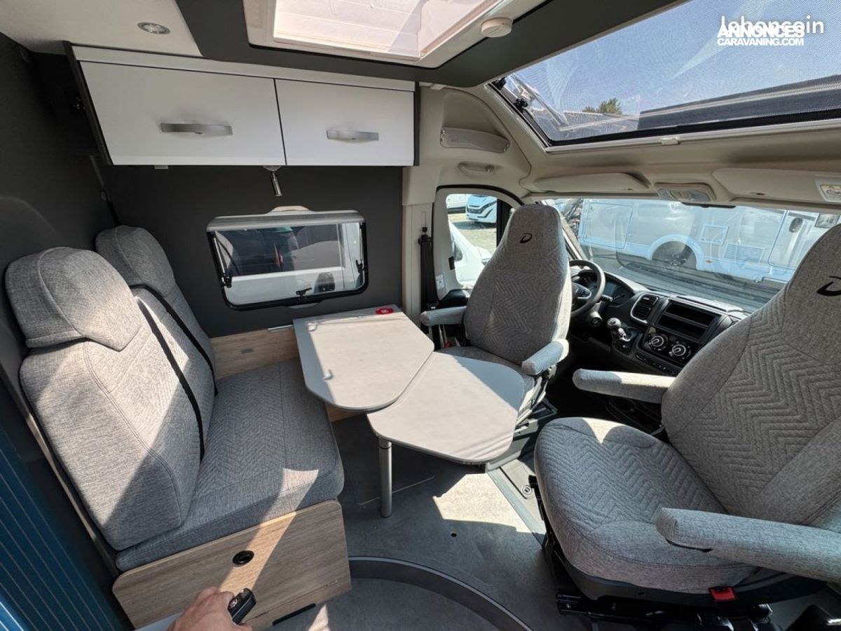 Equipements de série : Système de freinage antiblocage (ABS), programme électronique de stabilité (ESP), contrôle de traction (TCS), antibrouillard, assistant de démarrage en côte (assistant de vent latéral, assistant de freinage de sécurité, protection en cas de retournement) Jantes Alu 16 pouces Store extérieur Tiroir coulissant ergonomique à l’arrière Chauffage Truma Combi 4 2 bouteilles de gaz 13 kg chacune avec Crashsensor Volant et pommeau de vitesse gainés de cuir Feux de jour à LED Baie à cadre haut de gamme Pare-chocs laqué, identique à la couleur de la carrosserie Eaux propre 100 L – eaux usées 90 L Réfrigérateur à compression en position haute de 84 l, congélation de 6 L Lit arrière 197 x 157/140 cm et Lit dinette 168 x 101 cm –