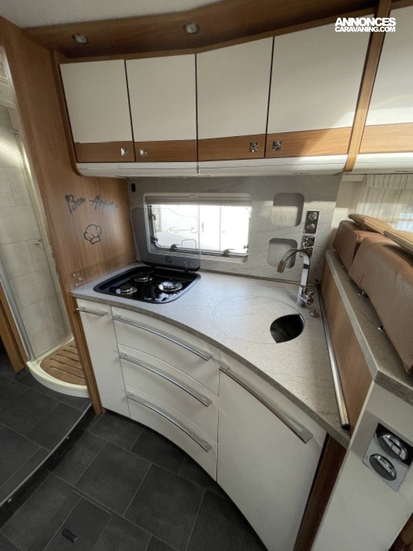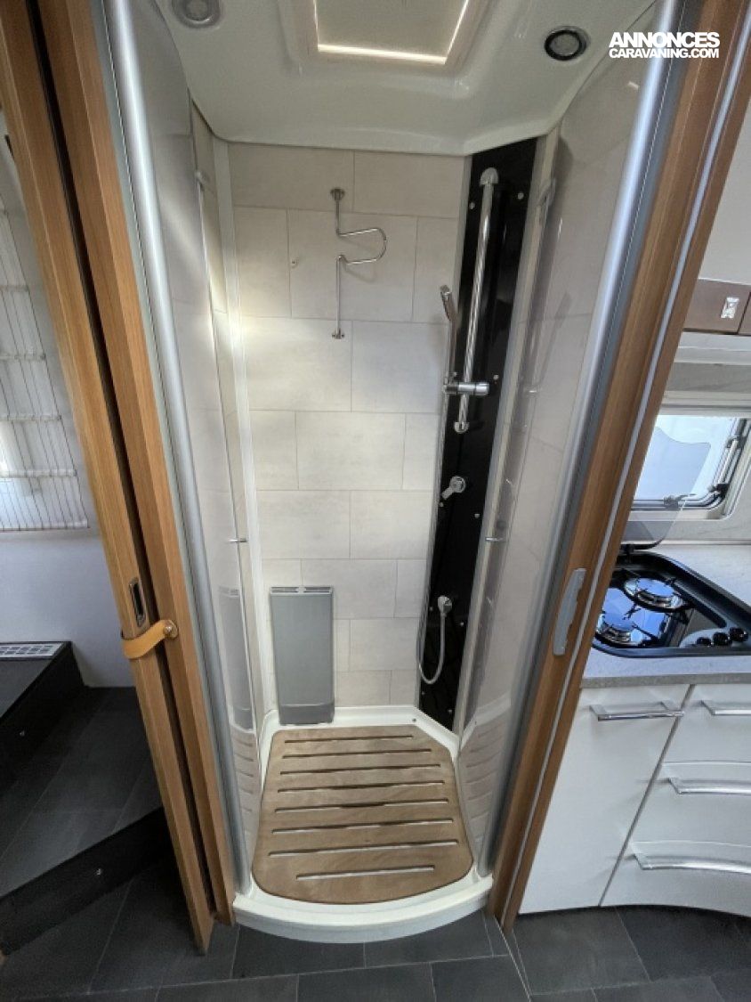 Ce modèle haut de gamme offre un grand salon spacieux et lumineux, une cuisine parfaitement équipée, une douche indépendante du WC, ainsi qu’un lit central complété par un lit pavillon électrique.