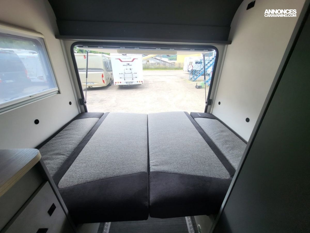 La dînette à l’arrière du Dethleffs Yoka Go sert de couchage. Elle se transforme rapidement en un lit spacieux de 2,05 m x 1,35 m.