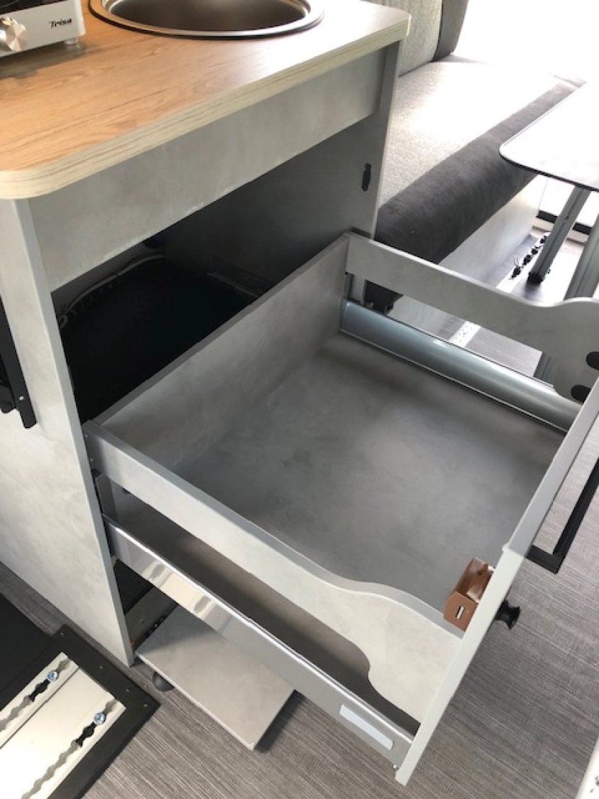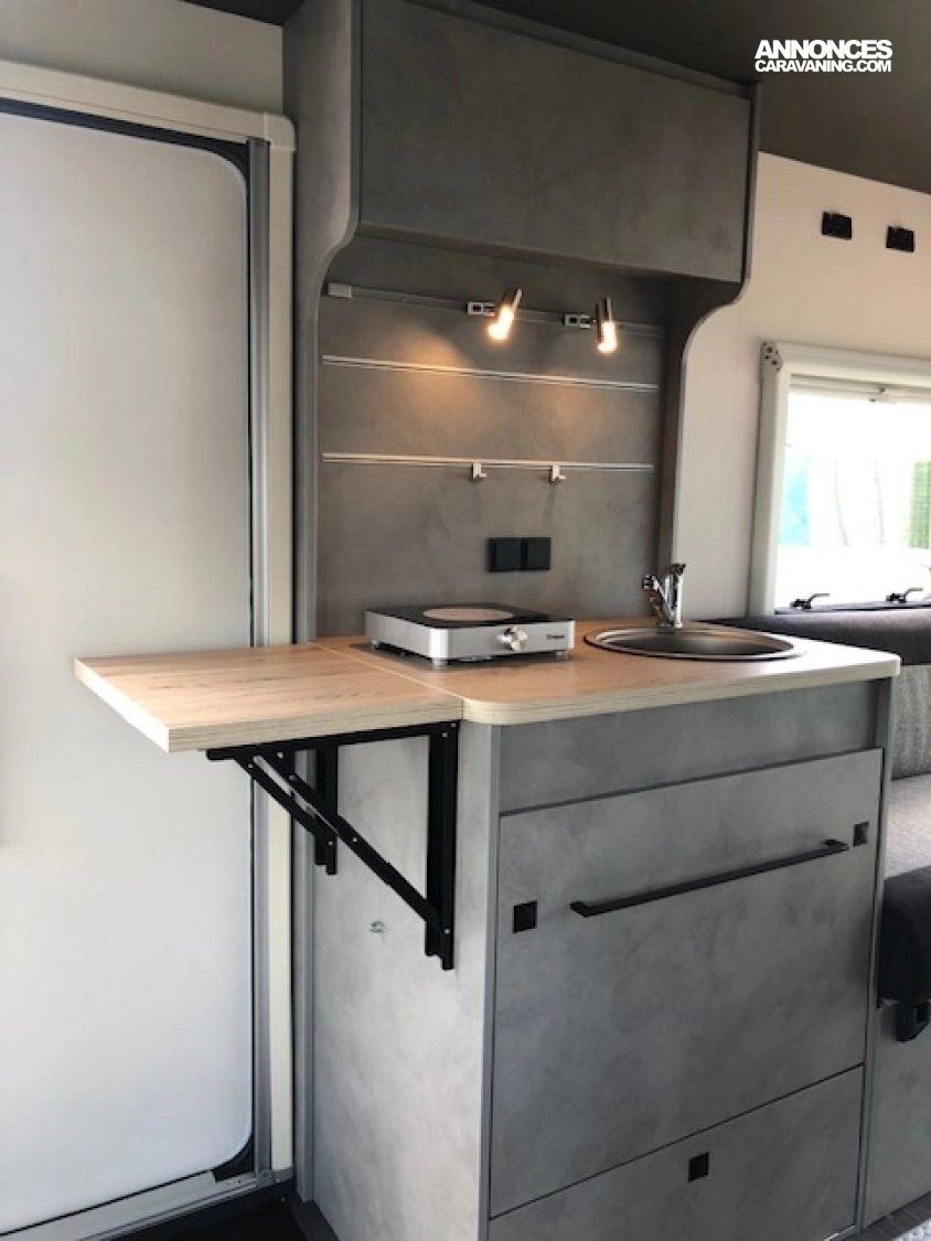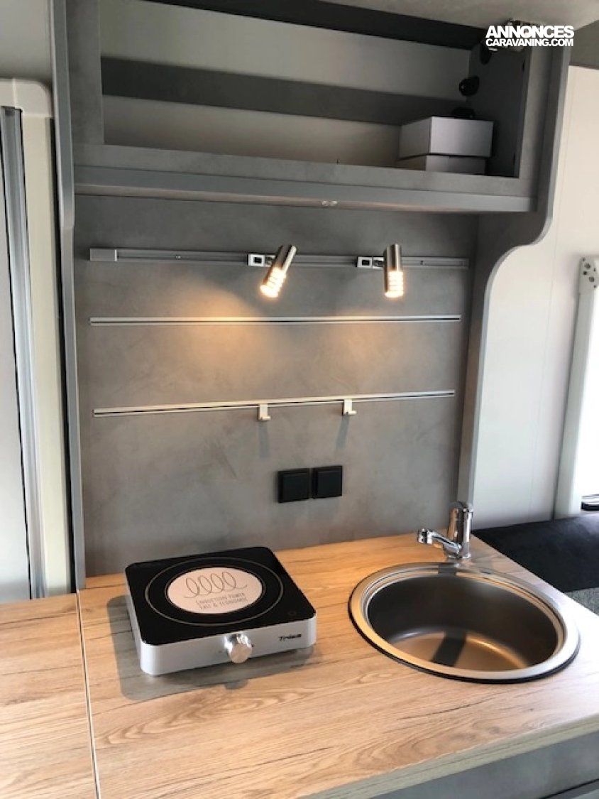 Cuisine pratique avec réchaud à induction et bidons d’eau propre et d’eaux usées