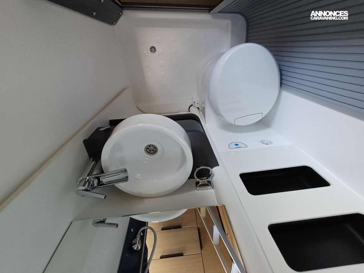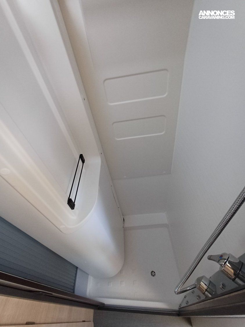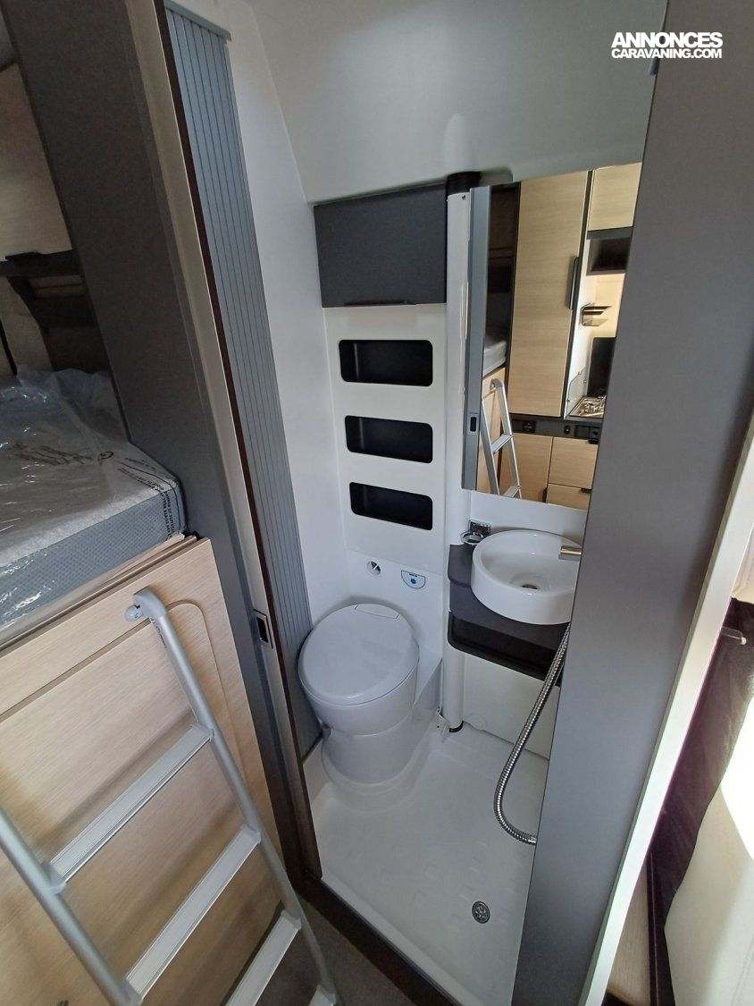 Salle d'eau Modul'Space avec porte de douche (D55, D55 UP) ou salle d'eau DUO'SPACE avec paroi pivotante (D43 UP, D68, CAMPER FIVE, CAMPER SPORT)