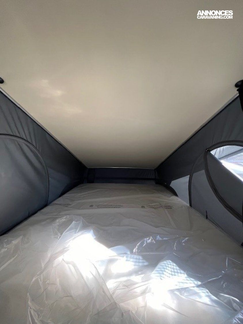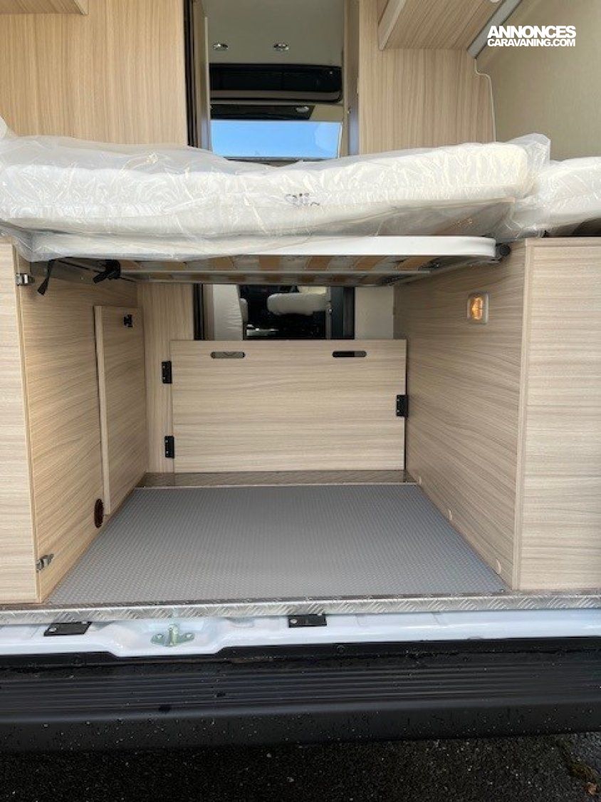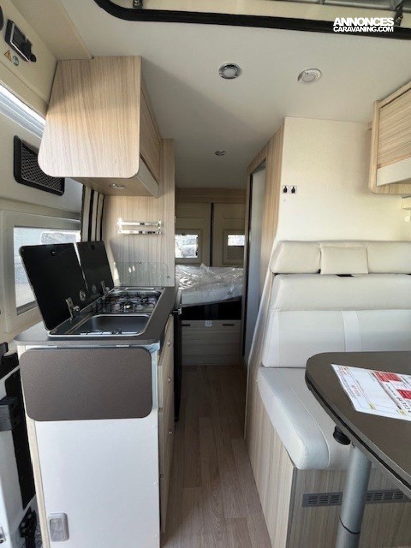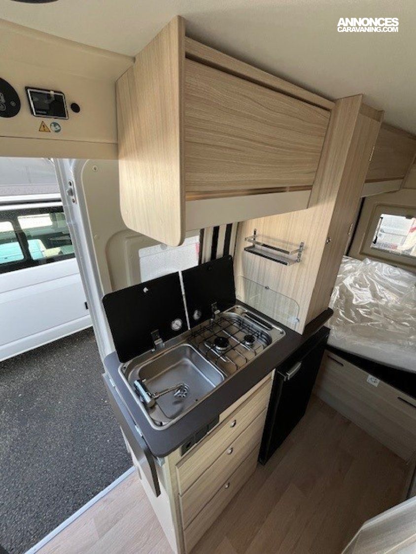 Bac de douche, Cuisine en long, Lit arrière transversal, Lit toit relevable, Salon avant sièges pivotants, WC Cassette.