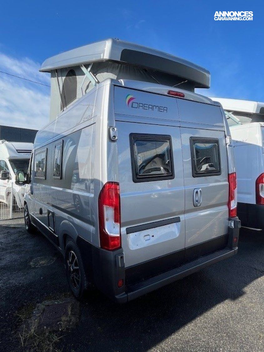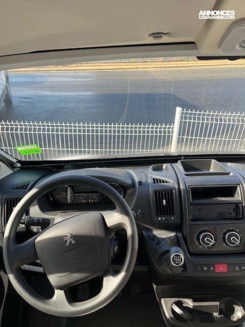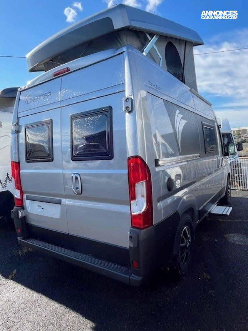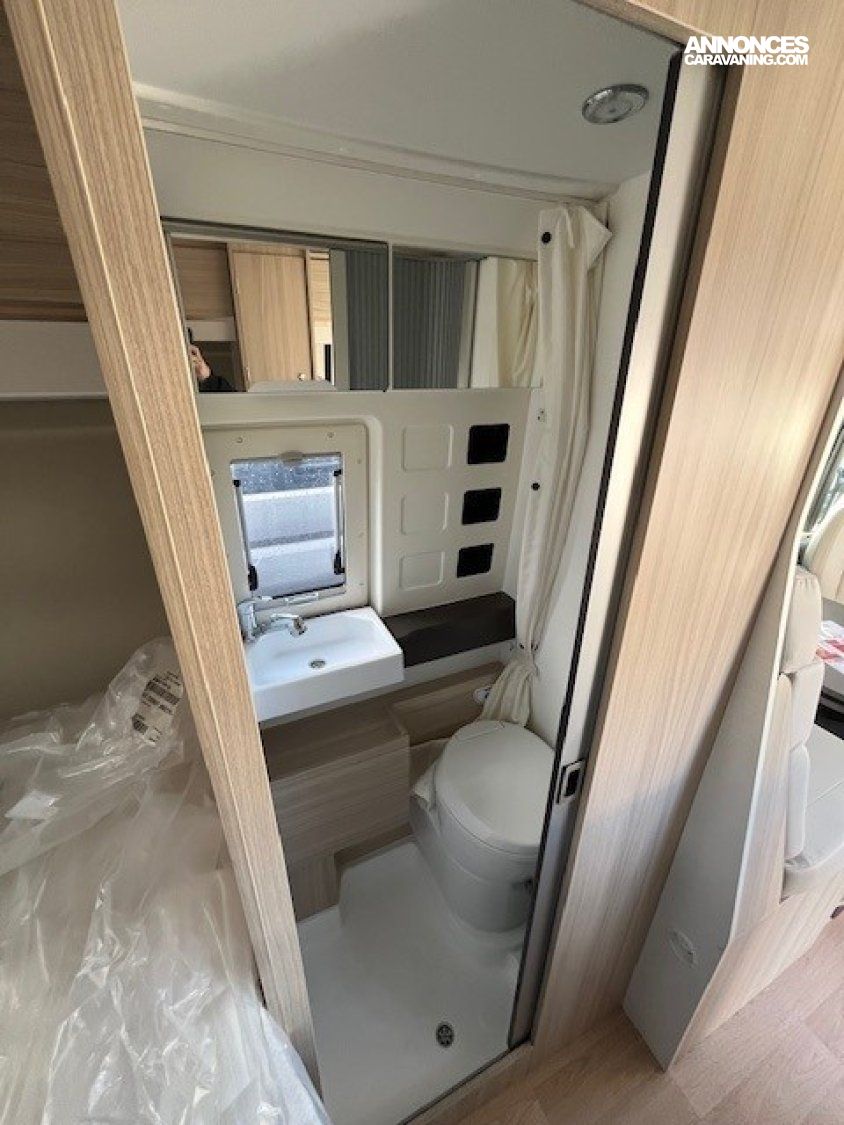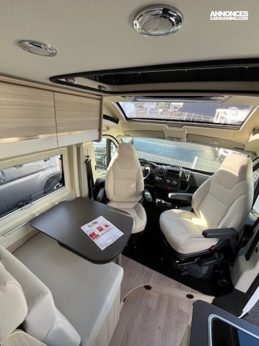 Bac de douche, Cuisine en long, Lit arrière transversal, Lit toit relevable, Salon avant sièges pivotants, WC Cassette.