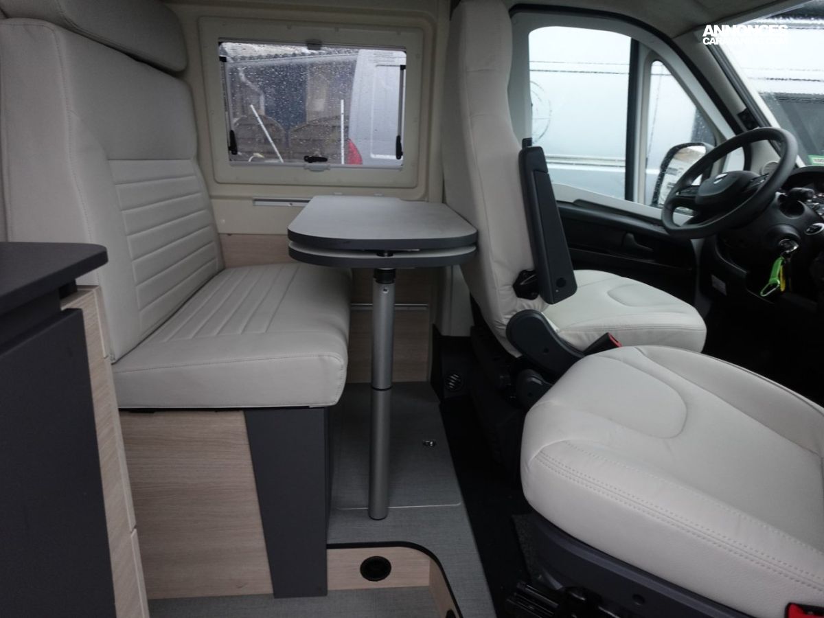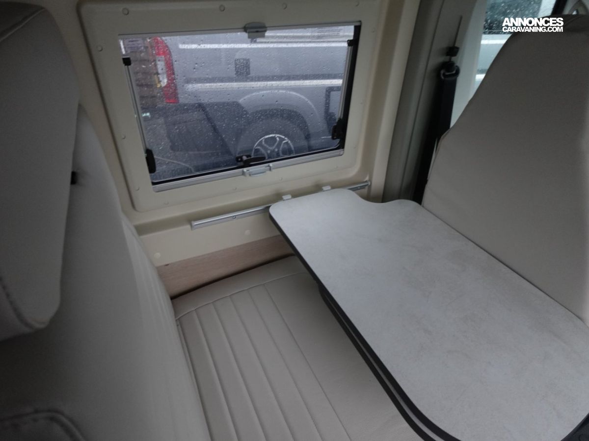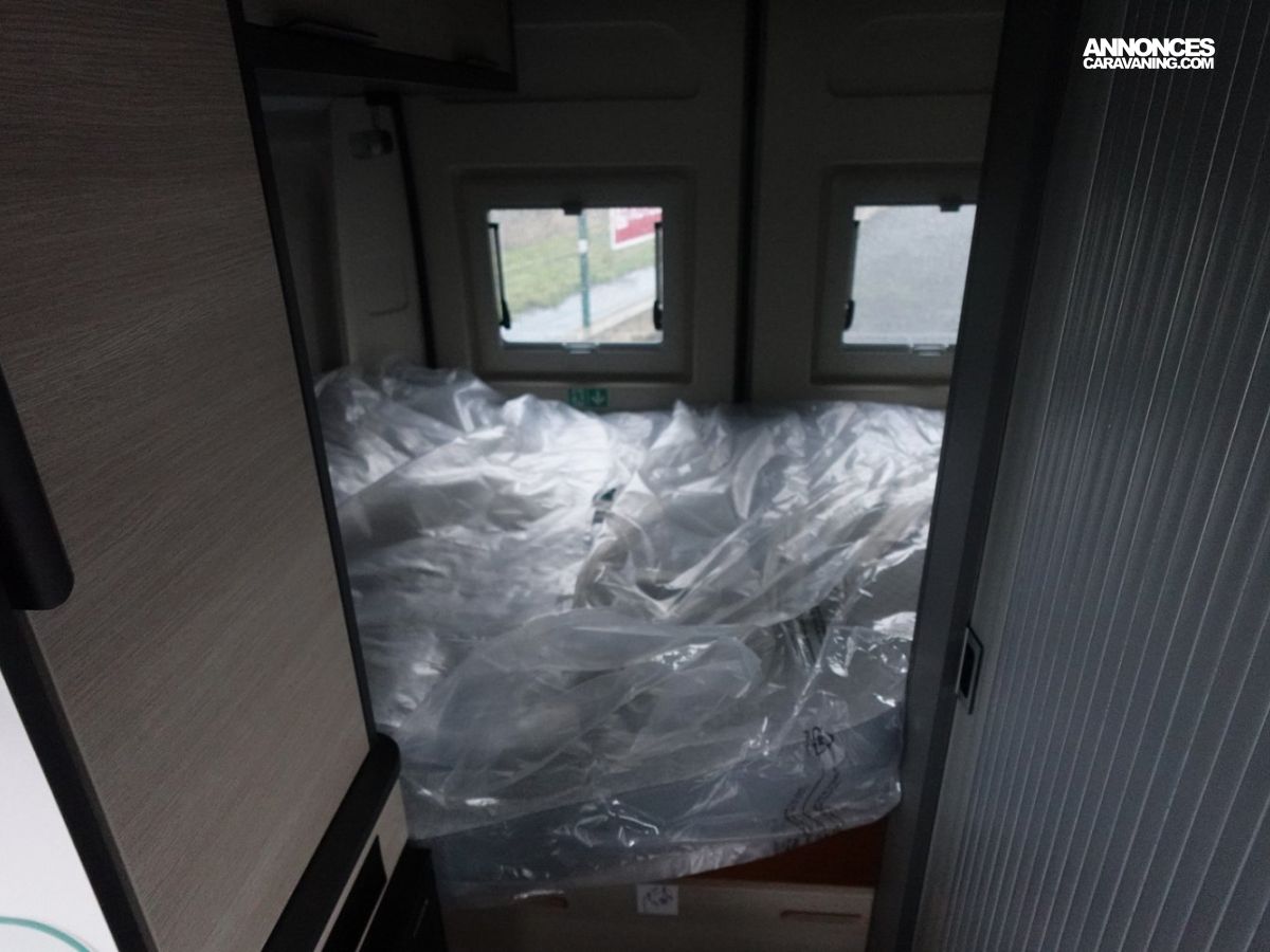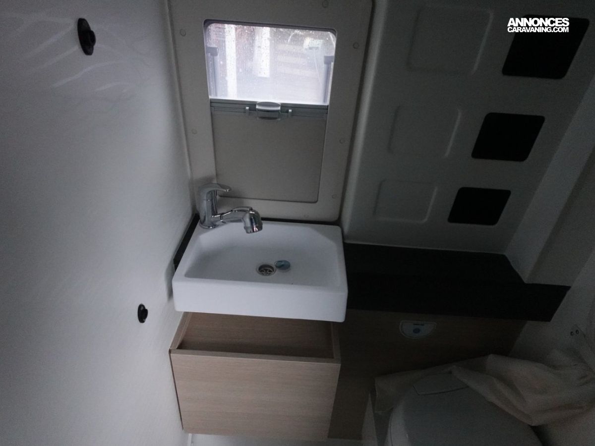 Fourgon aménagé comprenant un salon avant panoramique, un réfrigérateur, une salle d’eau avec douche et WC, un toit relevable avec couchage 2 places, une cuisine avec de nombreux rangements et un lit arrière transversal. Le tout en 5.41 m de long