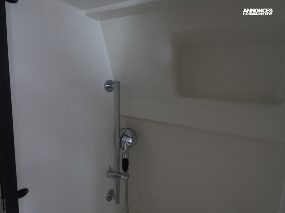 Fourgon aménagé comprenant un salon avant panoramique, un grand réfrigérateur, une douche indépendante de l’espace WC/lavabo, une cuisine avec de nombreux rangements et un lit arrière transversal.