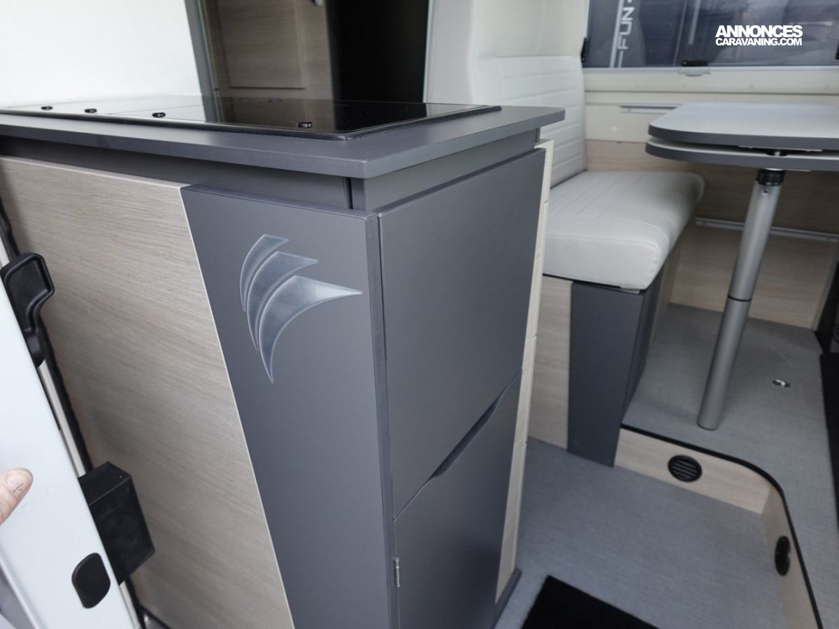 Fourgon aménagé comprenant un salon avant panoramique, un grand réfrigérateur, une douche indépendante de l’espace WC/lavabo, un toit relevable avec couchage 2 places, une cuisine avec de nombreux rangements et un lit arrière transversal.