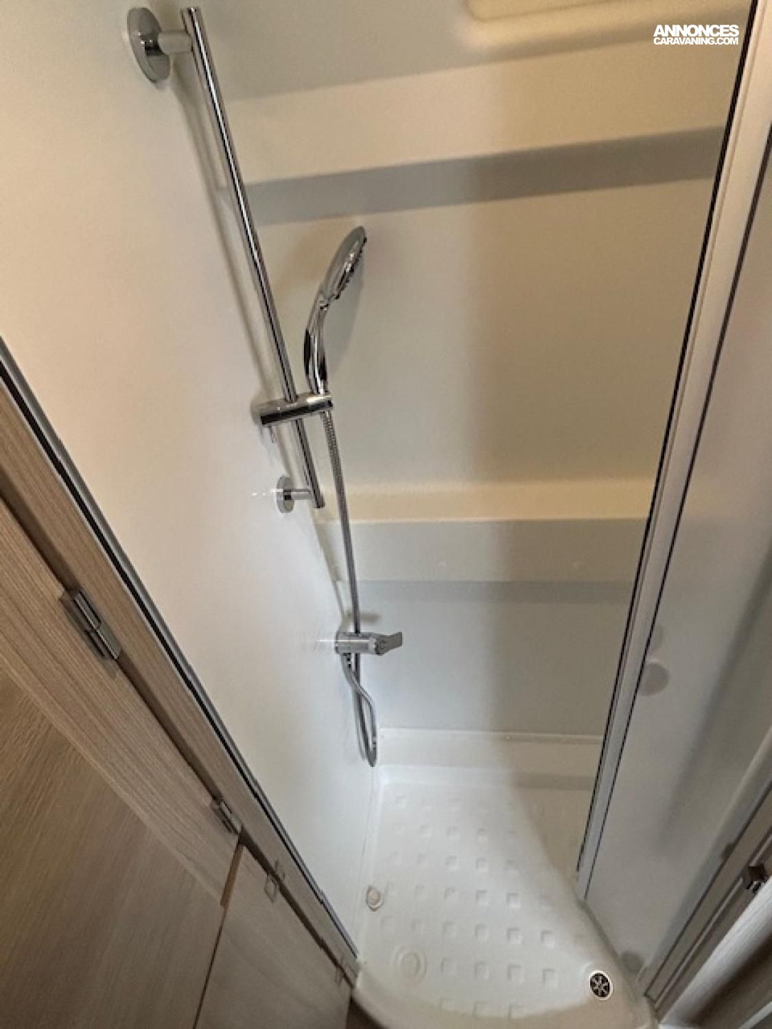 Ce fougon familial offre un grand espace salle d'eau transversal avec une cabine de douche.
