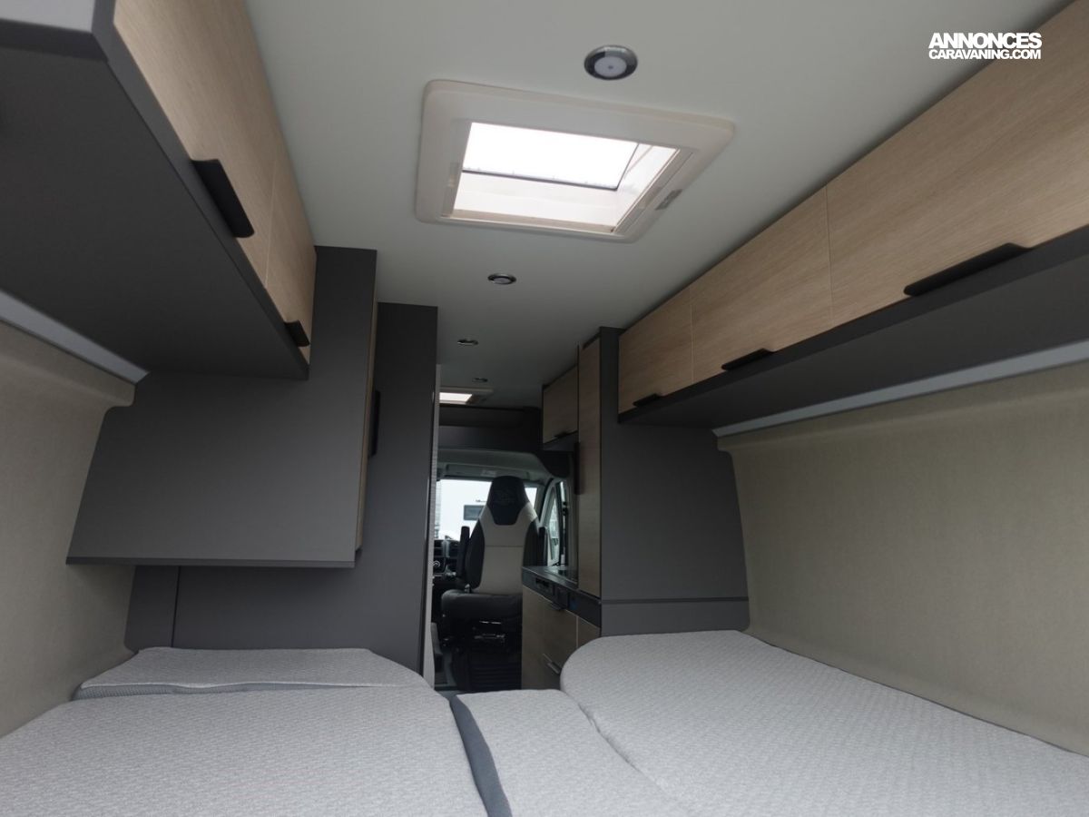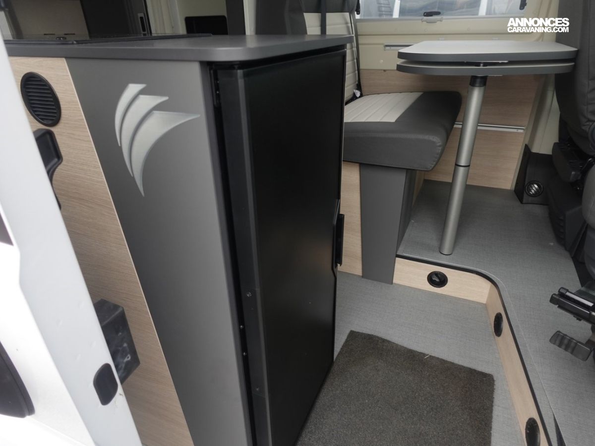 Fourgon aménagé comprenant un salon avant panoramique, un réfrigérateur, une salle d’eau avec douche et WC, une cuisine avec de nombreux rangements et des lits jumeaux.