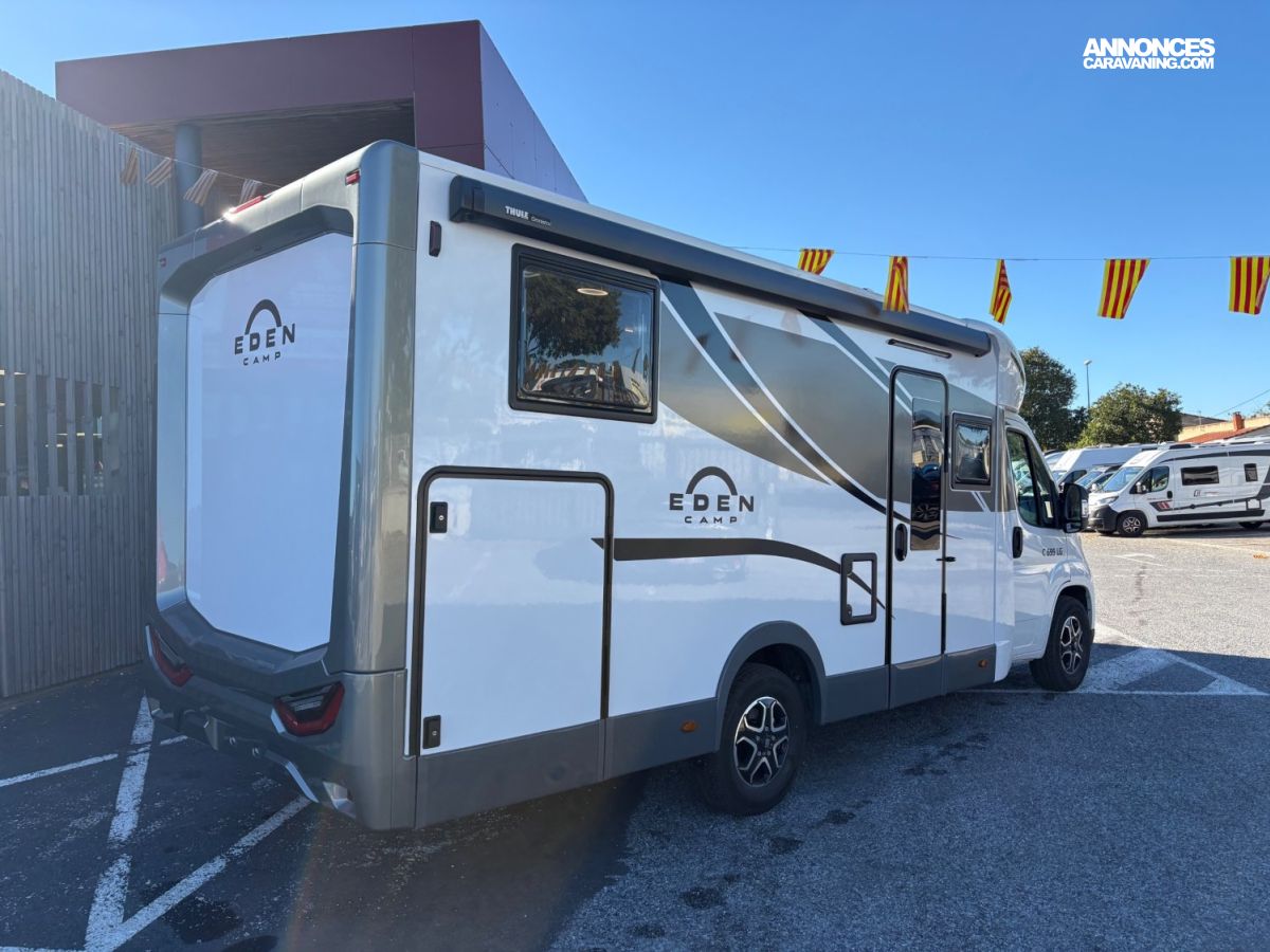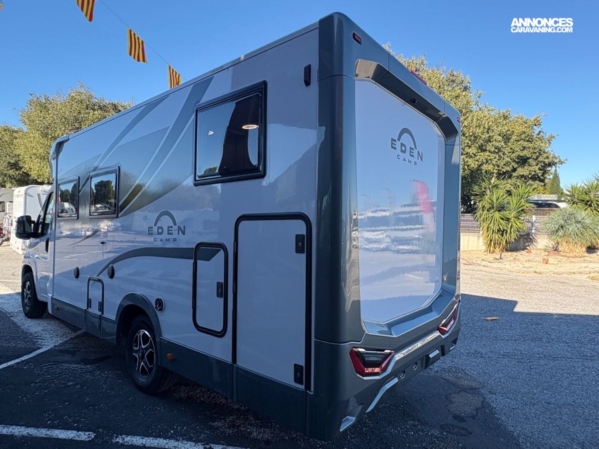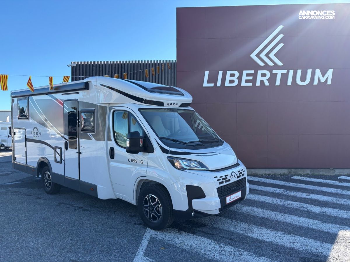 Le EDEN CAMP C 699 LG est un camping-car profilé conçu sur châssis Fiat Ducato équipé du moteur 2.2 Multijet de 140 chevaux, reconnu pour sa robustesse, son couple performant et sa consommation maîtrisée. Avec une longueur de 6,99 mètres, ce modèle se distingue par son excellente tenue de route et sa conception optimisée pour le confort et la fonctionnalité. Homologué 4 places carte grise et 4 couchages, il offre un aménagement intérieur ergonomique comprenant un grand lit jumeaux sur soute, un salon avant face face convivial, ainsi qu’une cuisine équipée et une salle d’eau modulable avec cabine de douche séparée. Le compartiment de soute spacieux permet le transport aisé de matériel volumineux, idéal pour les voyages longue durée.