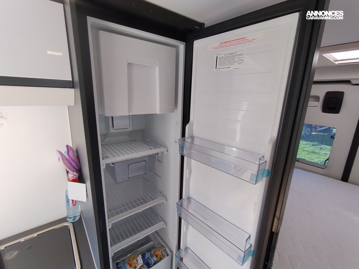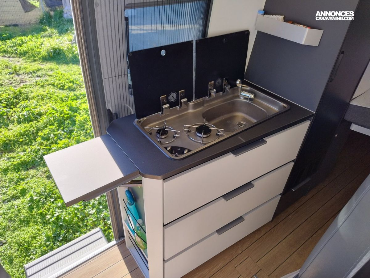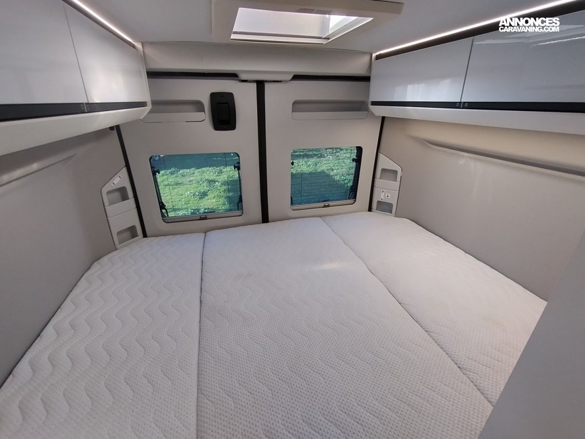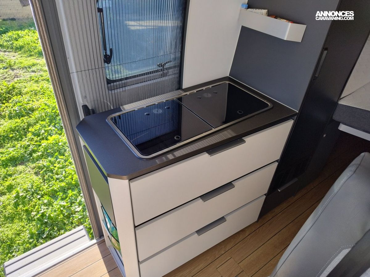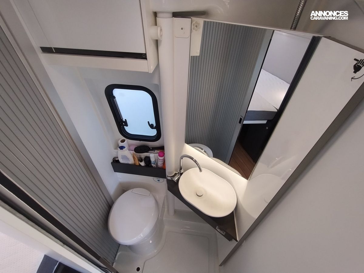 Son design moderne et lumineux grâce à son toit panoramique sont gages de séjours à bord très agréables. Vous pourrez profiter du coin cuisine équipé d’un frigo de grande capacité mais aussi d’une salle de bain astucieuse permettant de séparer douche et WC. Le tout associé à de très nombreux espaces de rangement.
