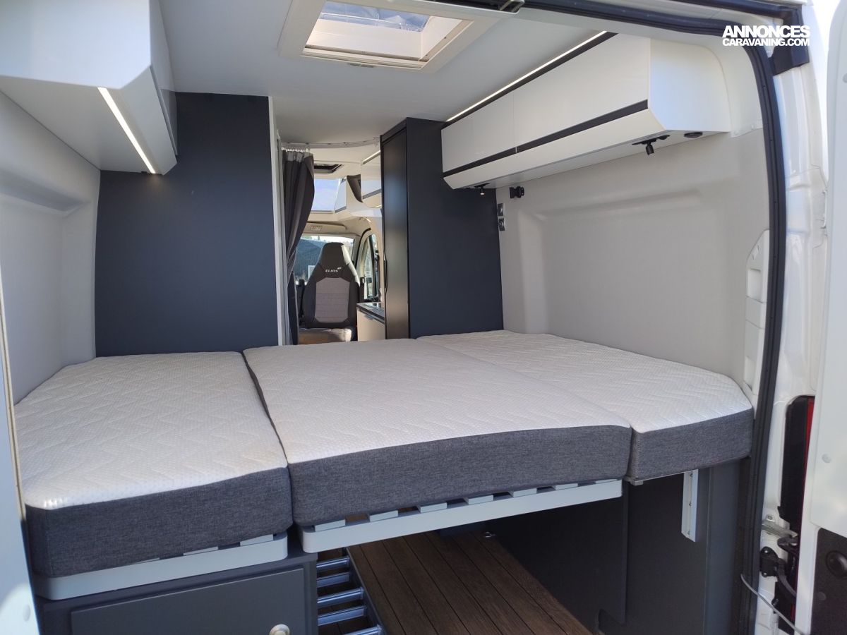 Ce fourgon compact vous accompagnera partout sans difficulté ! Il offre deux véritables espaces nuit : un lit transversal généreux (196 x 145 cm) et deux couchages supplémentaires dans le toit relevable (200 x 130 cm). Pour l’hiver son isolation performante et son chauffage TRUMA vous garantissent de belles et confortables nuits.