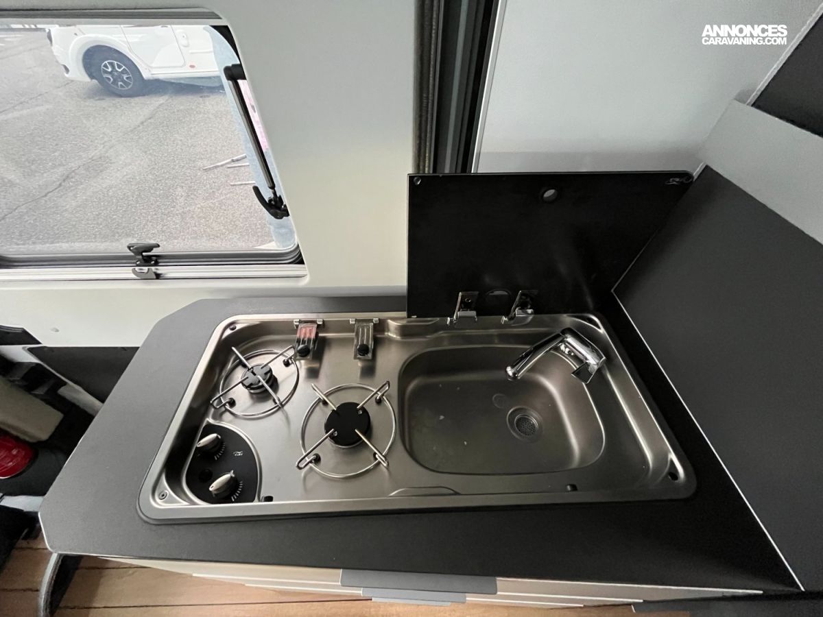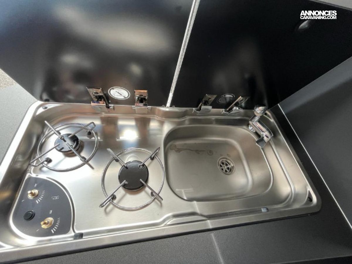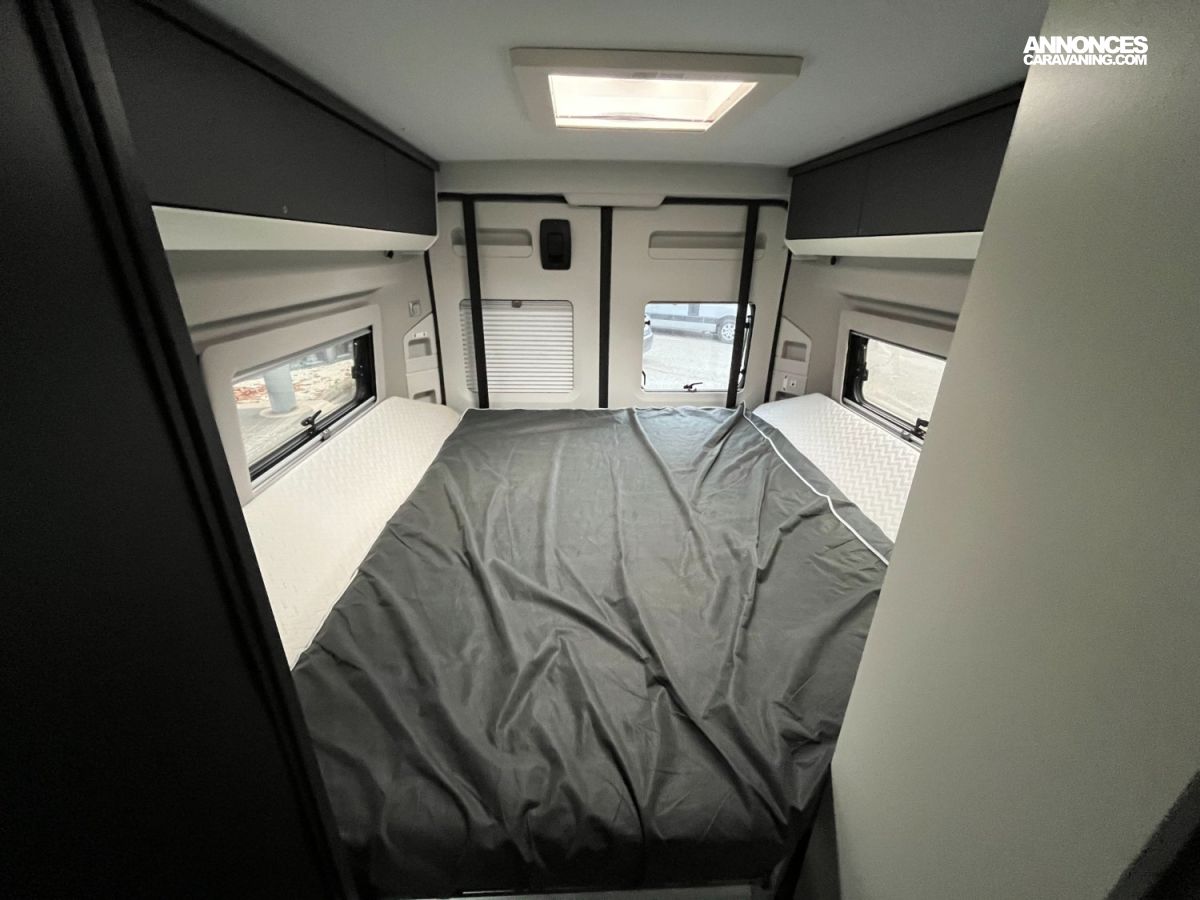 Fourgon aménagé moderne et haut de gamme (6.36 m). 4 places carte grise / 4 couchages. Motorisation 2.2 L – 140 ch sur porteur Fiat. Cuisine équipée, salle d’eau complète, chauffage Truma, grand frigo 138 L, nombreux rangements. Toit relevable Sky Lift innovant, design intérieur contemporain, excellente isolation et confort premium pour voyager en toute saison !