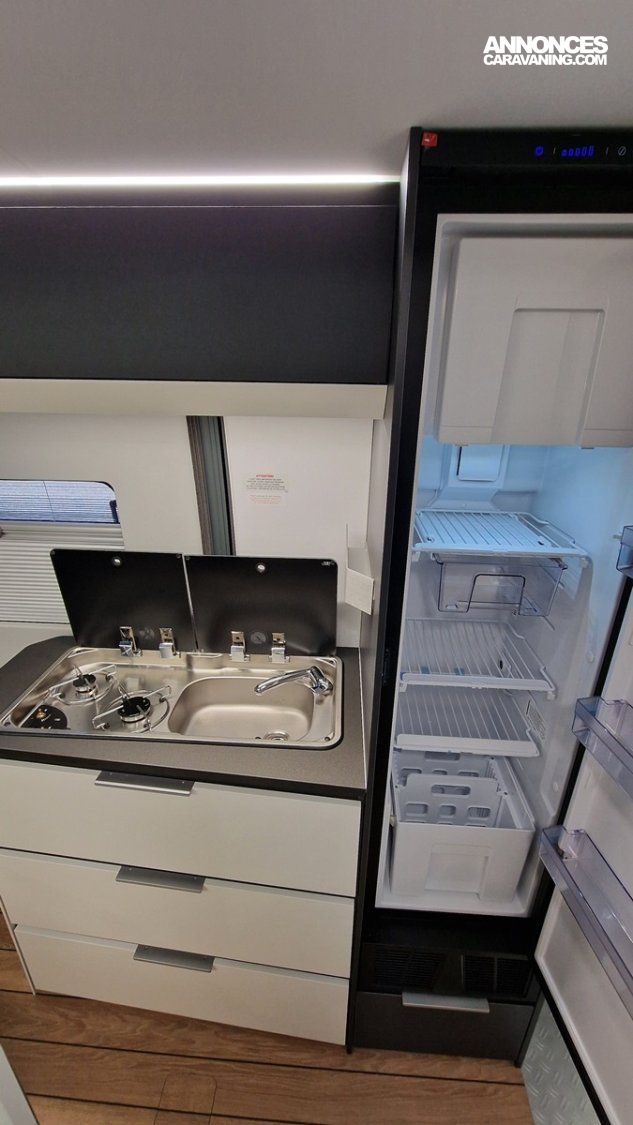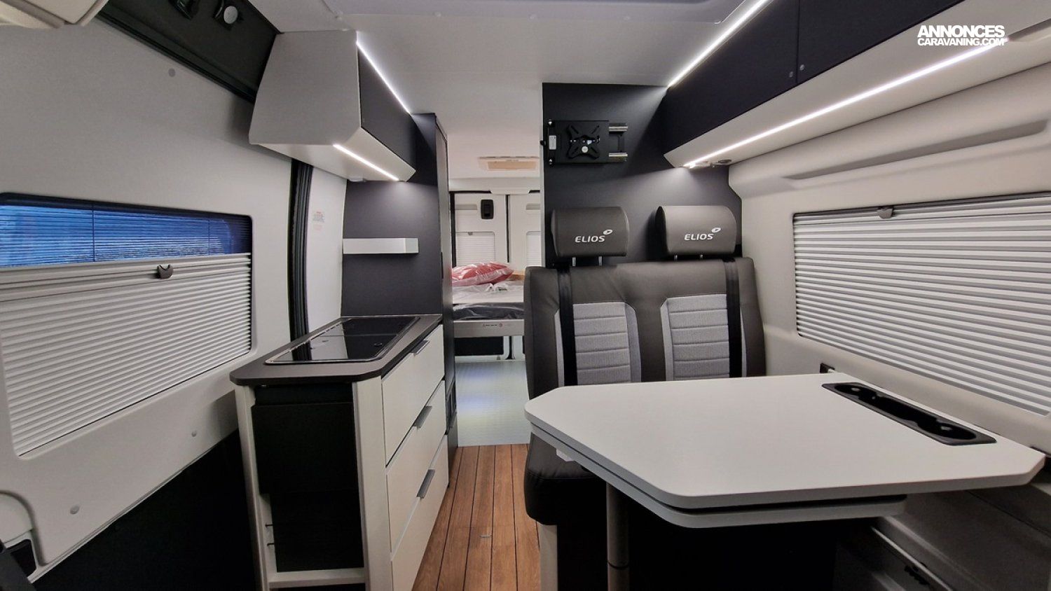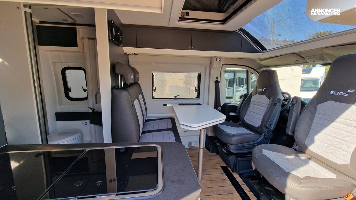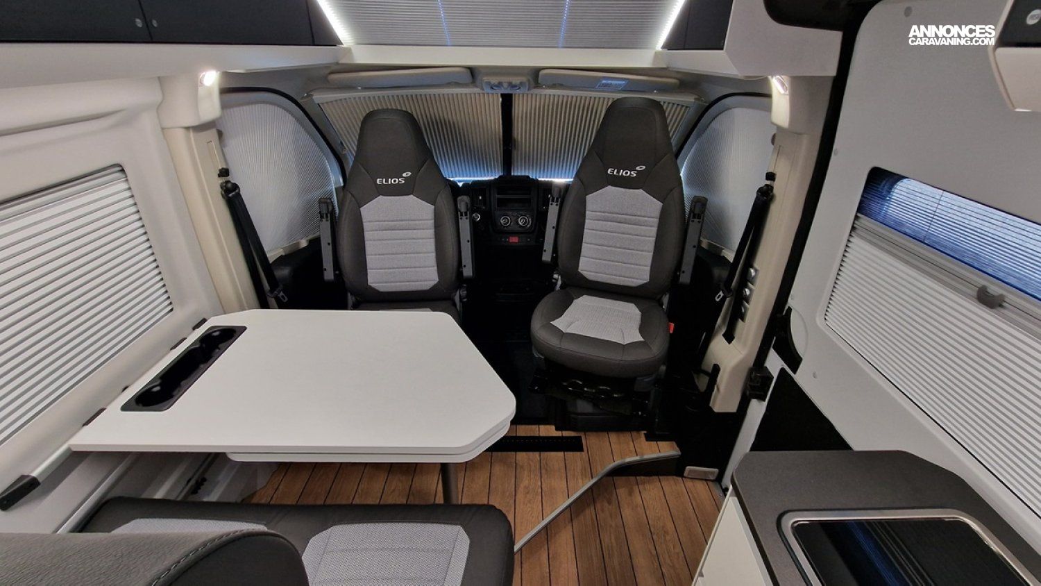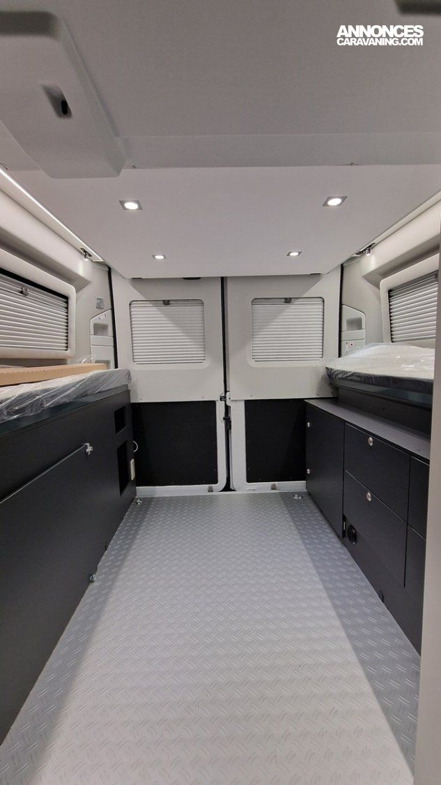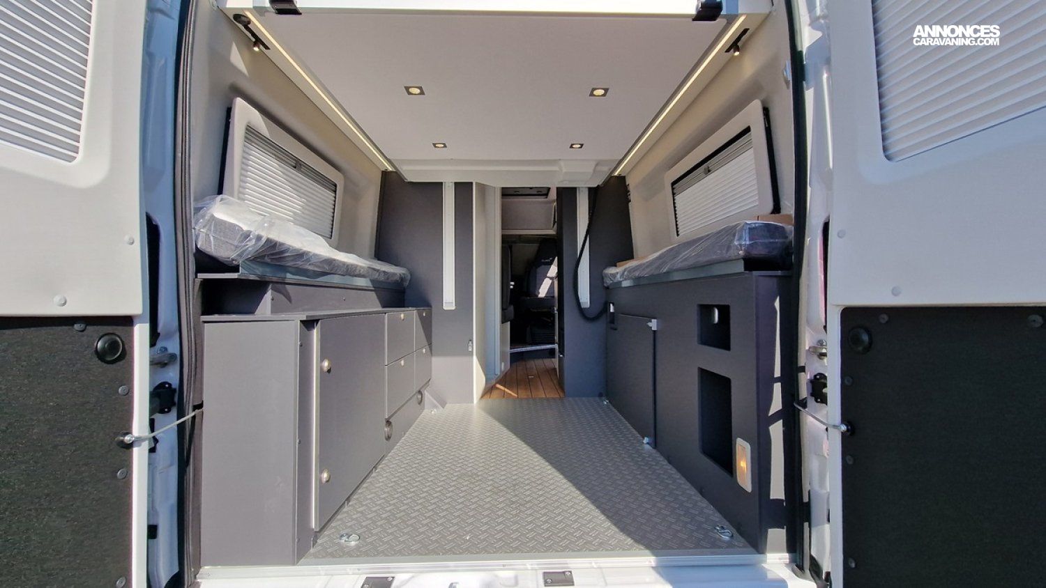 Déjà particulièrement spacieuse, avec sa grande soute arrière, cette implantation ici en version SKY-LIFT comporte un superbe toit relevable transformant à l’étape ce remarquable van en un quatre places couchage grand confort.
