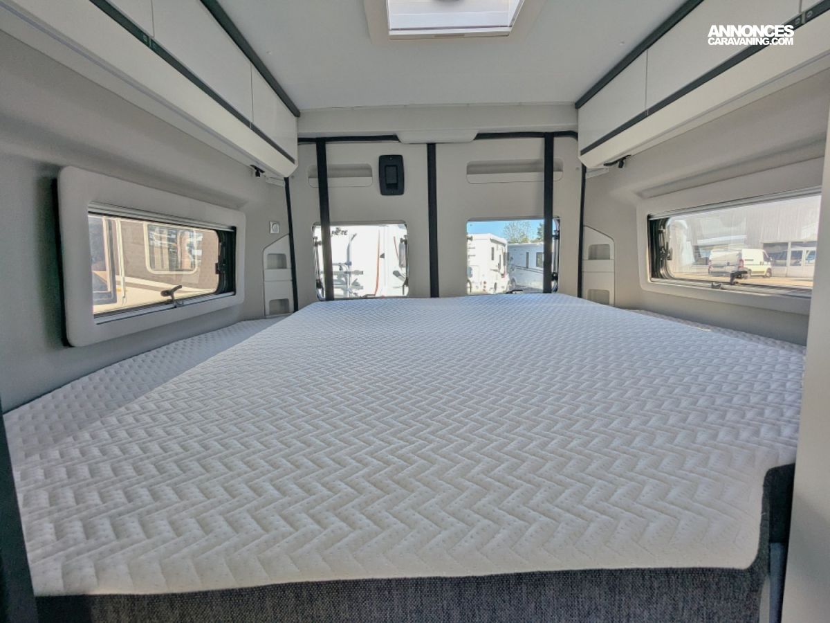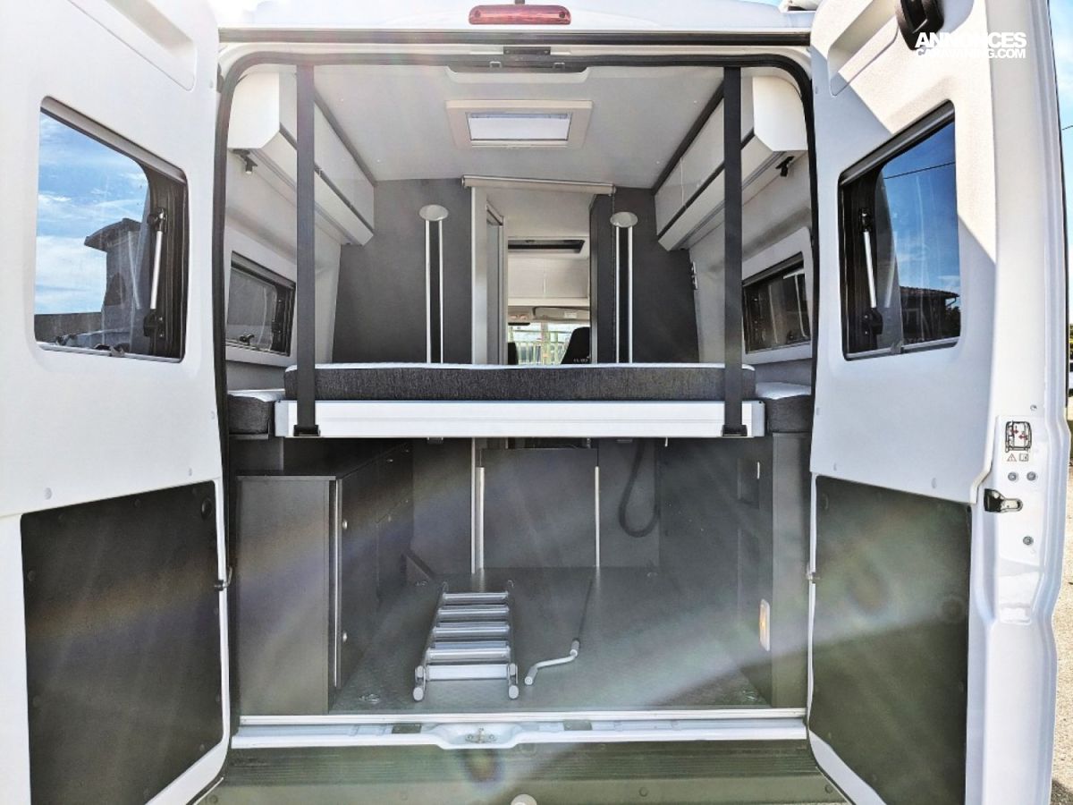 Fourgon aménagé à toit relevable en très bon état sur Citroen 2,2 HDi 140 CV BV6 avec salle d'eau vario comprenant WC et douche séparés par une paroi pivotante, cuisine latérale avec frigo conservateur 138 L et plaque de cuisson 2 feux, et salon avant avec sièges pivotants. Ce modèle se distingue par son lit XXL qui se relève électriquement et laisse place à un garage de grande capacité. Le toit relevable peut également accueillir 2 personnes.