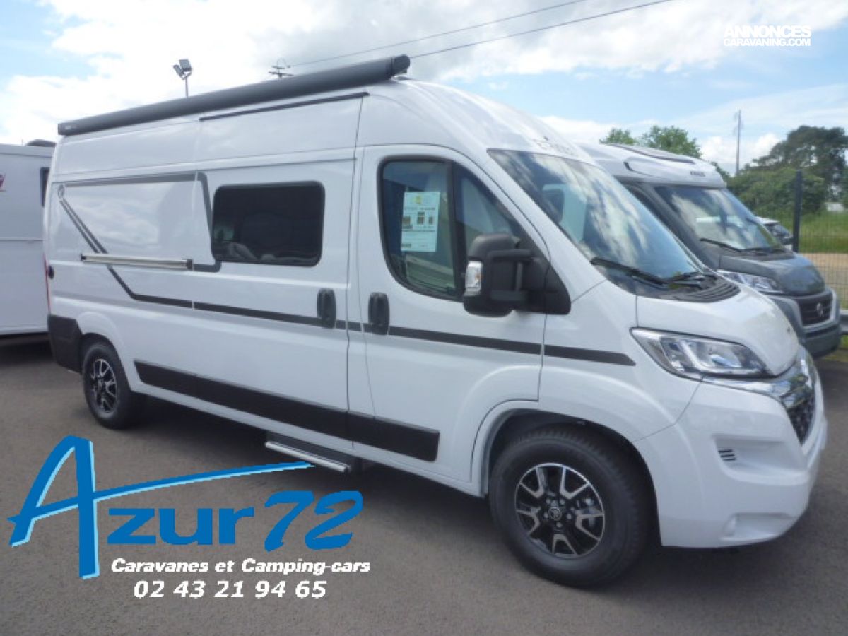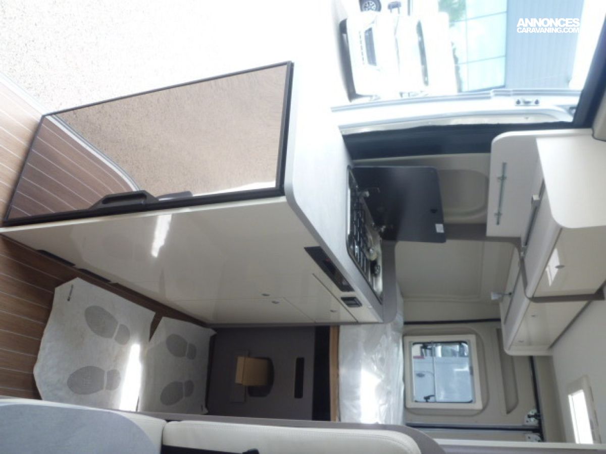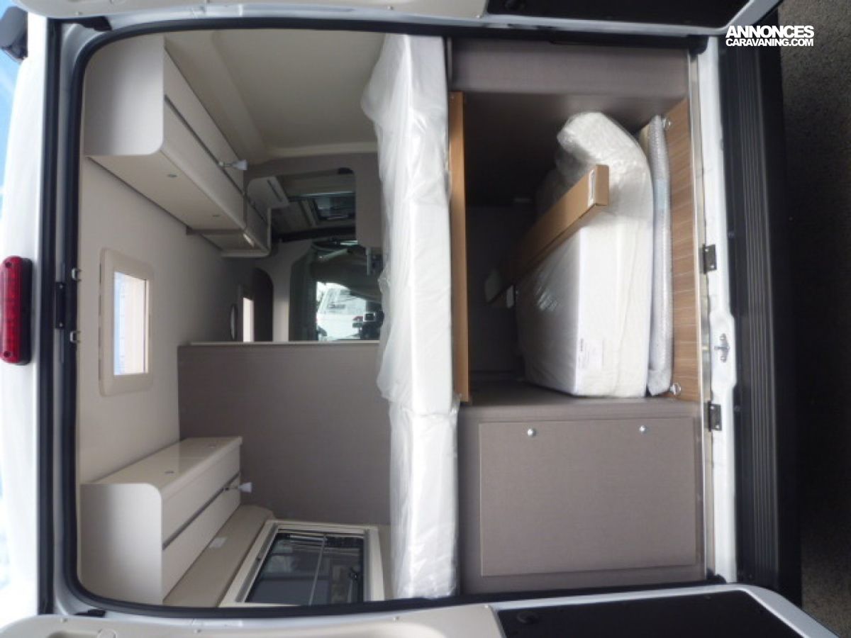 Bac de douche, Cuisine en long, Lit arrière transversal, Lit dînette avant, Salon avant sièges pivotants, WC Cassette.