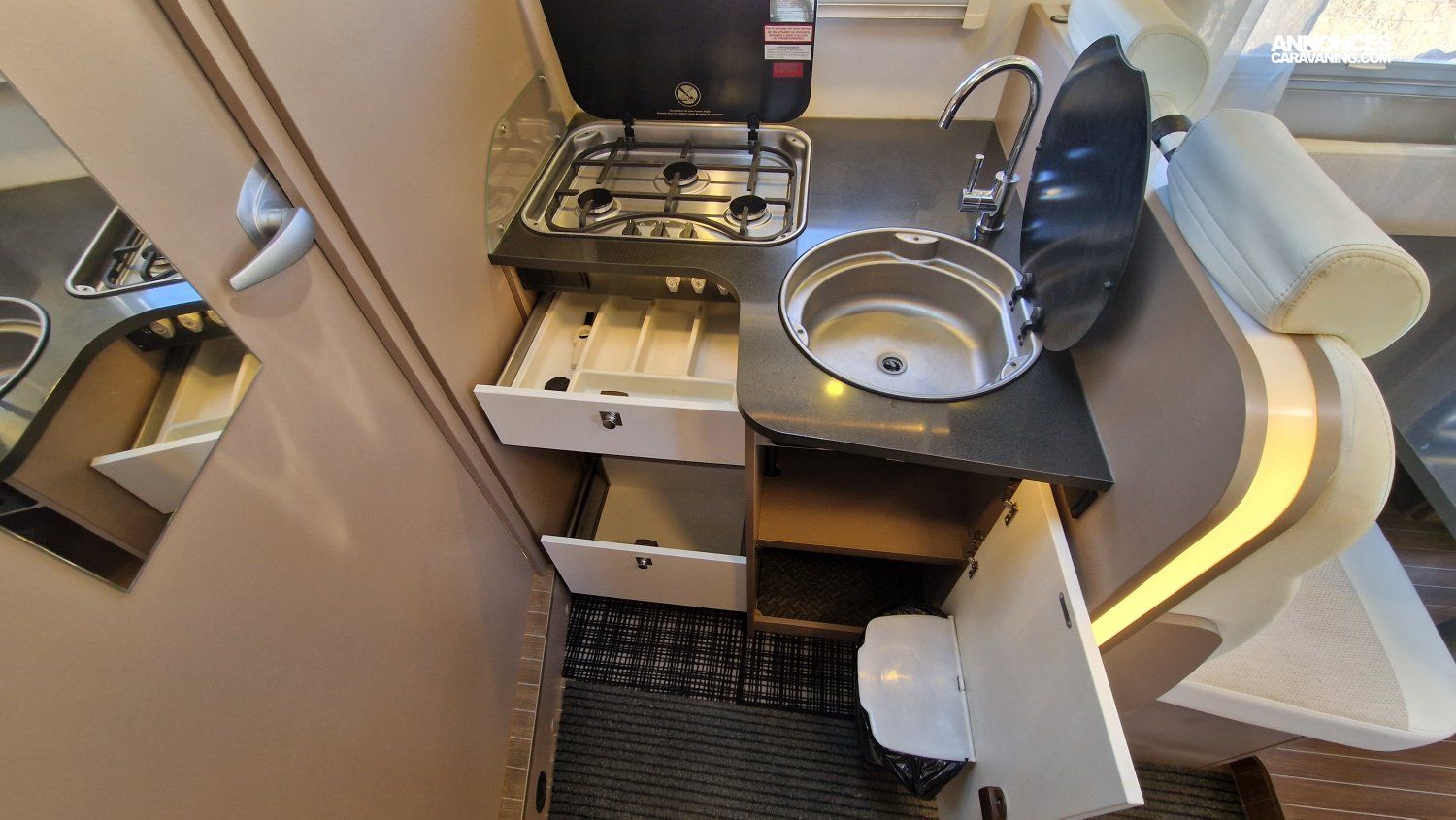 Profitez d’une implantation idéale pour un couple et plus à l’occasion : grand lit central permanent et lit de pavillon douillet, un bloc cuisine fonctionnel et bien équipé pour concocter de bons petits plats et les partager en toute convivialité dans un salon à vue panoramique. Un spa privé bien agencé avec espace de douche et cabinet de toilettes indépendants pour préserver votre intimité vient compléter la dotation.