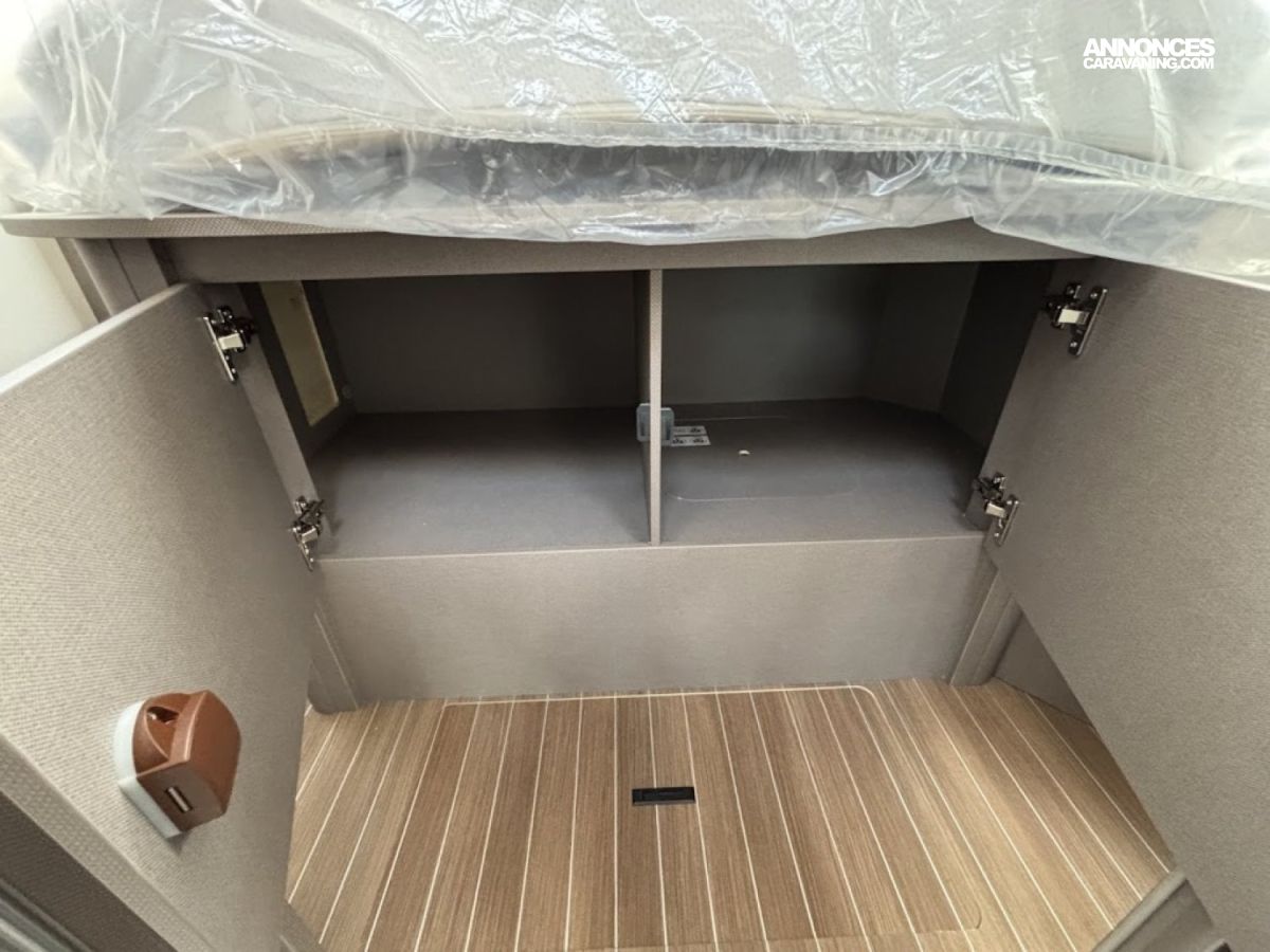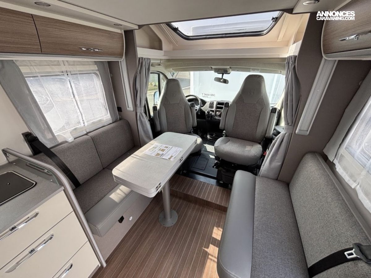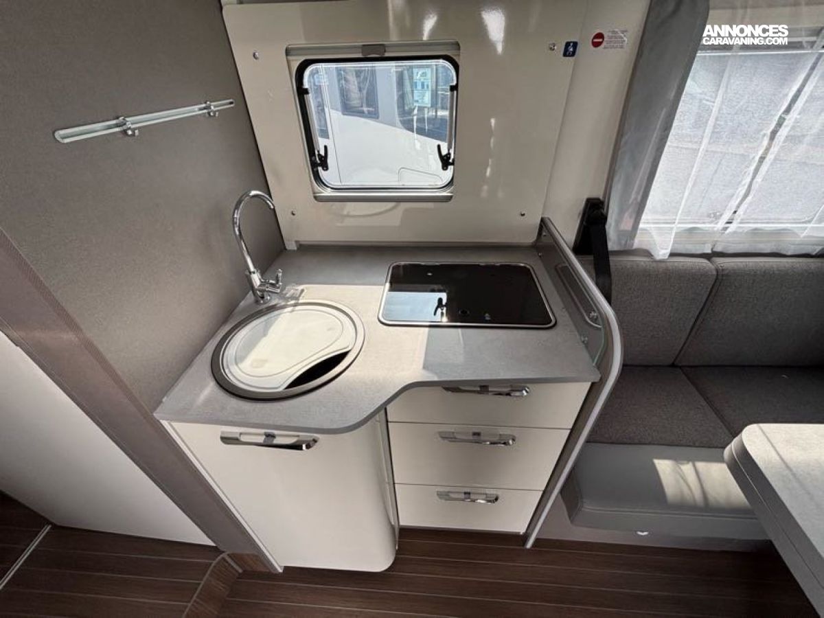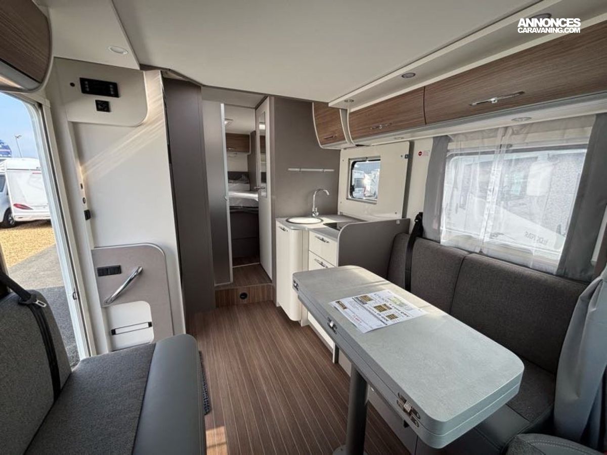 Cuisine en L, Douche indépendante, Lit central, lit pavillon, Salon avant banquettes face à face, Salon avant sièges pivotants, Soute.