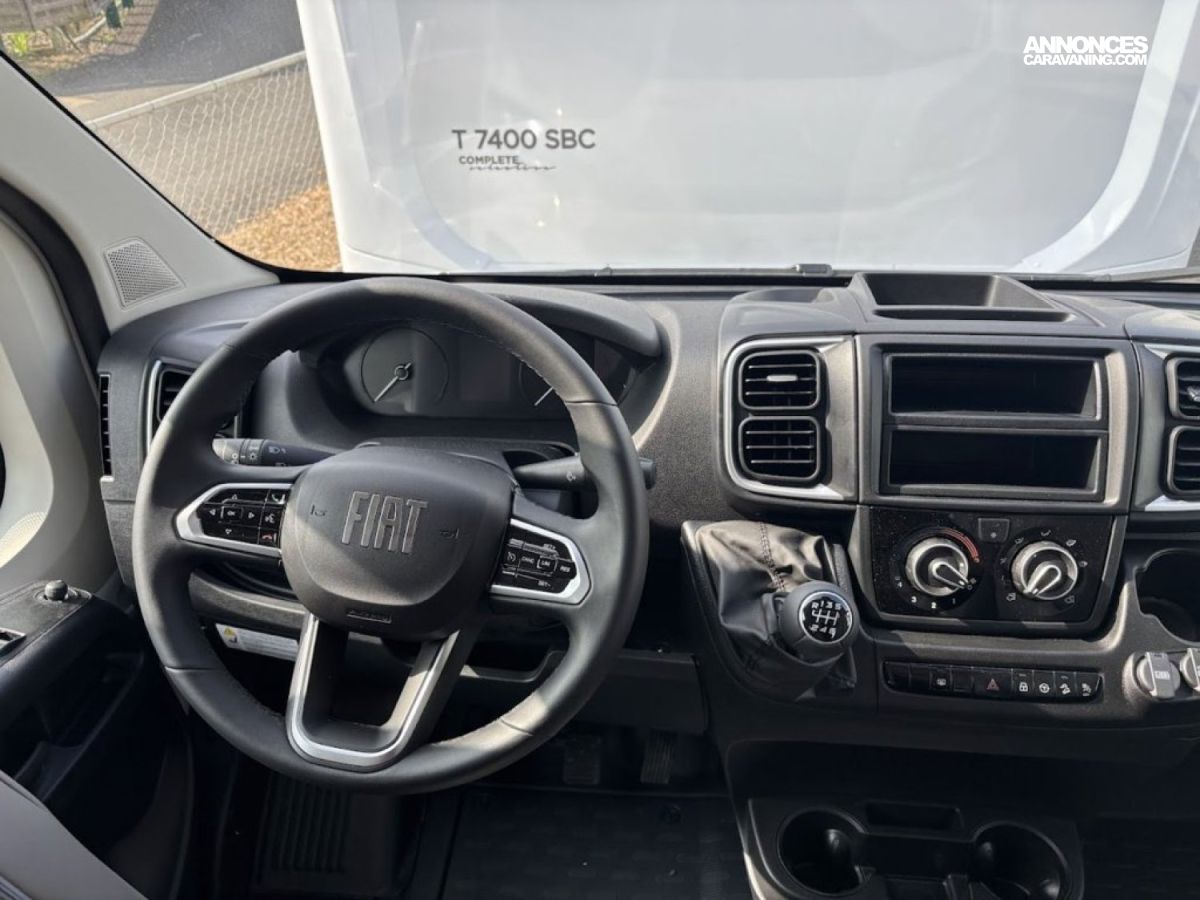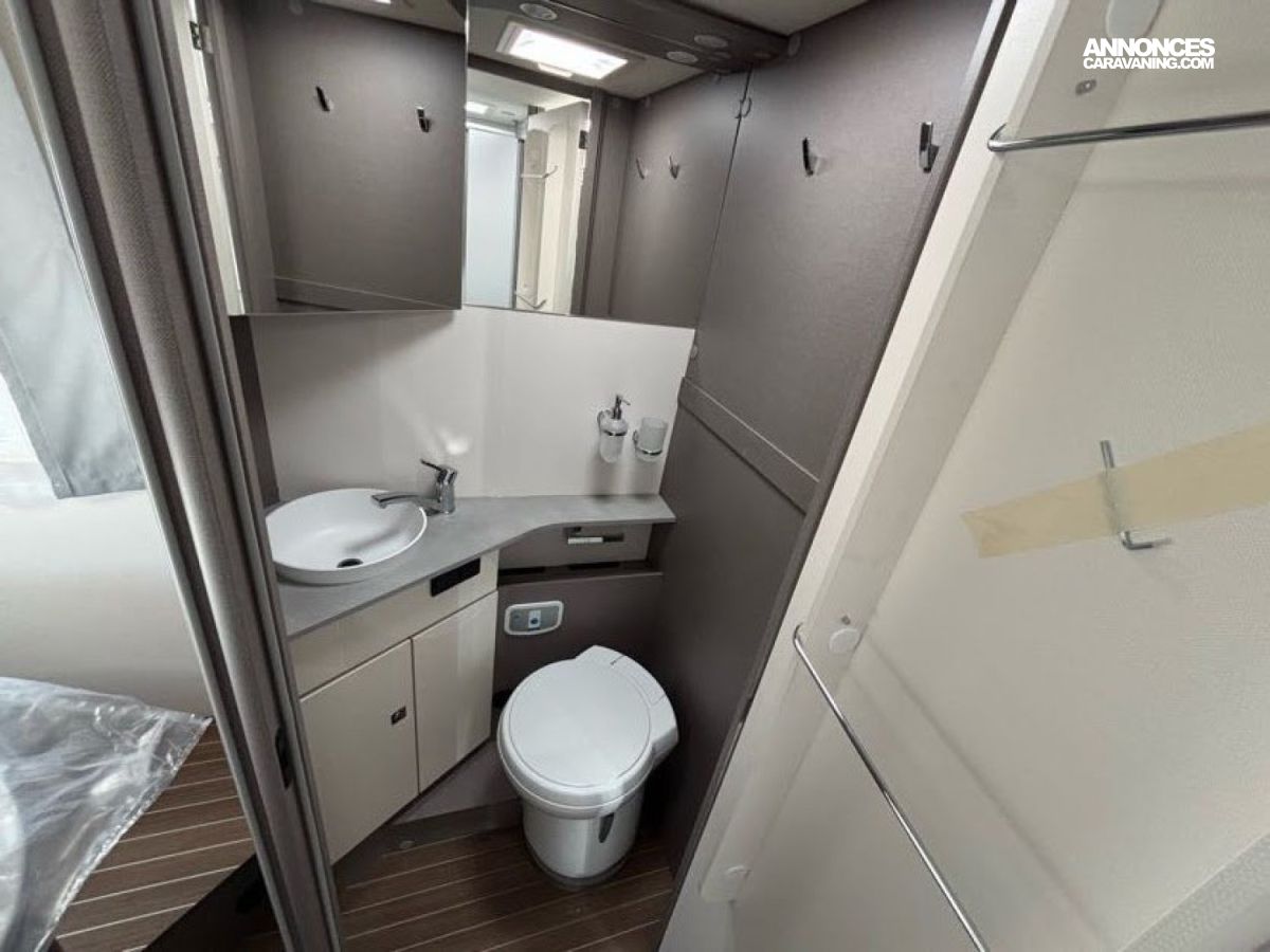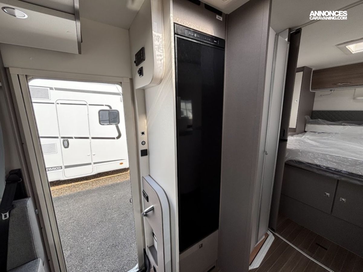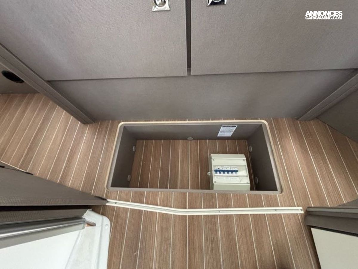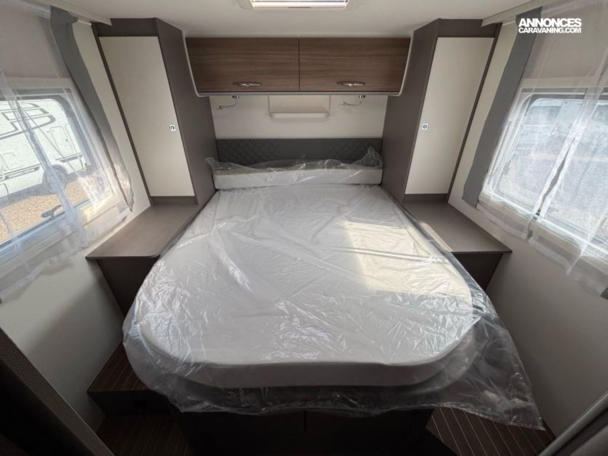 Cuisine en L, Douche indépendante, Lit central, lit pavillon, Salon avant banquettes face à face, Salon avant sièges pivotants, Soute.