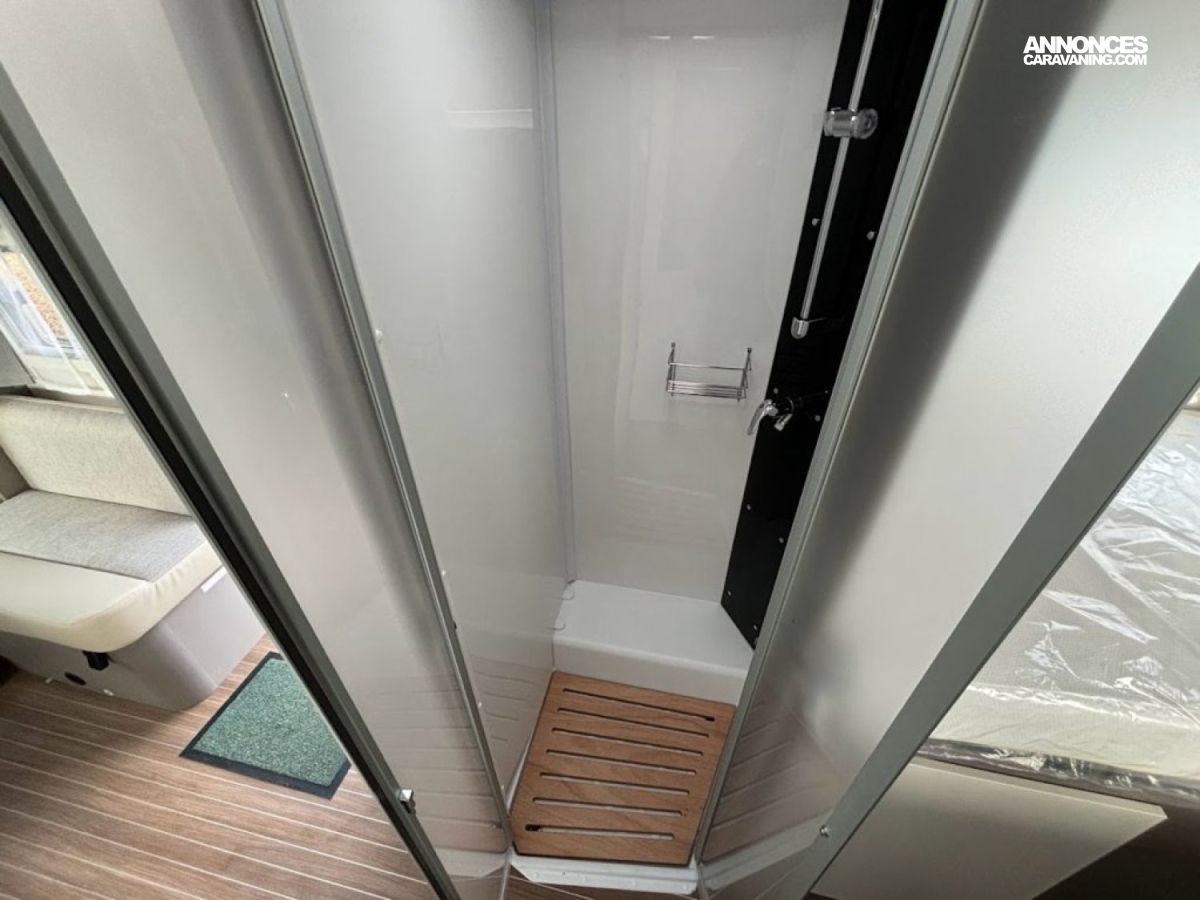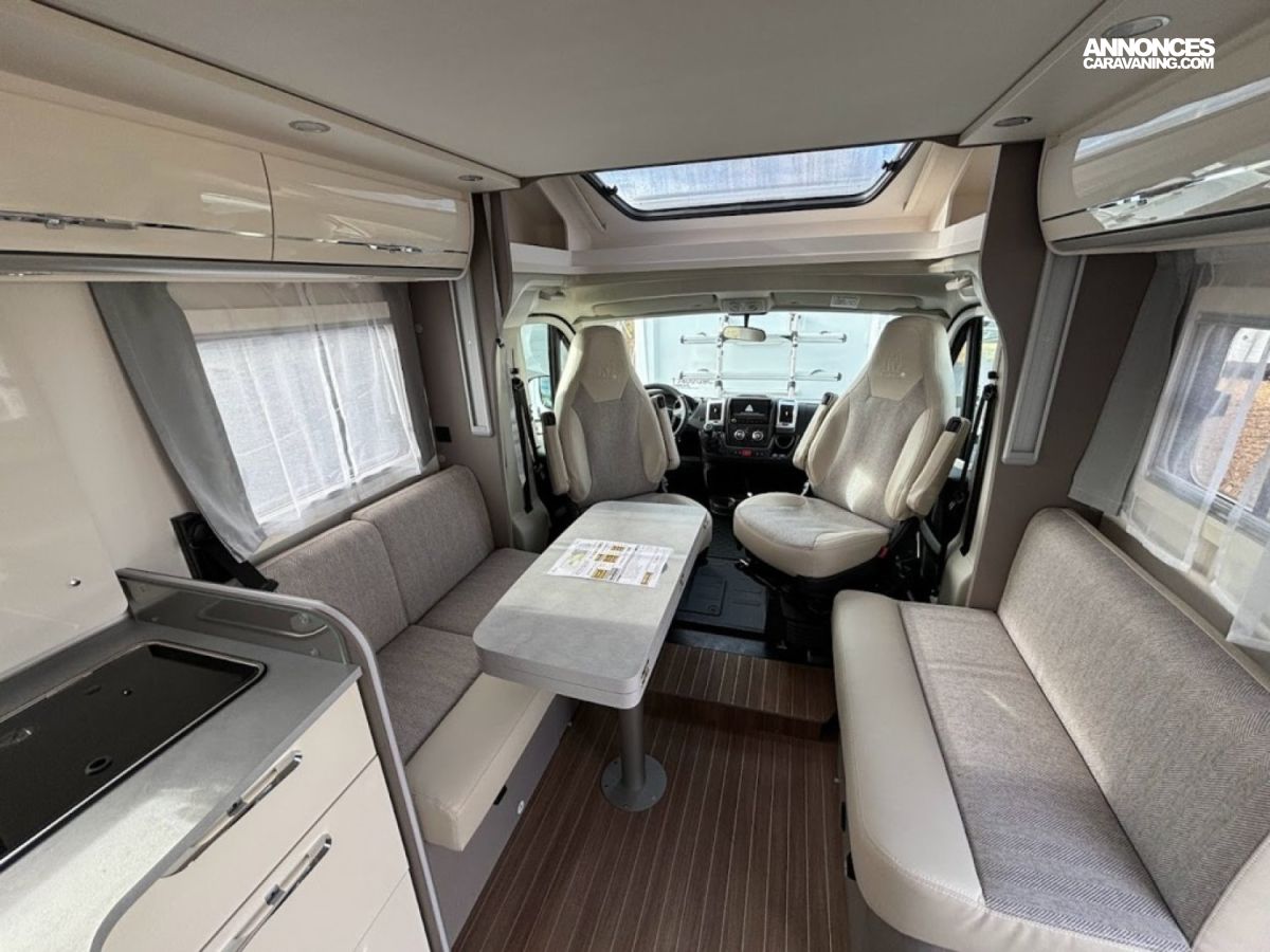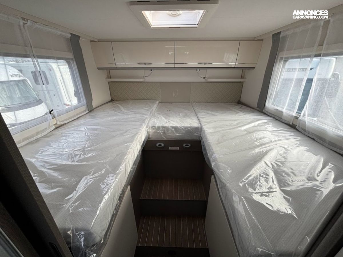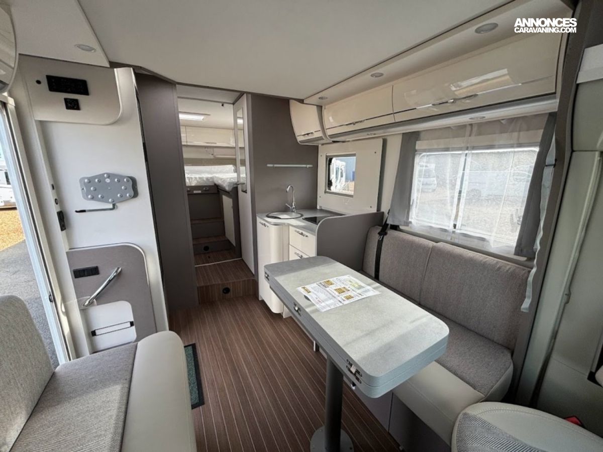 Cuisine en L, Douche indépendante, Grande soute, lit jumeaux, lit pavillon, Salon avant sièges pivotants, Salon en L, WC Cassette.