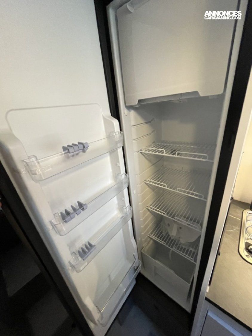 La cuisine est fonctionnelle et bien pensée, équipée d’un réfrigérateur à compression de 135 L.