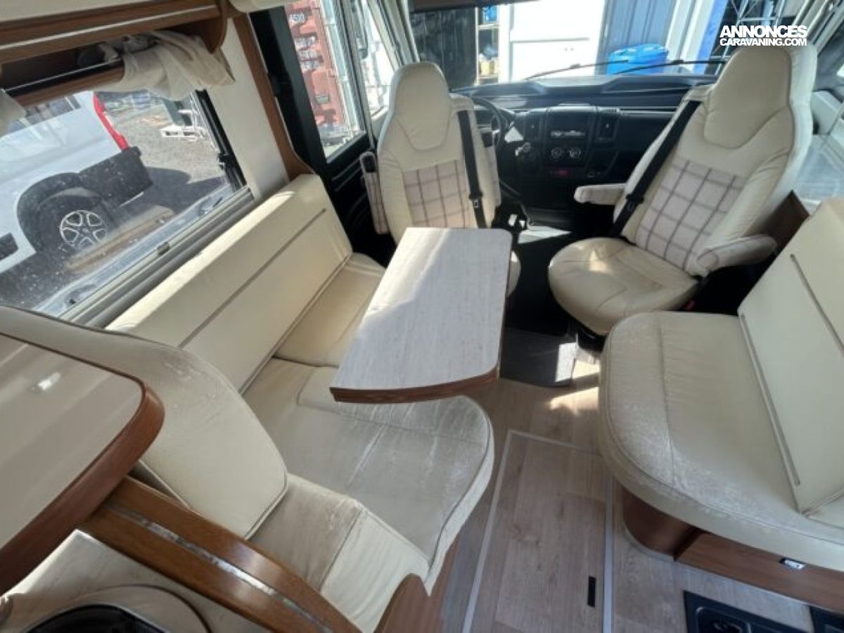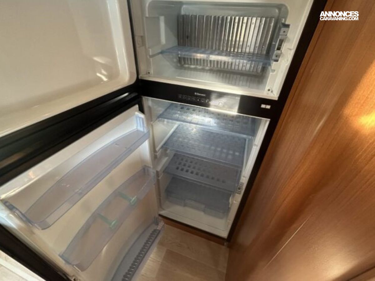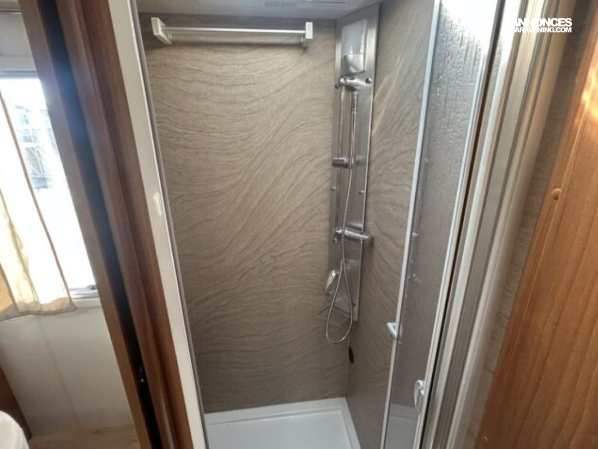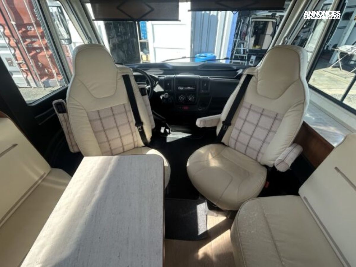 Implanté sur un Fiat Ducato 2.3 L diesel 150 ch avec châssis AL-KO, il combine stabilité et agrément de conduite. L’intérieur propose un grand salon, une cuisine équipée avec réfrigérateur d’environ 150 à 160 L, ainsi qu’une salle d’eau avec douche et WC séparés. Côté autonomie, il dispose d’environ 150 L d’eau propre et 119 L d’eaux usées, idéal pour les voyages prolongés.