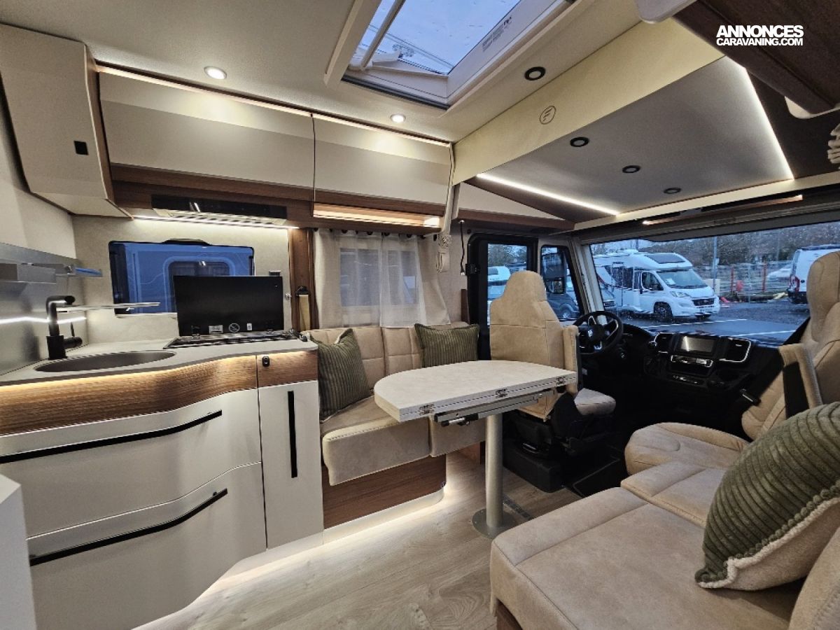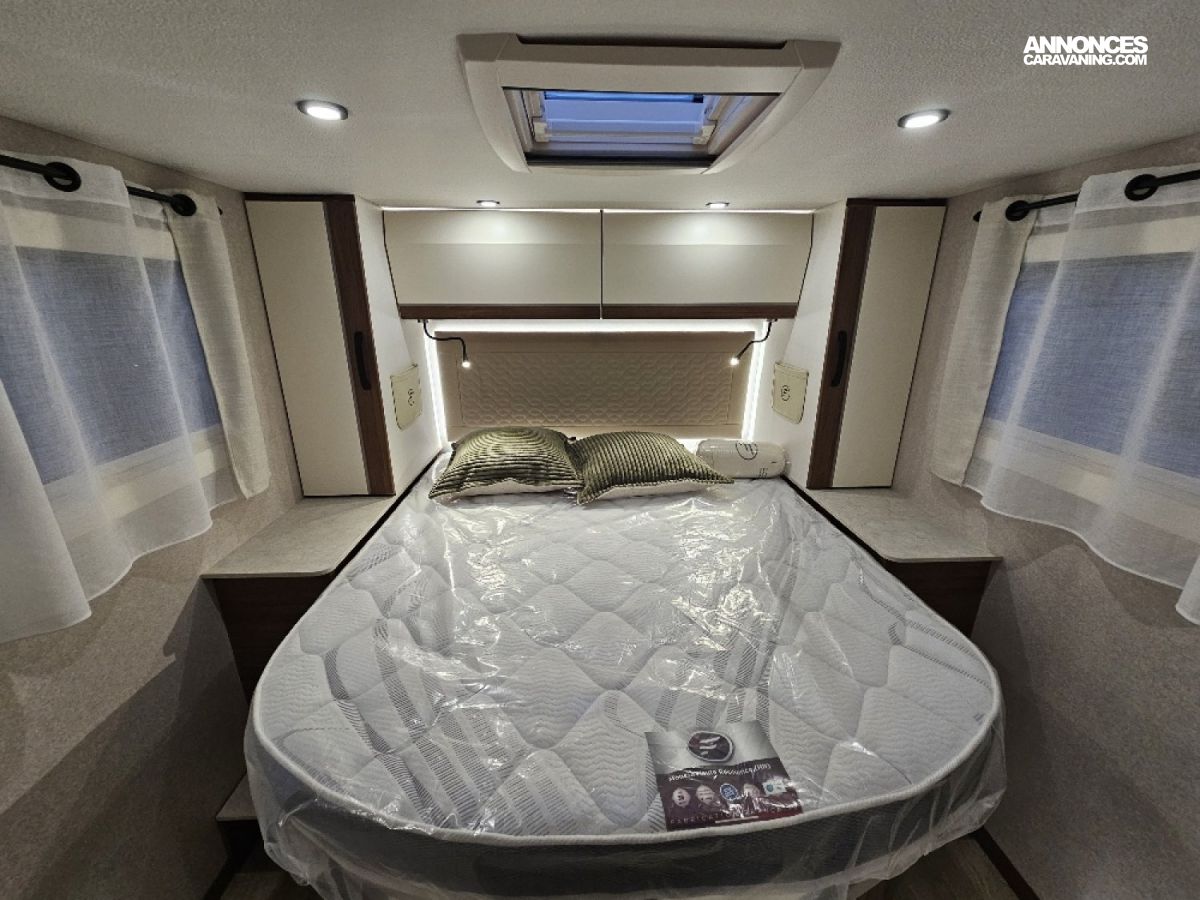 SERIE WELLNESS, Chassis ALKO, Double plancher, Literie haut de gamme, Lit central réglable électriquement, Pack lounge : Clim auto / Chargeur induction / combiné tableau de bord 100% numérique, Truma 6000 DE, Batterie Lithium 150 Ah + DC/DC60Ah, Plancha forge Adour