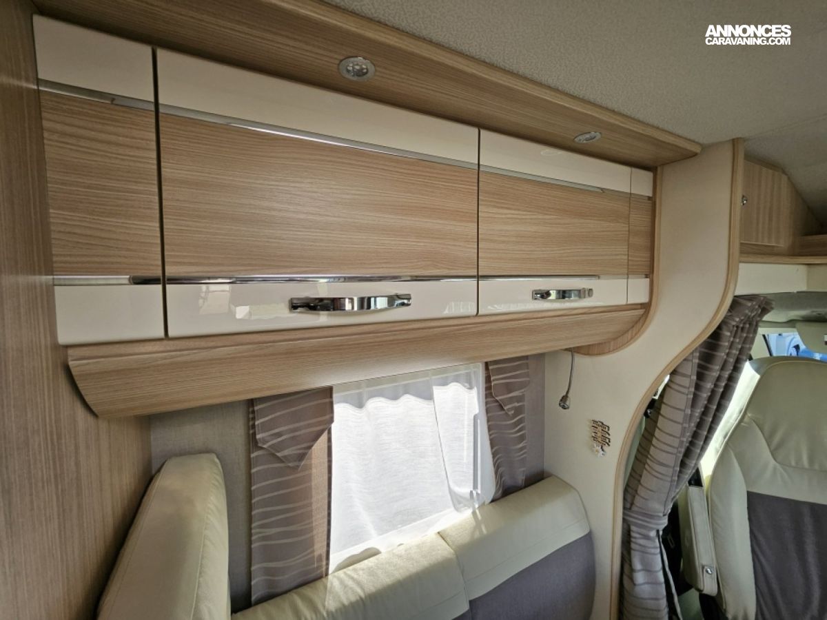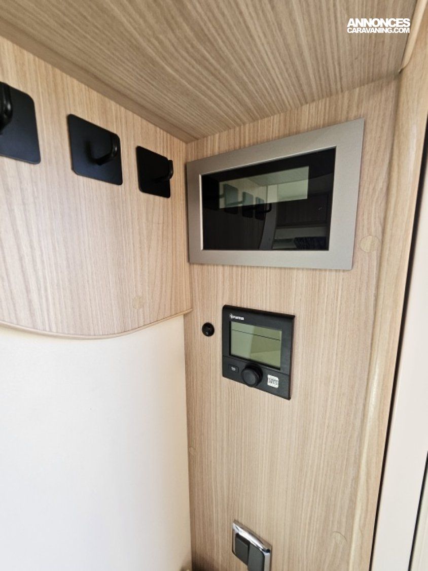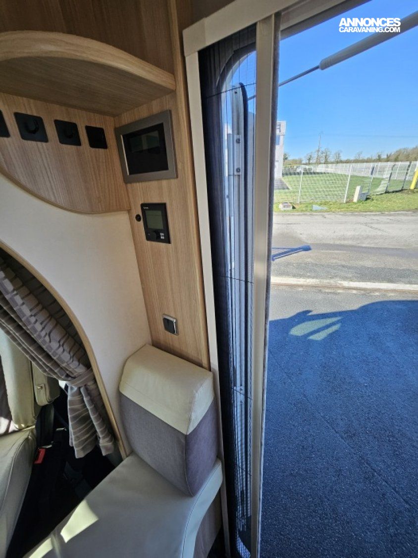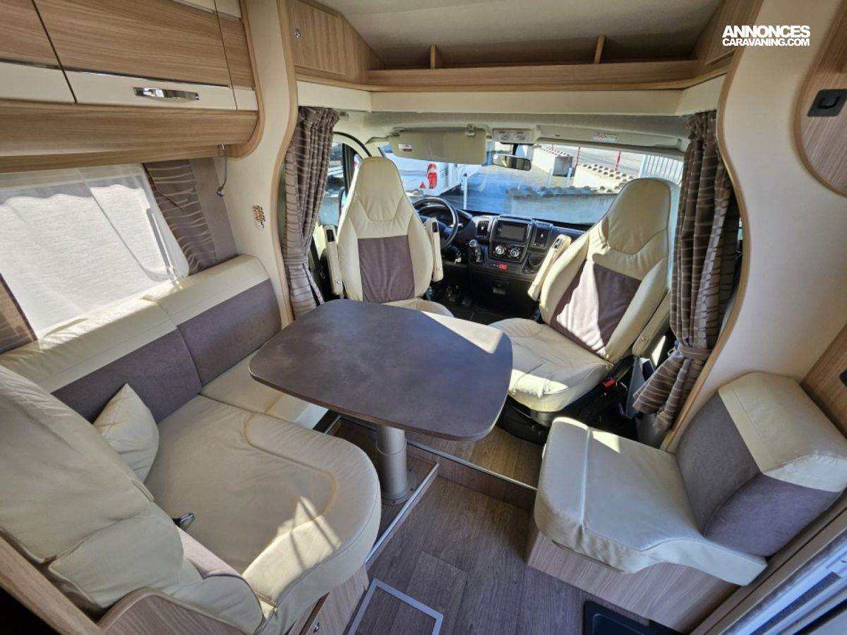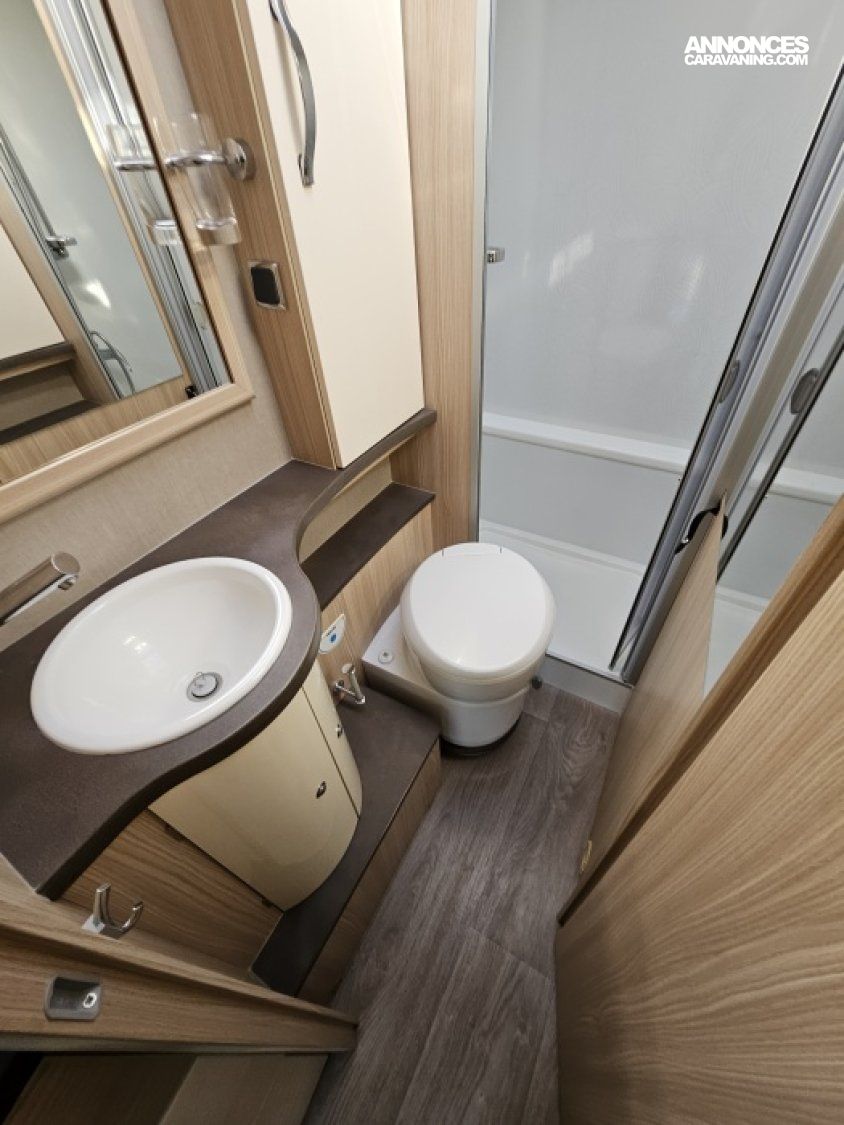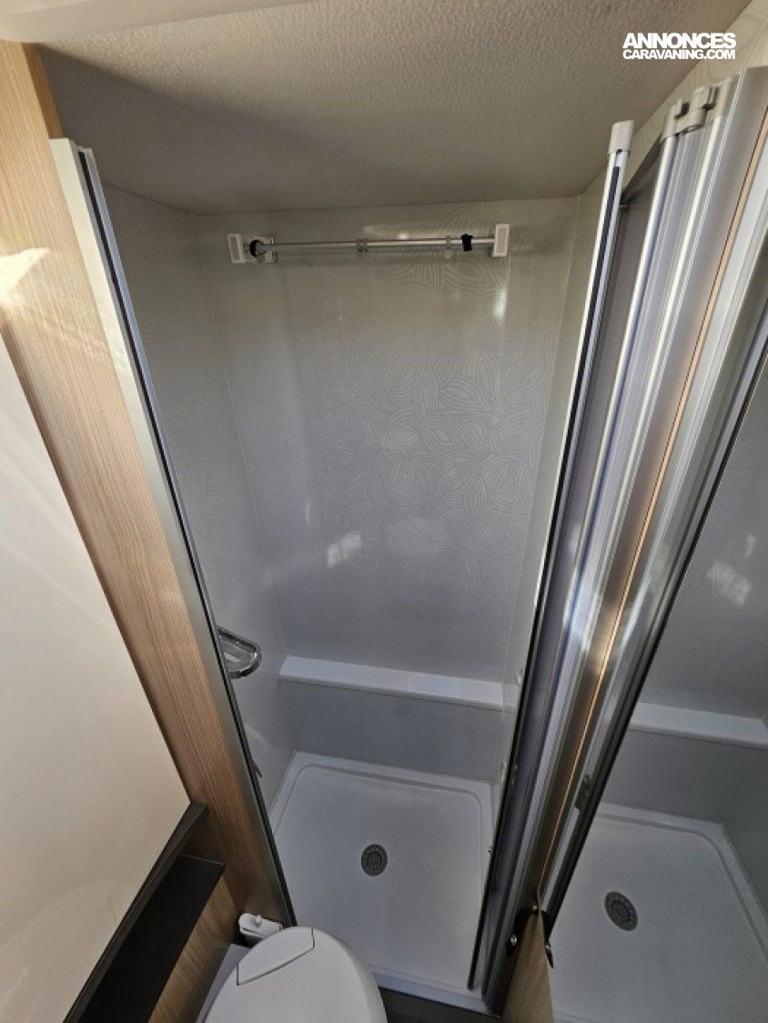 - sièges confort pivotants réglables en hauteur - poignées de meuble finition chrome – salon 4 places -soute de rangement sous lit – salle d’eau Cabine de douche séparée – réfrigérateur 145L - chauffage TRUMA - lit à la française