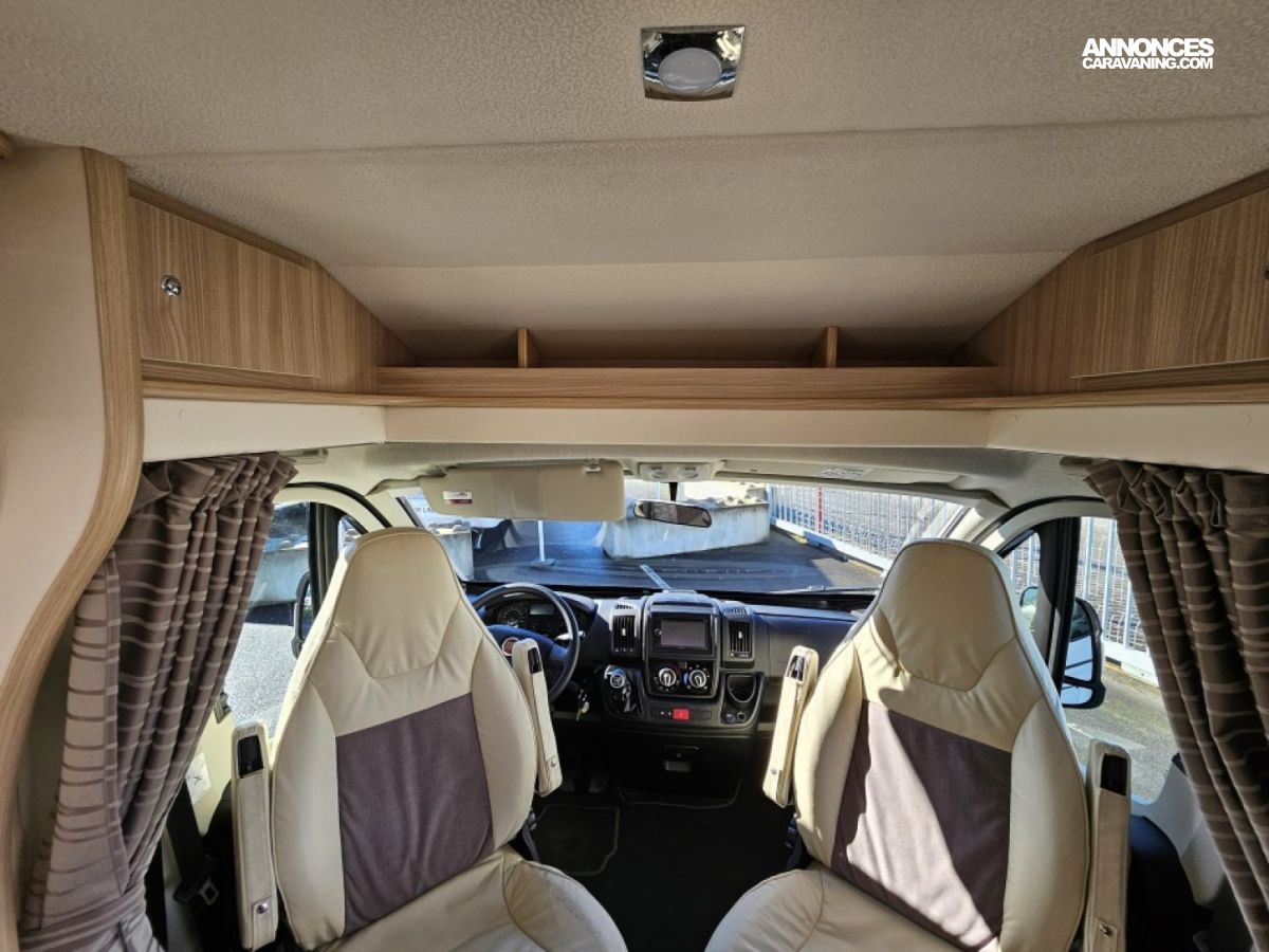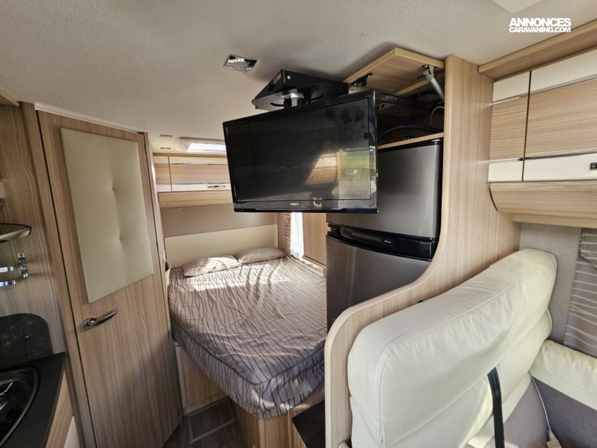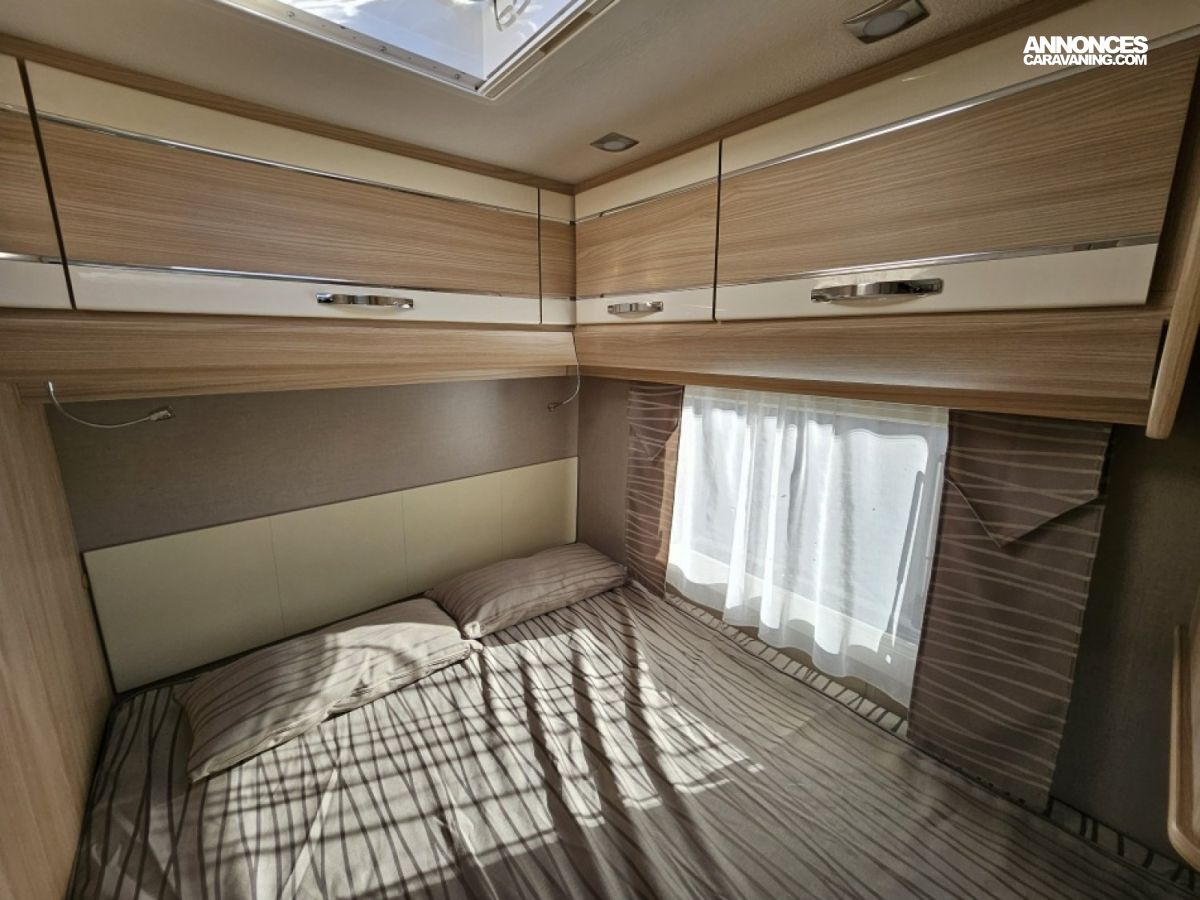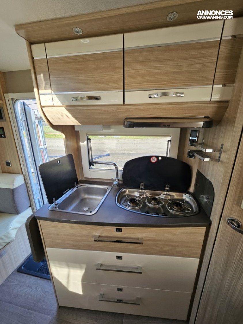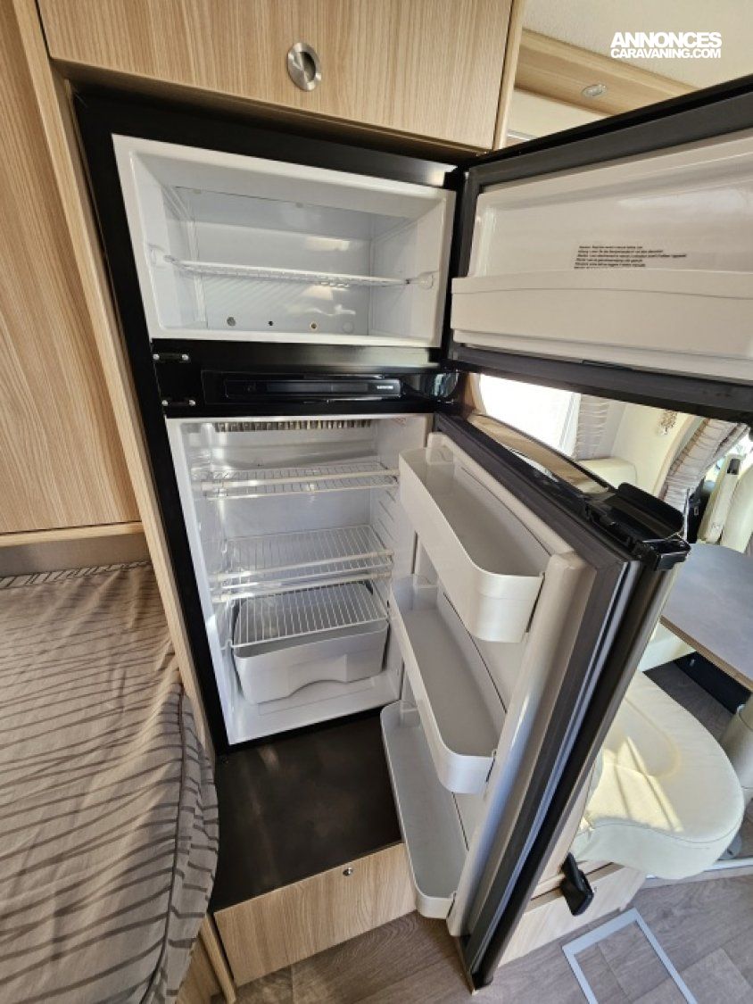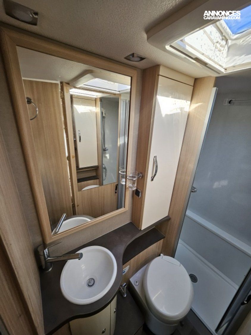 - sièges confort pivotants réglables en hauteur - poignées de meuble finition chrome – salon 4 places -soute de rangement sous lit – salle d’eau Cabine de douche séparée – réfrigérateur 145L - chauffage TRUMA - lit à la française