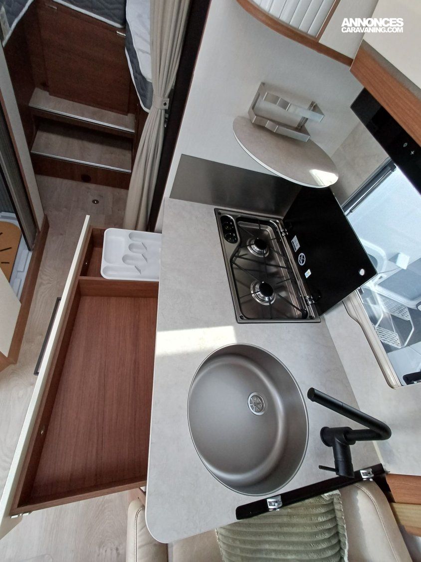 -Pack Confort: Traction +, Antibrouillards et PC peints, commandes au volant + HP, Porte cellule Hartal avec baie et moustiquaire, stores cabine, autoradio double Din, DAB+ avec kit mains libre, caméra de recul, retroviseurs ext électrique dégivrants et rabatables électriquement (sur 60 LG,64LDF,69LJG), Commande digitale Truma, HP AV, 2ème télécommande(sauf Keyless), convertisseur DC/DC 40 AH, Batterie Lithium 100 AH, transformation dinette en couchage, hotte cuisine digitale à extraction latérale, vide poche central, inverseur gaz Duo Control, matelas Evolutex, Toit décaissé.