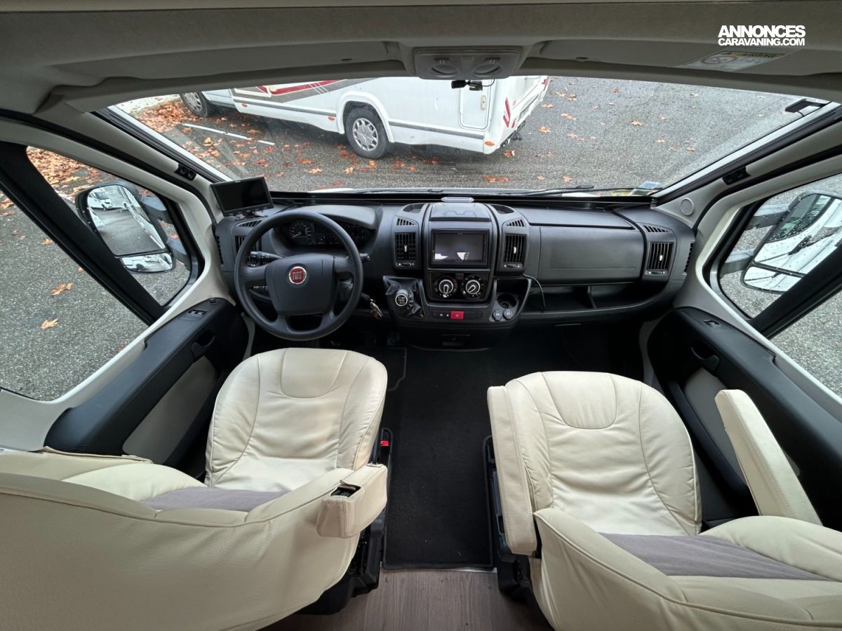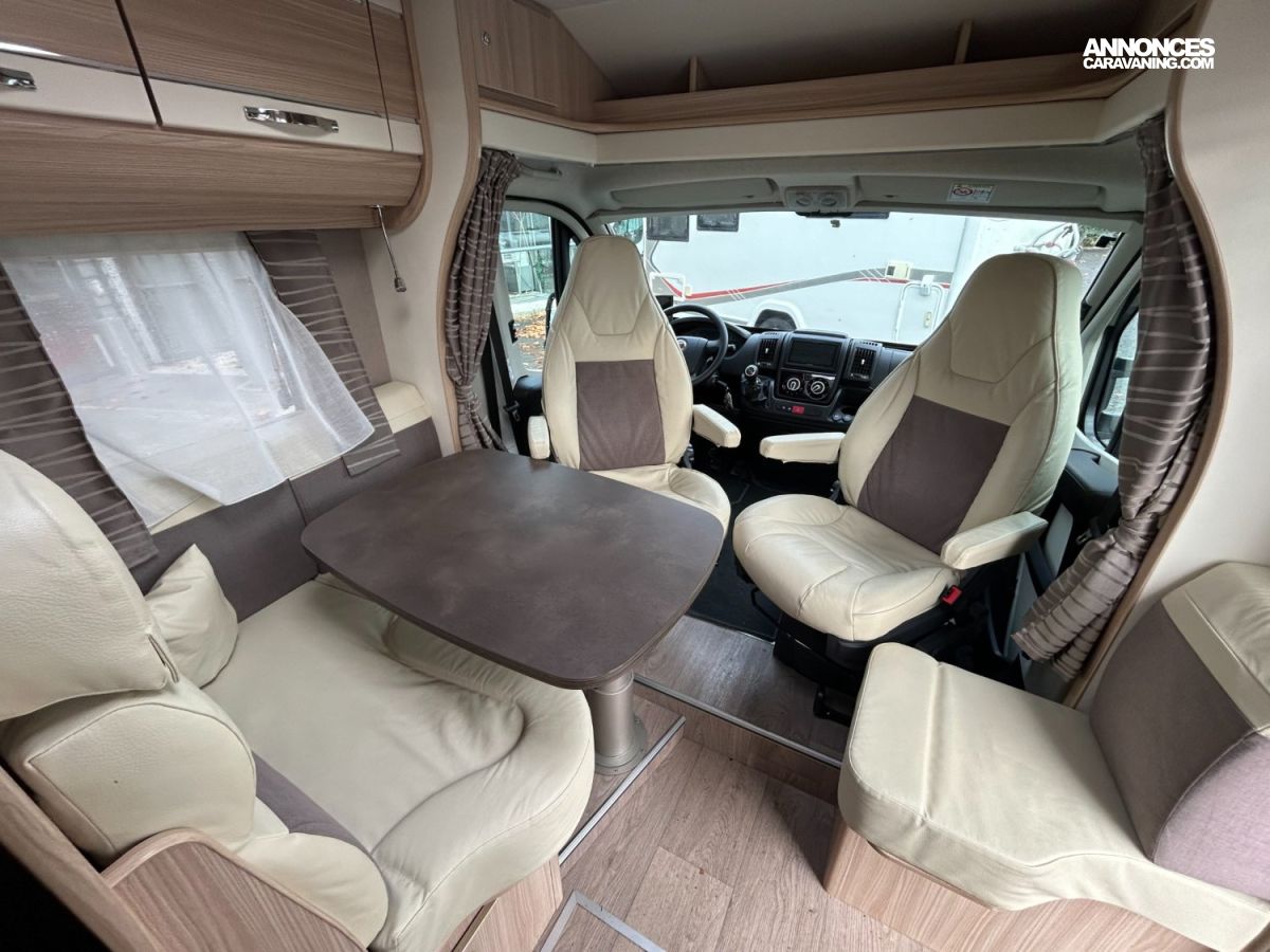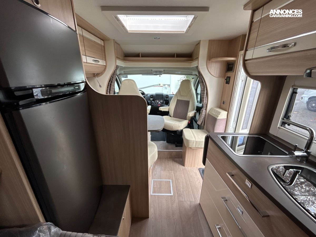 Profilé compact (5.99 m). 4 places carte grise / 3 couchages. Motorisation fiable — généralement sur base Fiat — pour des déplacements sans souci. Lit longitudinal confortable à l’arrière, salon avant spacieux avec banquette, cuisine équipée avec espace de préparation suffisant, salle d’eau avec douche séparée, frigo standard et plusieurs rangements bien répartis. Intérieur fonctionnel et chaleureux, confort correct pour les trajets et la vie à bord, idéal pour des escapades en toute simplicité à bord d’un profilé pratique.