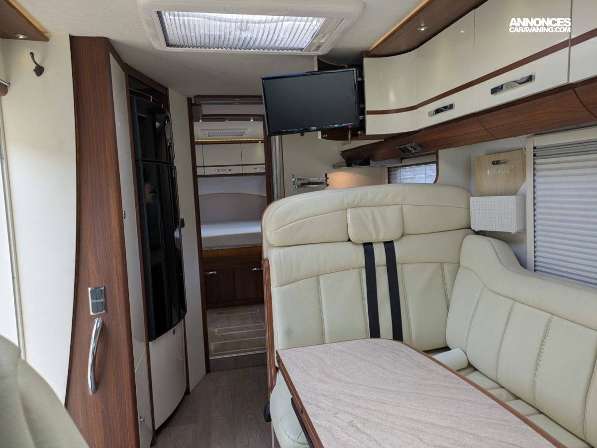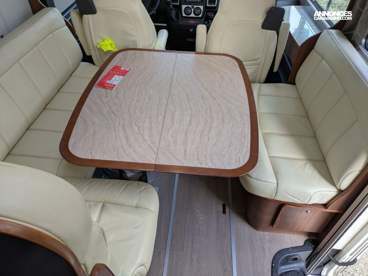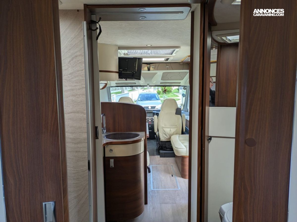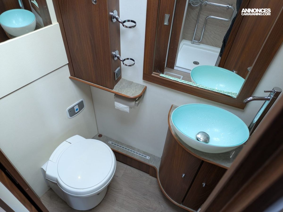 L’intérieur propose un grand salon lumineux, une cuisine fonctionnelle, une salle d’eau confortable et un couchage généreux selon l’implantation. Les rangements sont nombreux et bien répartis, permettant de voyager à deux ou en famille dans de très bonnes conditions. Le véhicule dispose d’un équipement cohérent et pratique, incluant notamment des panneaux solaires pour renforcer l’autonomie électrique.