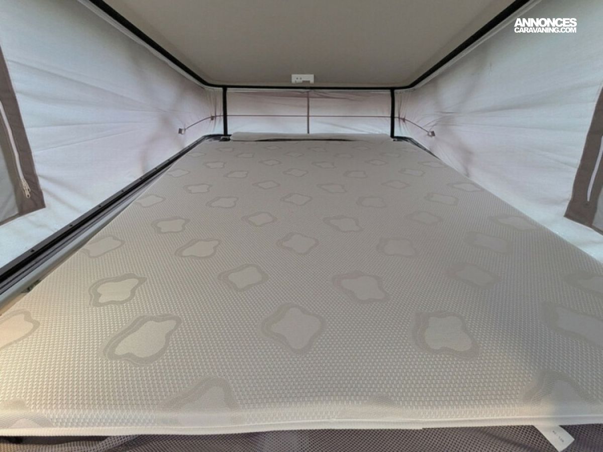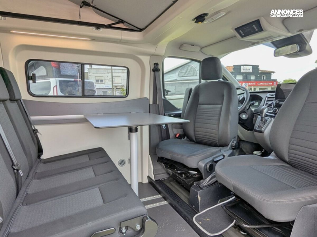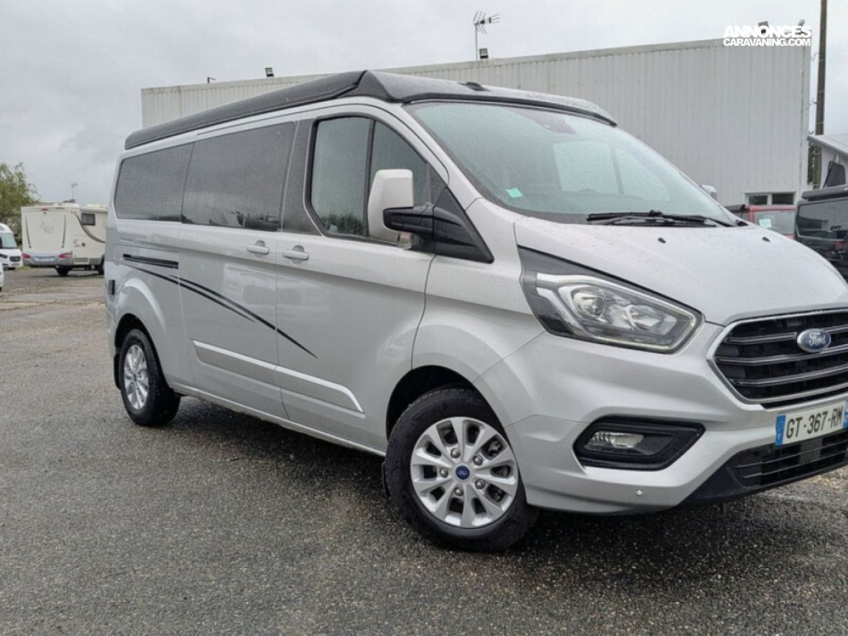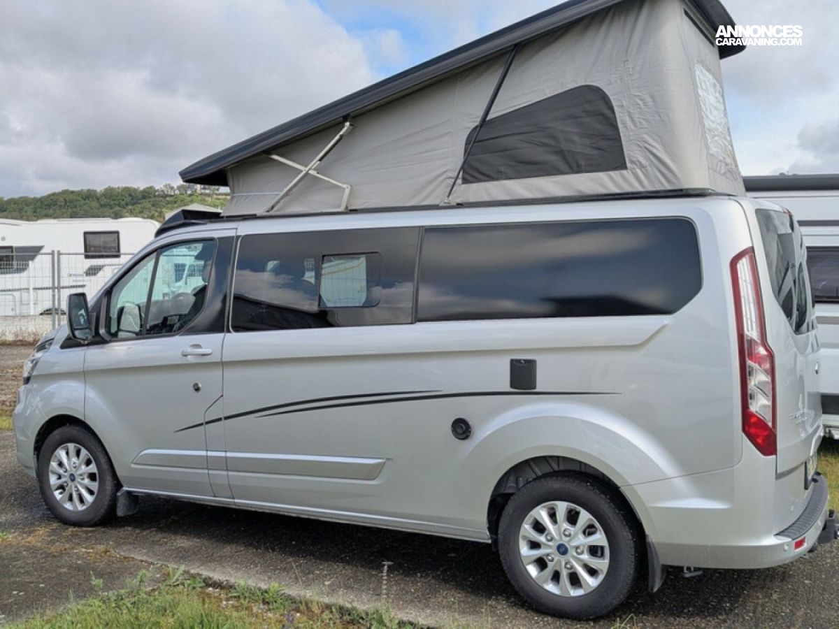Van à toit relevable en très bon état sur Transit Custom 130 cv boîte automatique avec cabinet de toilette équipé de WC fixe et lavabo, cuisine latérale arrière avec plaque de cuisson à gaz et frigo à compression et salon avant avec sièges pivotants. Le toit relevable peut accueillir deux personnes enfants ou adultes.