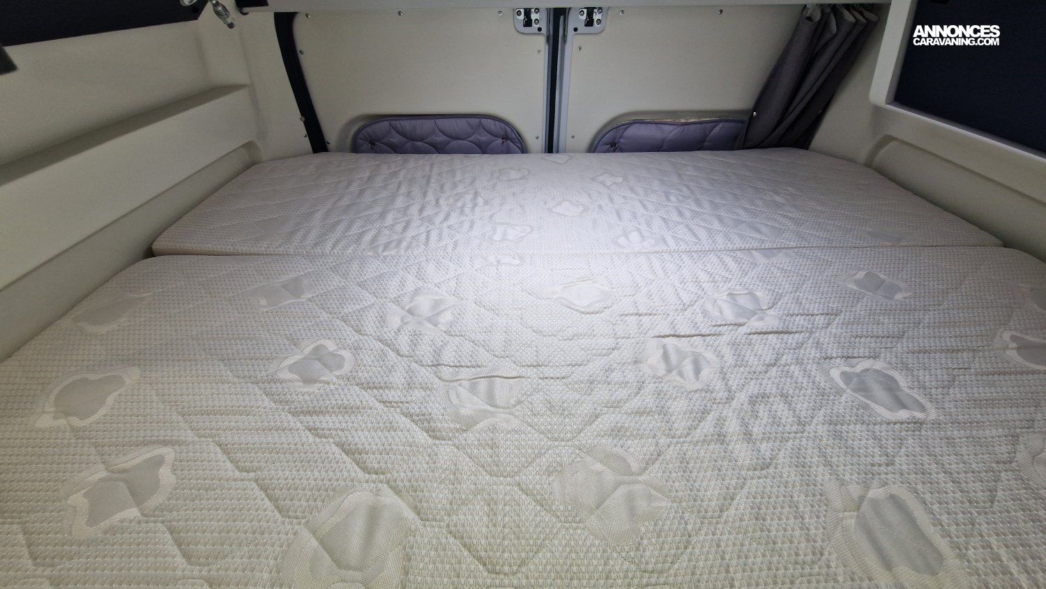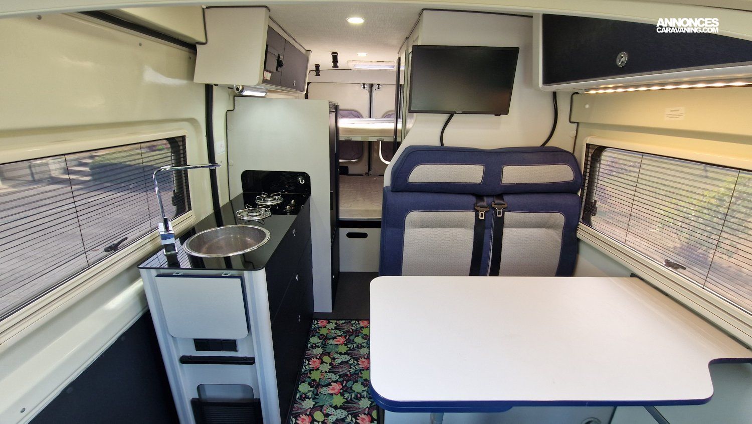 Evadez-vous sans limites et profitez d’une implantation idéale pour accueillir un couple ou toute une petite famille : modularité des couchages avec 2 grands lits superposés arrière + un lit d’appoint supplémentaire, un bloc cuisine chic & design bien équipé avec de multiples rangements, un salon attenant chaleureux et convivial.